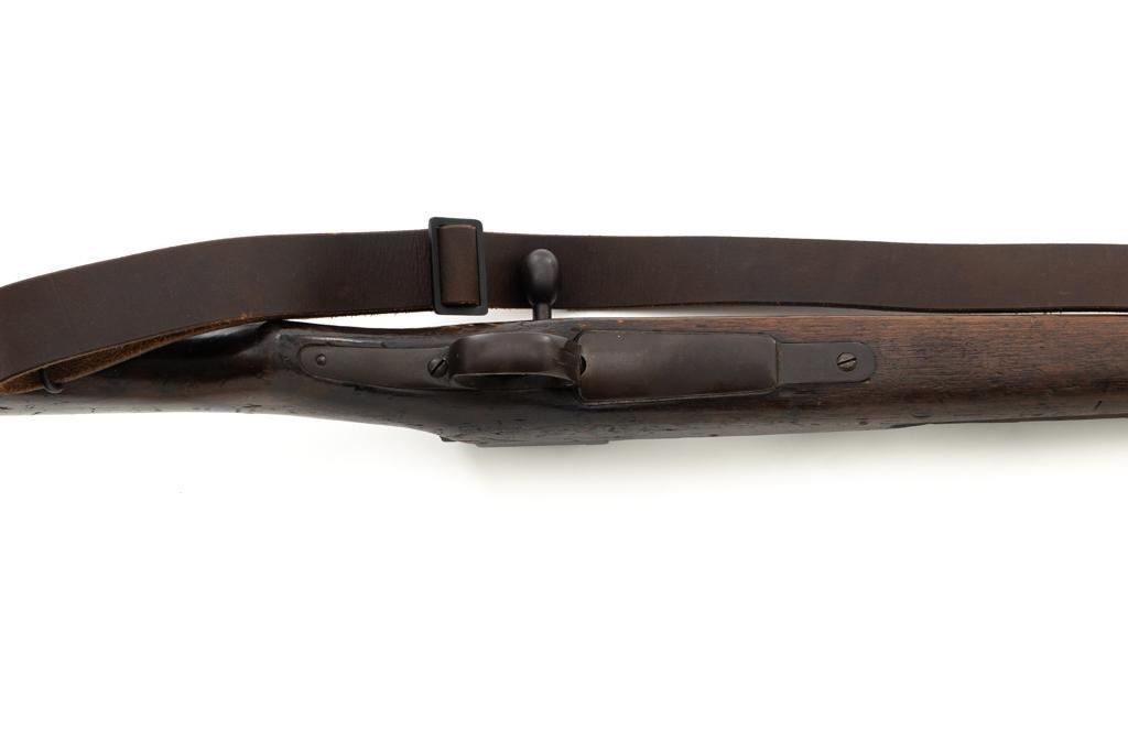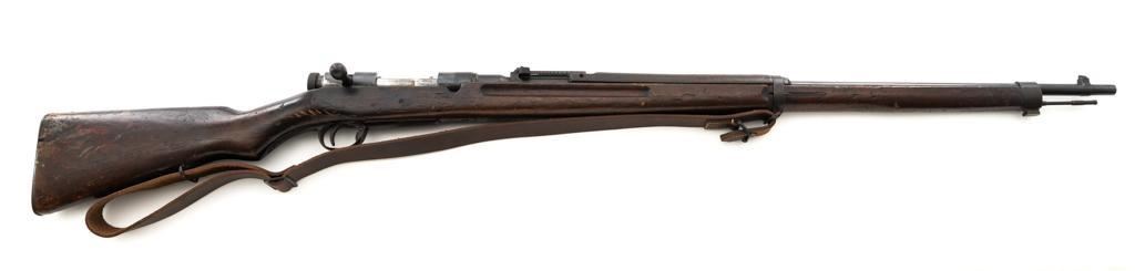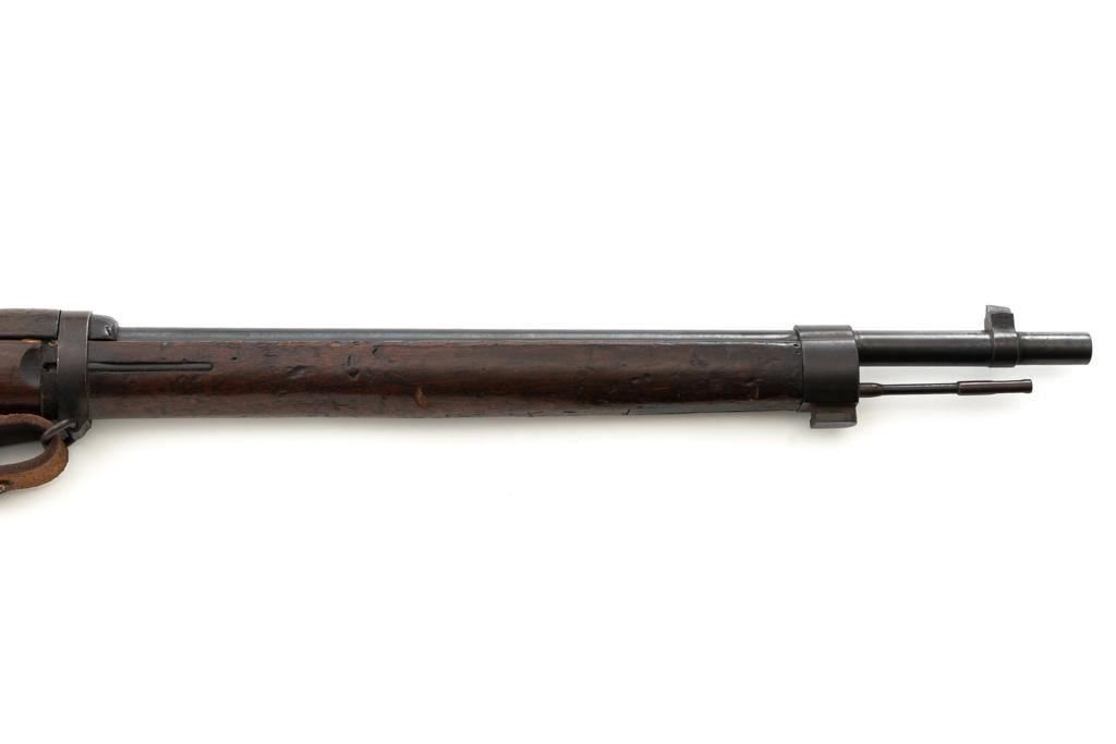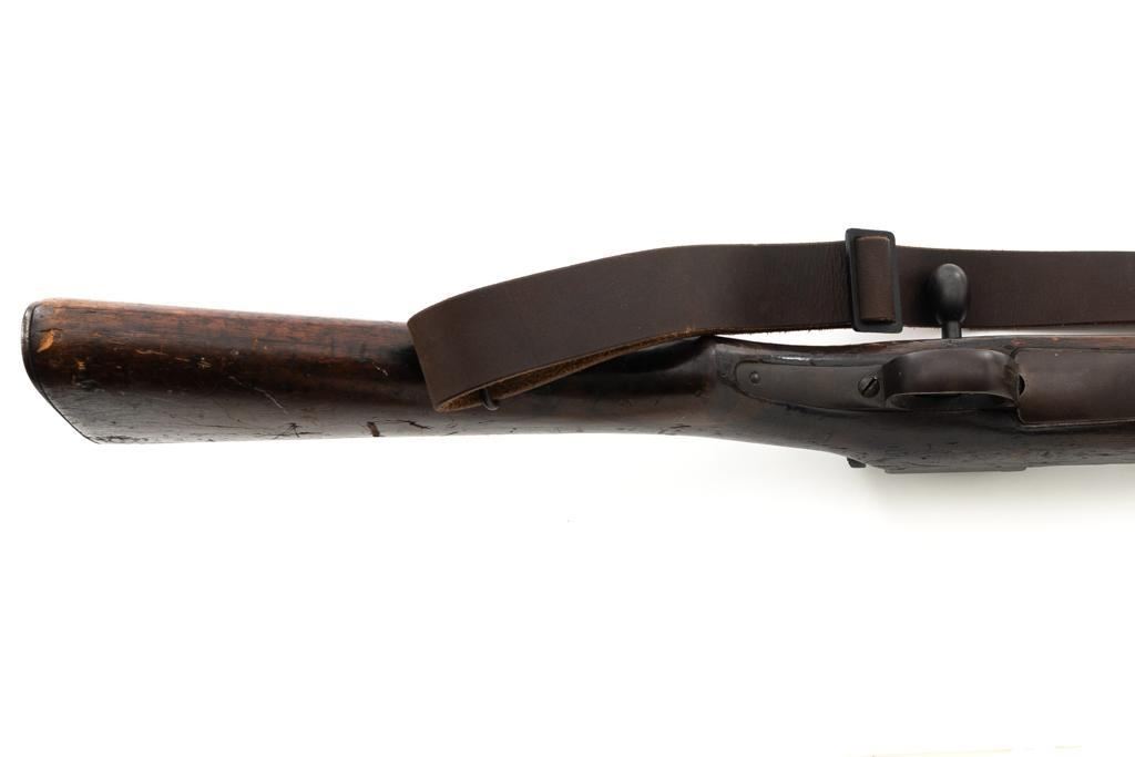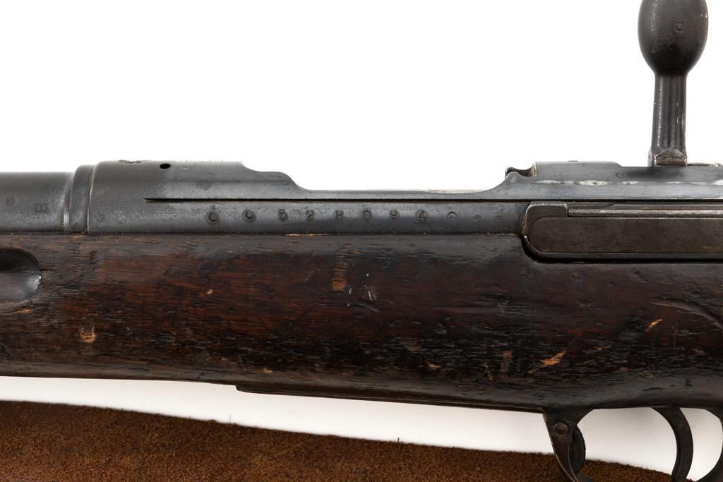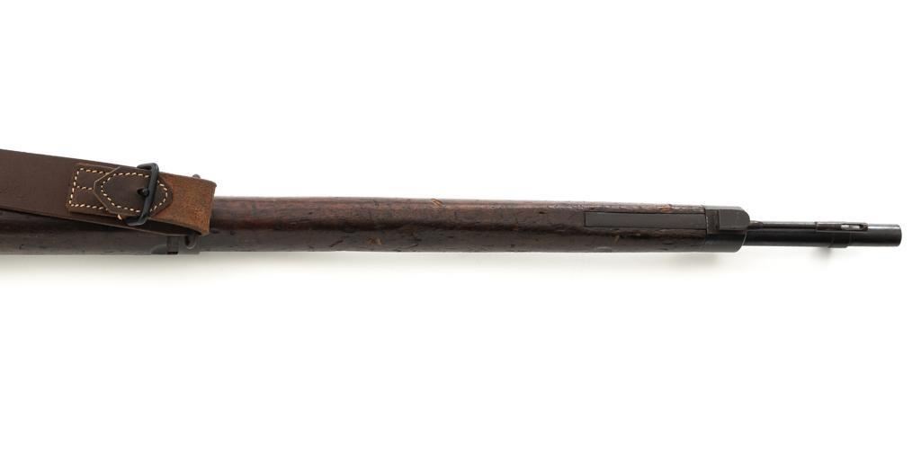 Japanese School Issued Type 38 Arisaka Bolt Action Rifle, #00528094, 6.5x50mm cal., 31.25" barrel, blued finish, hardwood stock and handguard with two-piece buttstock, dovetailed blade front sight, and adjustable folding leaf rear sight with "V"-notched groove, graduated to 2400 meters. Includes steel cleaning rod and reproduction brown leather sling. Sling is in excellent condition. Rifle was removed from Japanese military and issued to a school as a training weapon. Mum has been defaced by a ring of small circle stamps and a "school" stamp has been applied. Left side receiver rail has an addition "00" stamped in front of the serial number and the symbol for the Kokura Arsenal. There are Japanese characters stamped into right side of the buttstock. Numbers do not match. No import marks. Condition overall is good, metal toned dark, with areas of moderate frosting. Wood with general dents and scratches to the dark finish. A large "J" has been carved into left side of the buttstock, and there are small cracks to the handguard and buttstock. Action operates smoothly. Bore is dark, with fair rifling. Est.: $200-$350. (C&R)