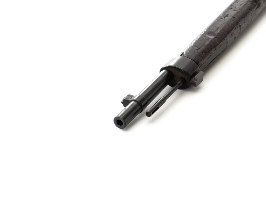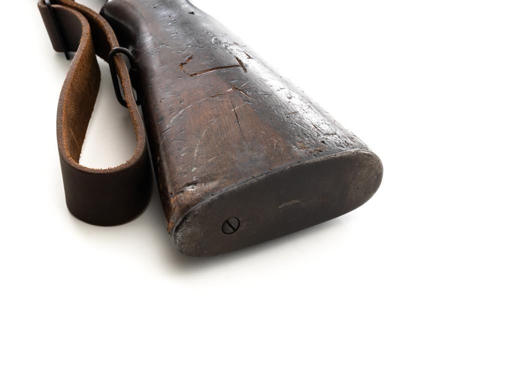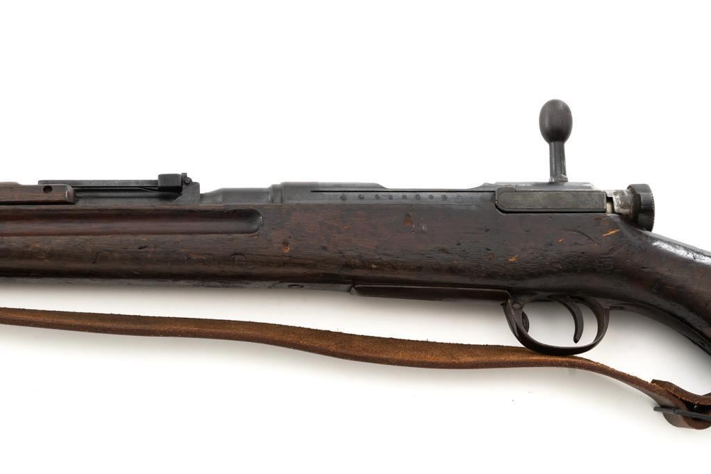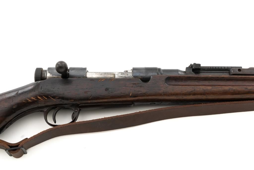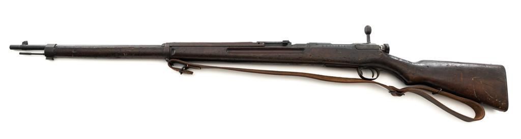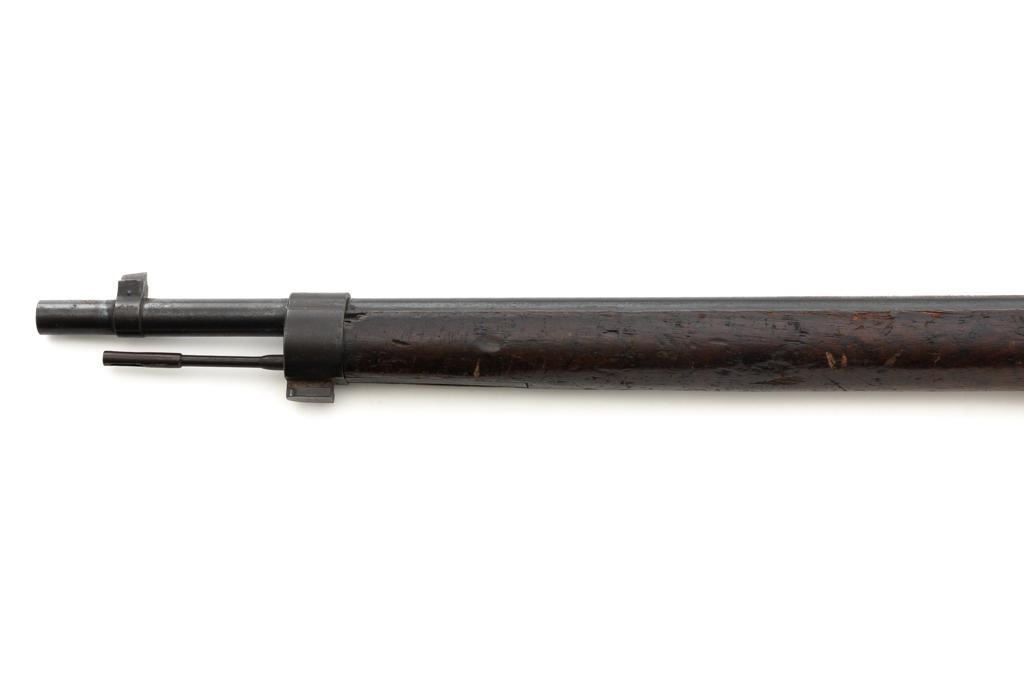 Japanese School Issued Type 38 Arisaka Bolt Action Rifle, #00528094, 6.5x50mm cal., 31.25" barrel, blued finish, hardwood stock and handguard with two-piece buttstock, dovetailed blade front sight, and adjustable folding leaf rear sight with "V"-notched groove, graduated to 2400 meters. Includes steel cleaning rod and reproduction brown leather sling. Sling is in excellent condition. Rifle was removed from Japanese military and issued to a school as a training weapon. Mum has been defaced by a ring of small circle stamps and a "school" stamp has been applied. Left side receiver rail has an addition "00" stamped in front of the serial number and the symbol for the Kokura Arsenal. There are Japanese characters stamped into right side of the buttstock. Numbers do not match. No import marks. Condition overall is good, metal toned dark, with areas of moderate frosting. Wood with general dents and scratches to the dark finish. A large "J" has been carved into left side of the buttstock, and there are small cracks to the handguard and buttstock. Action operates smoothly. Bore is dark, with fair rifling. Est.: $200-$350. (C&R)