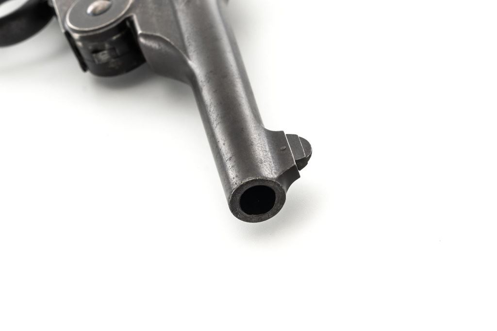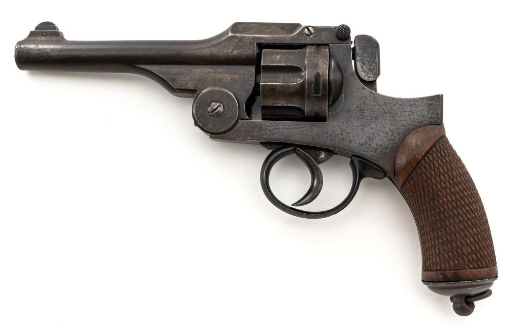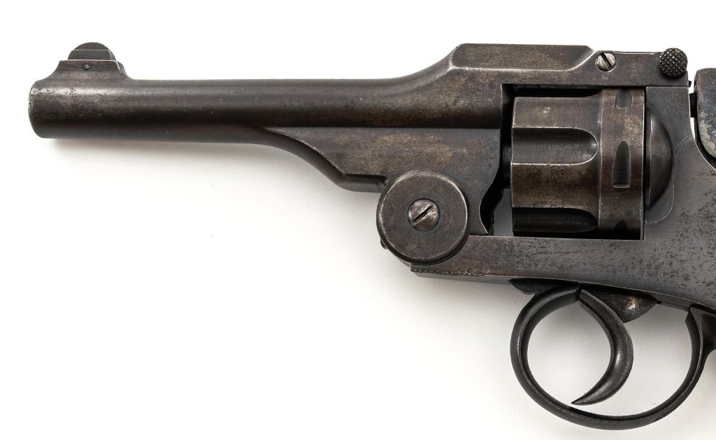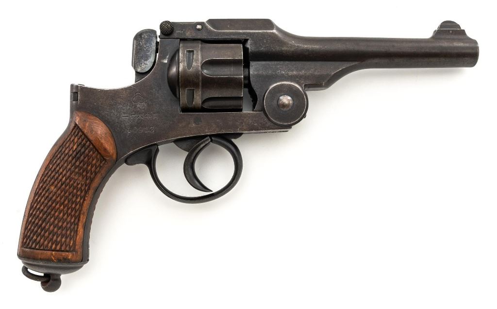 Japanese Type 26 Double Action Revolver, #40913, 9x22Rmm cal., 4.76" barrel, blued finish, checkered hardwood grips, pinned blade front sight, fixed rear sight with "U"-notched groove, and swiveling lanyard ring at bottom of the grip frame. Right side of the frame is marked with Tokyo Arsenal makers mark, over characters for "two-ten-six-year-type". Matching number on cylinder. No visible import marks. Condition overall is good, metal has mostly toned brown, with mild frosting across most the surfaces. Grips with scattered marks from handling and use. Action locks up, cycles, and ejects smoothly. Bore rates fair with a few dark areas and good rifling. Est:$300-$500. (C&R/PPT)