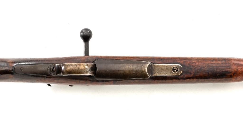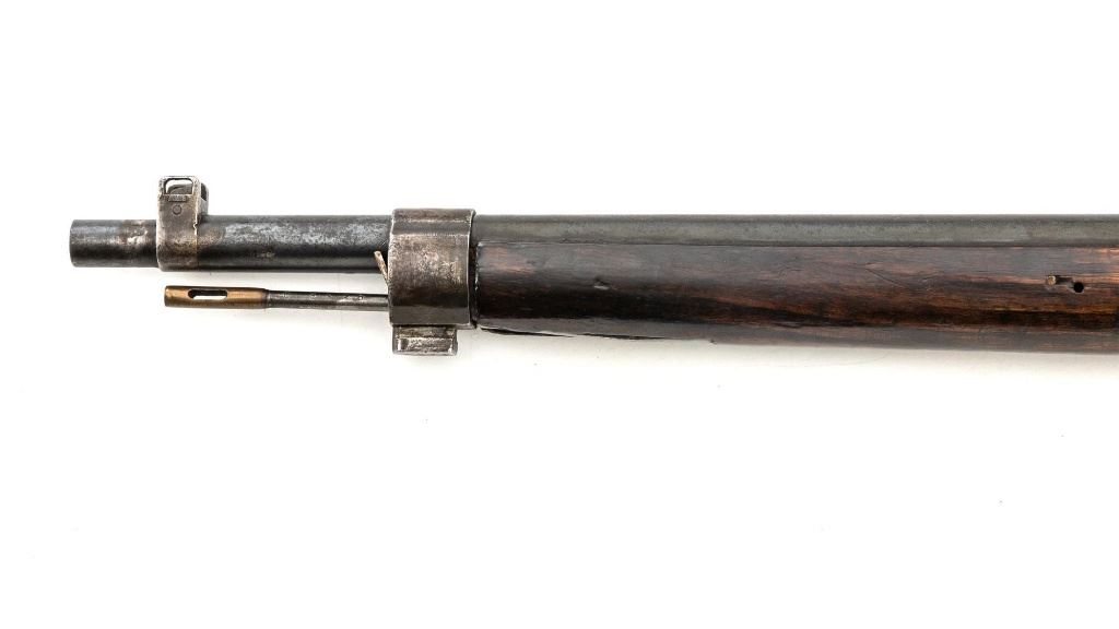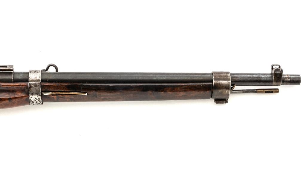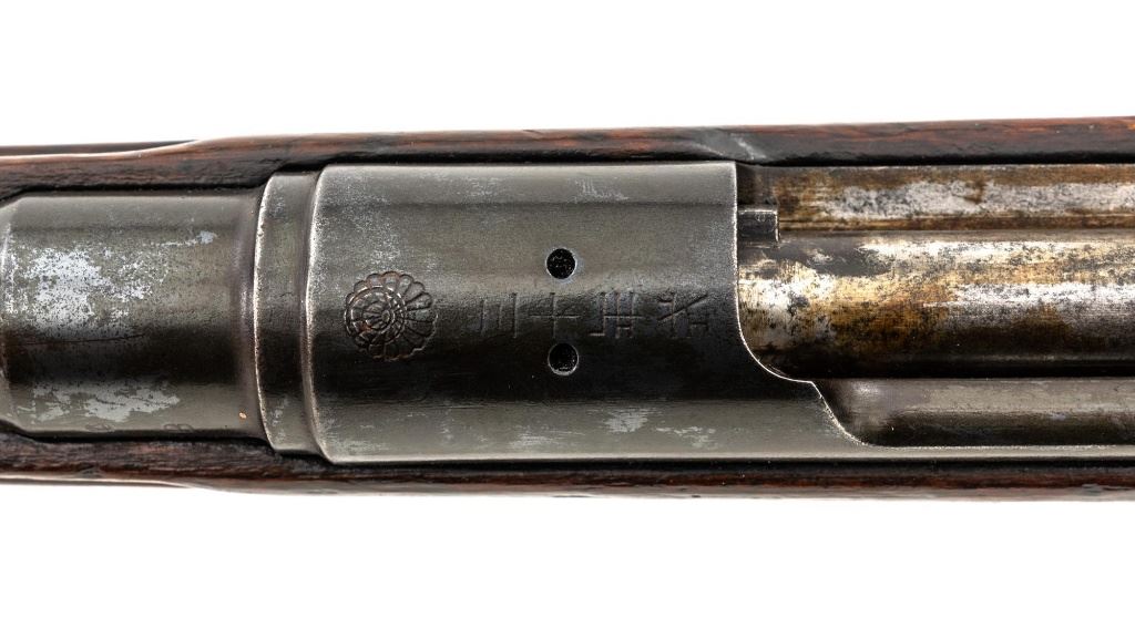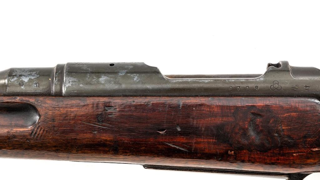 Japanese Type 30 Arisaka Bolt Action Carbine, #2729, 6.5x50mm cal., 19"barrel, blued finish, hardwood stock and handguard with two-piece buttstock, inverted-"V" front sight with protectors, adjustable folding leaf rear sight with wide "V"-notched groove, graduated to 1500 meters. Includes steel cleaning rod. Mum has been defaced with circular marks (possibly indicating removal from military service and transferred to a school for training.) over characters for "three ten type". Left side of the receiver rail is marked with Koishikawa arsenal stamp. "56" is carved into right side of the buttstock. Bolt handle and bayonet mount are numbered but do not match. No visible import marks. Condition overall is good, metal showing fine pitting to the barrel; wear to the barrel bands, bolt body, and buttplate. With areas of brown toning, especially to the trigger guard and magazine floorplate. Handguard is missing. Wood shows evidence of sanding, reshaping to underside of the buttstock. Left side of the forend has been repaired with wood putty and wood shows general marks from military use. Action operates smoothly. Bore rates fair with visible rifling. Est.: $400-$600. (C&R)