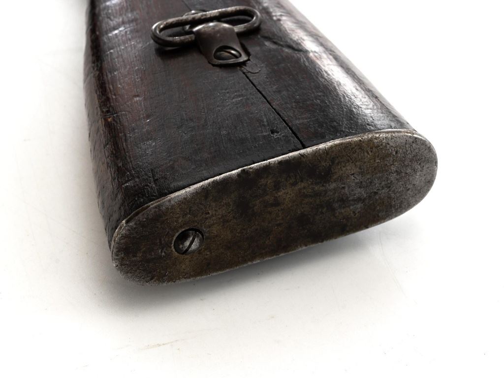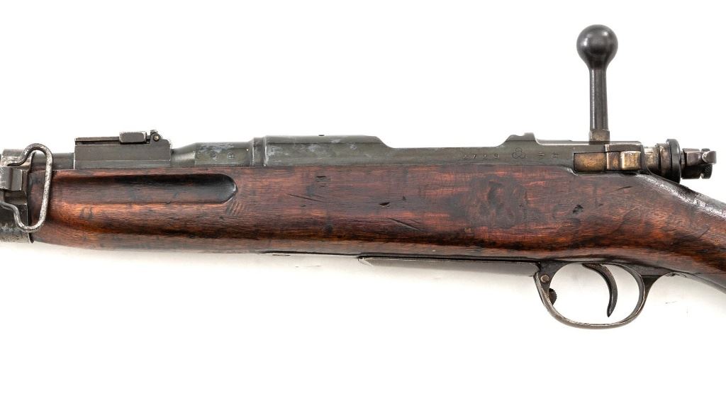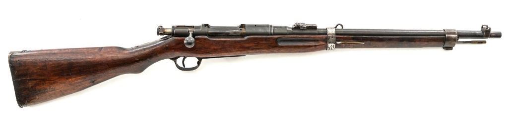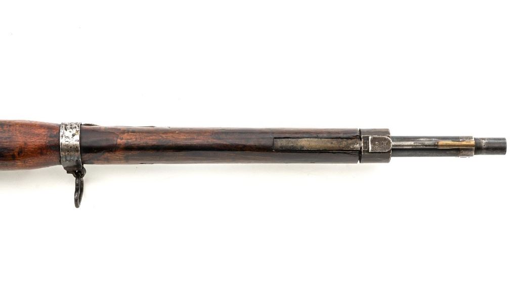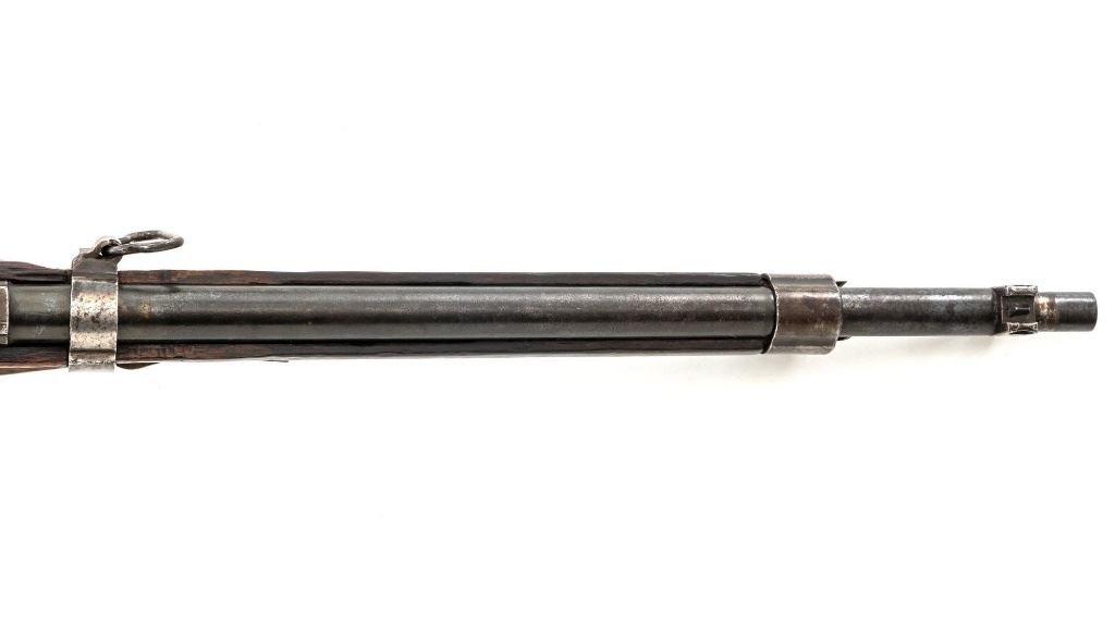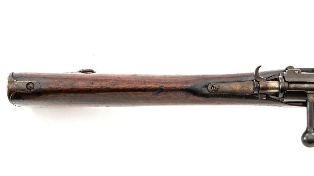 Japanese Type 30 Arisaka Bolt Action Carbine, #2729, 6.5x50mm cal., 19"barrel, blued finish, hardwood stock and handguard with two-piece buttstock, inverted-"V" front sight with protectors, adjustable folding leaf rear sight with wide "V"-notched groove, graduated to 1500 meters. Includes steel cleaning rod. Mum has been defaced with circular marks (possibly indicating removal from military service and transferred to a school for training.) over characters for "three ten type". Left side of the receiver rail is marked with Koishikawa arsenal stamp. "56" is carved into right side of the buttstock. Bolt handle and bayonet mount are numbered but do not match. No visible import marks. Condition overall is good, metal showing fine pitting to the barrel; wear to the barrel bands, bolt body, and buttplate. With areas of brown toning, especially to the trigger guard and magazine floorplate. Handguard is missing. Wood shows evidence of sanding, reshaping to underside of the buttstock. Left side of the forend has been repaired with wood putty and wood shows general marks from military use. Action operates smoothly. Bore rates fair with visible rifling. Est.: $400-$600. (C&R)