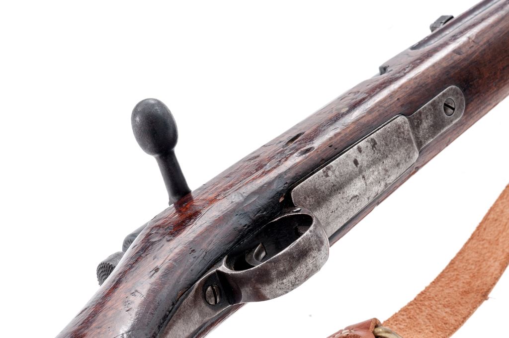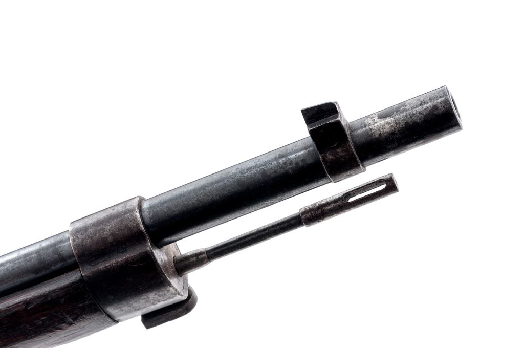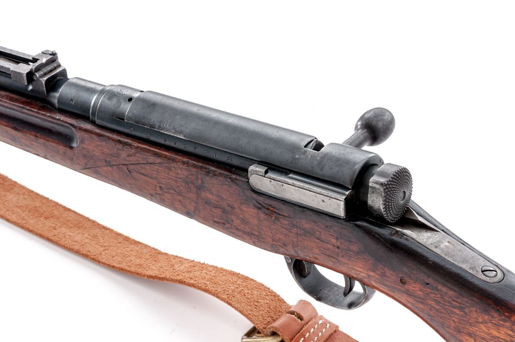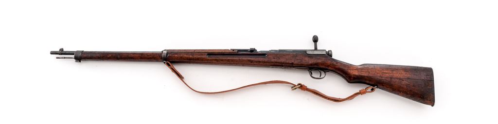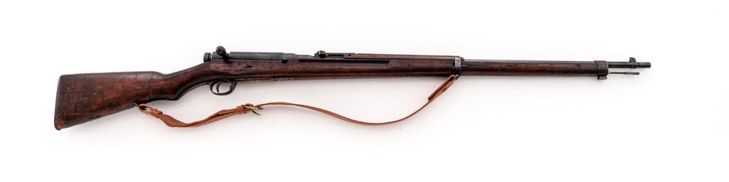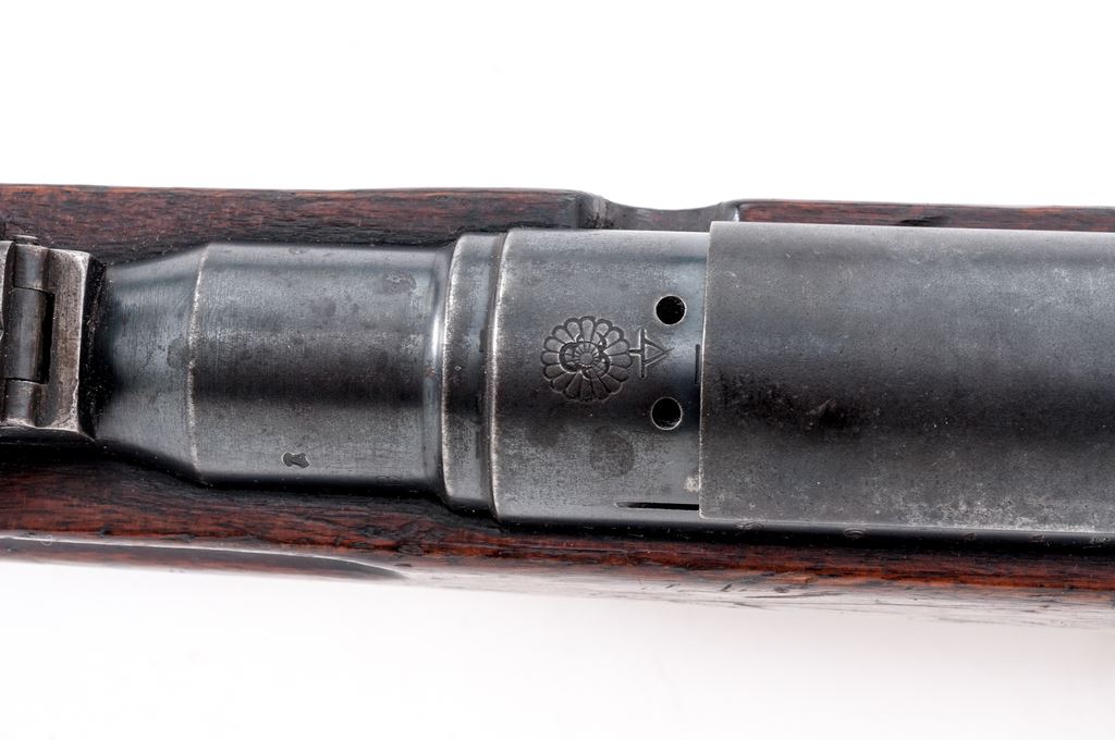 Japanese Type 38 Arisaka Bolt Action Rifle, #448356, 6.5x50mm cal., 31.25'' barrel, blued finish, two-piece hardwood stock, inverted ''V'' front sight and adjustable folding leaf rear sight, with cleaning rod and reproduction leather sling. Crest is lightly defaced with a punch over Japanese symbols for ''school'' and ''38 Type''. ''00'' stamped in front of serial number to indicate a rifle removed from service use. Kokura Arsenal symbol stamped on left side of receiver. All numbers mismatched. Bolt is fitted with dustcover. Missing buttplate screw. Condition overall is very good with metal surfaces retaining approx. 70% finish. Wood is good with darkening and overall dents and other handling marks. Action is smooth, bore is dark with good rifling. No visible import marks. Est.: $200-$350. (C&R)