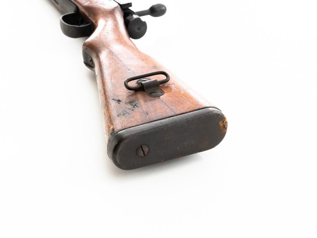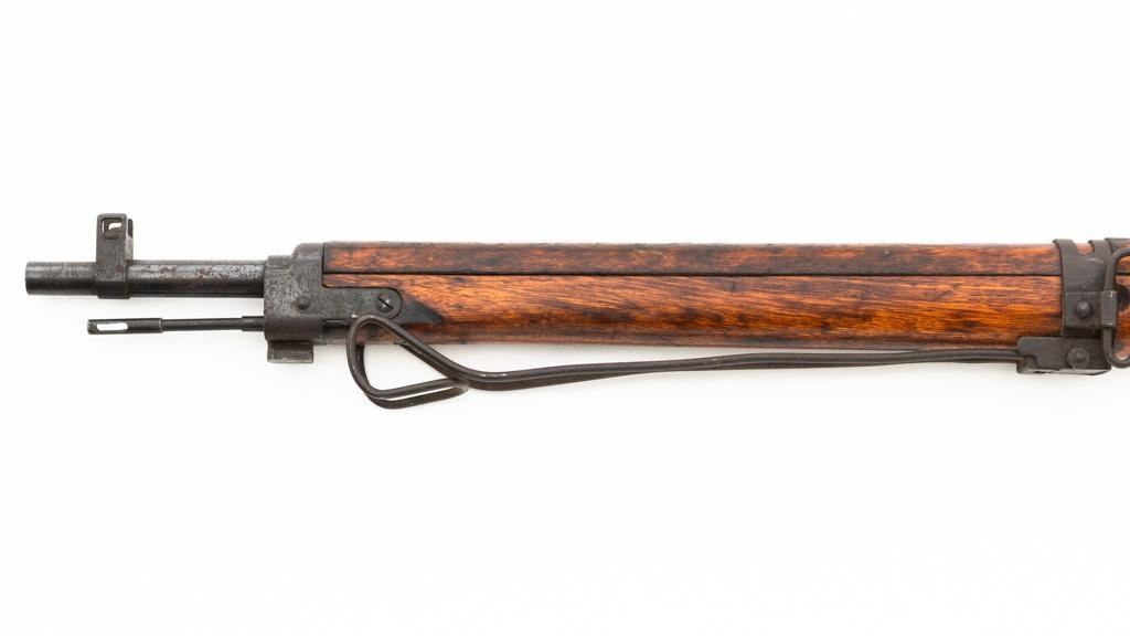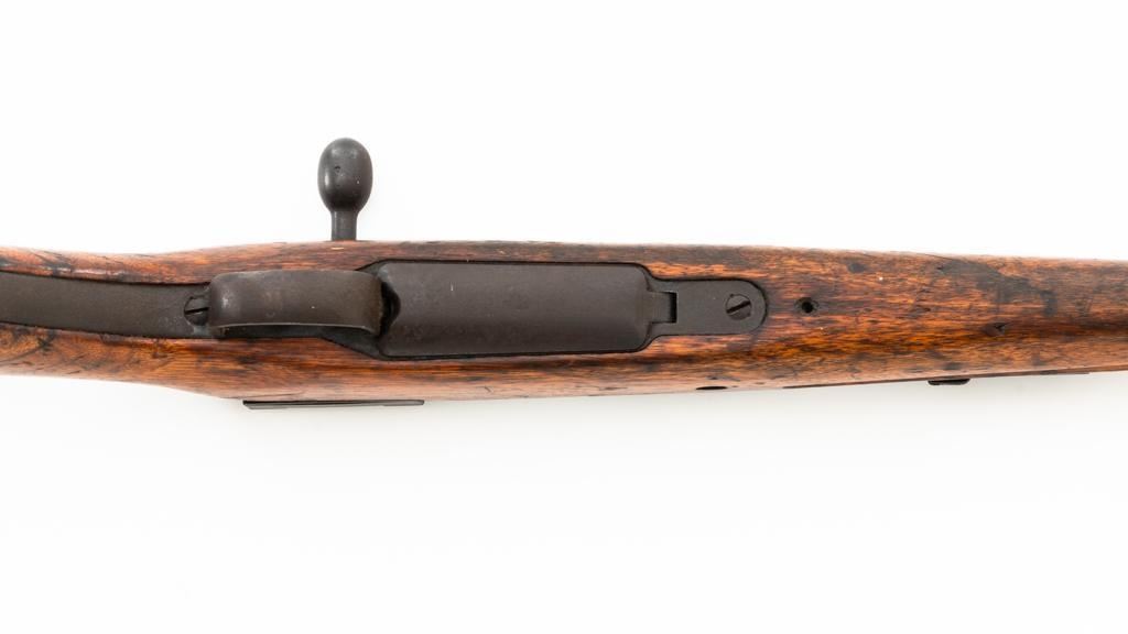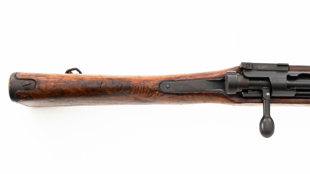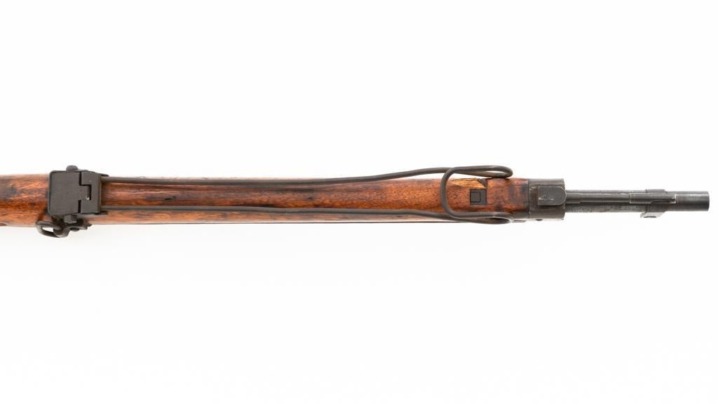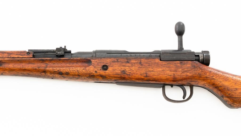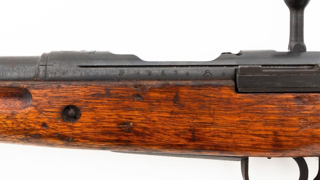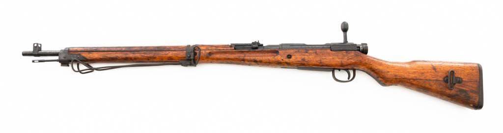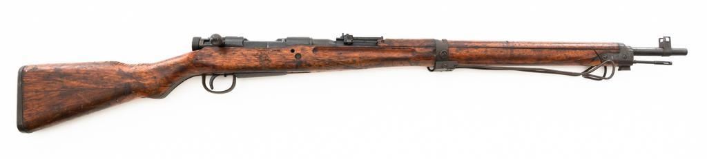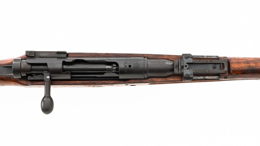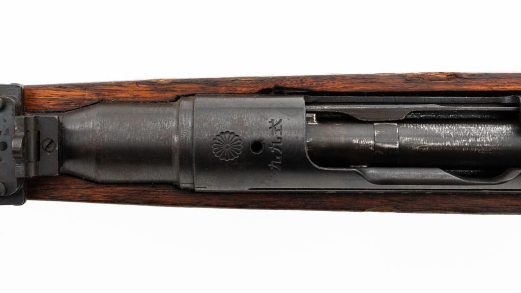 Japanese Type 99 Arisaka Bolt Action Rifle, #42574, 7.7x58mm cal., 25.5" barrel, blued finish, hardwood stock and handguard with two-piece buttstock, folding steel bi-pod, inverted-"V" front sight with protectors, and adjustable folding leaf rear sight with anti-aircraft wings, graduated to 1500 meters. Includes a steel cleaning rod. Top of receiver ring is marked with a clear Imperial Mum crest over Japanese characters for "99 Type". Left side of the receiver rail is stamped with a 22nd series mark and the symbol for the Kokura Arsenal. Matching numbers on the bolt handle and bayonet mount, no number on the extractor. No visible import marks. Condition overall is good, retaining approx. 65%-75% toning blue, with varying degrees of frosting scattered throughout. Bipod is slightly bent. Wood is in fair condition, with numerous dents and scratches. There is a gouge and chip missing from right side of the forend, and a line of notches have been cut into the comb and right side of the buttstock. Action operates smoothly. Bore is bright with very good, defined rifling. Matching numbers on bolt handle and bayonet mount, no number on extractor. No visible import marks. Est.: $300-$500. (C&R)