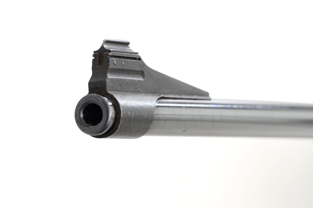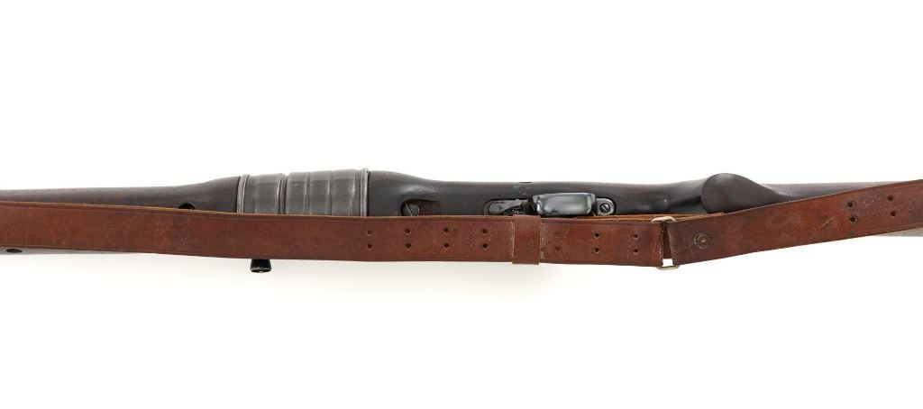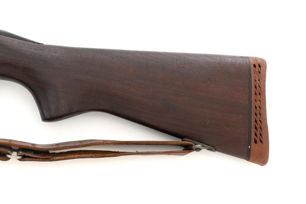 Johnson Automatics Model 1941 Semi-Automatic Rifle, #B7969, .30-06 cal., 24" barrel, parkerized with blued barrel, walnut stock, commercial front sight, and adjustable rear peep sight. A commercial leather sling is attached. Receiver is marked with "patent dates" next to "CAL. .30-06 SEMI-AUTO/"JOHNSON AUTOMATICS"/MODEL OF 1941/MADE IN PROVIDENCE R.I. U.S.A./B7969" / "CRANSTON/ARMS/CO." in a triangle on the right side. Top of the barrel is stamped "30-06". Rifle is in very good+ overall condition. Barrel has a commercial front sight and was blued, and retains most of its finish. Approx. 75%- 80% parkerized finish remains, showing general thinning and toning, with light patina to the magazine shroud. Trigger guard was also blued. Stock is in very good condition, showing normal light use, but the steel buttplate was replaced with a rubber recoil pad. Action works properly, but the bolt hold does not work, which is a common problem with Johnson rifles. Bore and rifling are good with light frosting. Est.: $3,000-$4,000. (C&R)