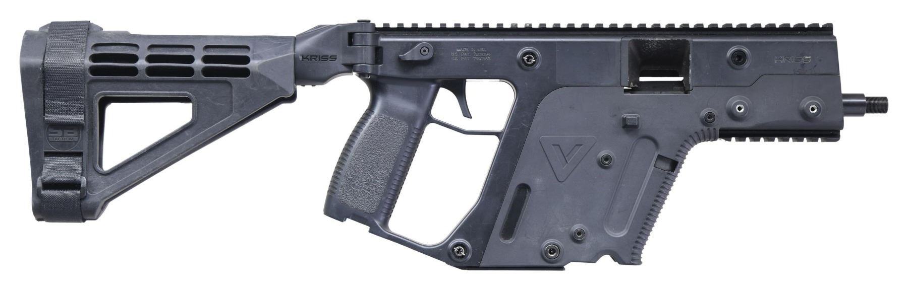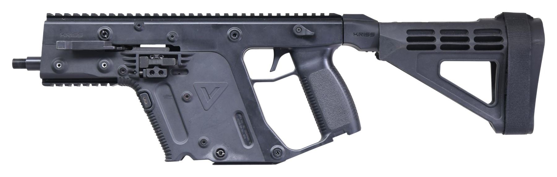 BRACE. Cal. 9MM. S# 919P004914. Bbl. 5.5". In the last 100 years, there have been very few substantial changes in relation to modern ammunition & operating systems. Almost every firearm manufactured today, be it a sporting gun or military gun, can trace its lineage back to the first half of the 20th Century. The Kriss Vector represents a change in direction & is a great example of current ingenuity. The Kriss Vector design is unique in the manner in which it captures energy through their proprietary delayed blowback system greatly taming recoil. This is one version of the original SMG design first introduced by Transformational Defense Industries (TDI). This example is an SDP model, a pistol w/ a fixed brace & a 5.5" bbl. Left side non reciprocating charging handle w/ mag. release to the front of the mag. well. Bolt release is located on the left side, opposite of the ejection port. Top mounted 13" picatinny rail for mounting options. Ambidextrous thumb safety. Muzzle end of barrel threaded 1/2x28. Matte black finish on all exposed metal surfaces. The 9mm Kriss Vector platform utilizes standard Glock Model 17 magazines. UNATTACHED ACCESSORIES: Black plastic hard case & paperwork. CONDITION: Finish complete & consistent w/ a little high spot thinning. Prior usage is most noticeable in areas of mechanical intervention. Bright bore w/ strong rifling & evidence of a moderate ring, located 1/3 of barrel ahead of chamber. Fire control mechanism appears to function correctly when cycled by hand. (25-2136/JZ). MODERN. $400-600.