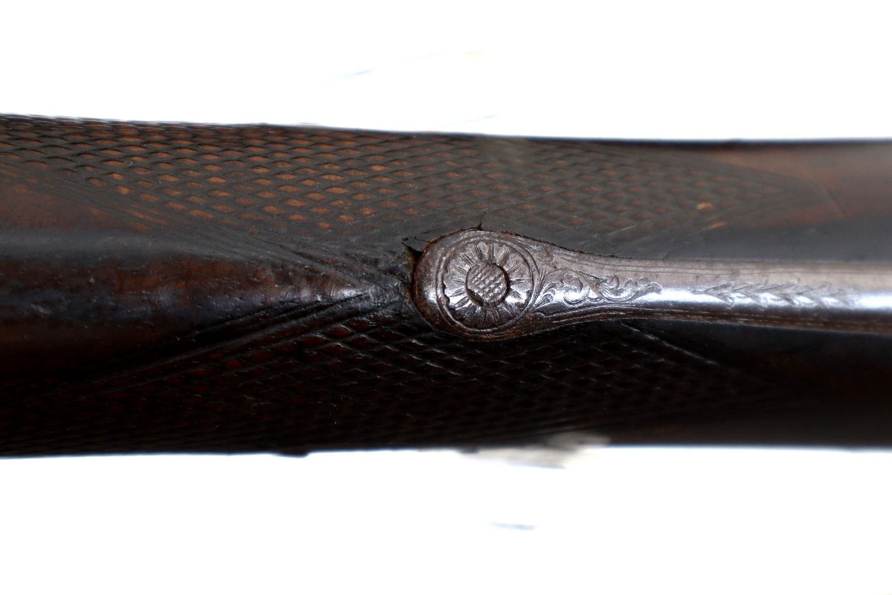 Main Description: Brass bead, Damacus barrels with smooth rib, engraved receiver and back action locks with left side spur hammer that functions, missing right hammer and screw, double triggers. Two piece wood stocks, checkered forearm with single wedge missing tip insert, checkered straight grip cracked behind receiver and upper tang, smooth steel butt plate, plate is dented stock is chipped at toe.