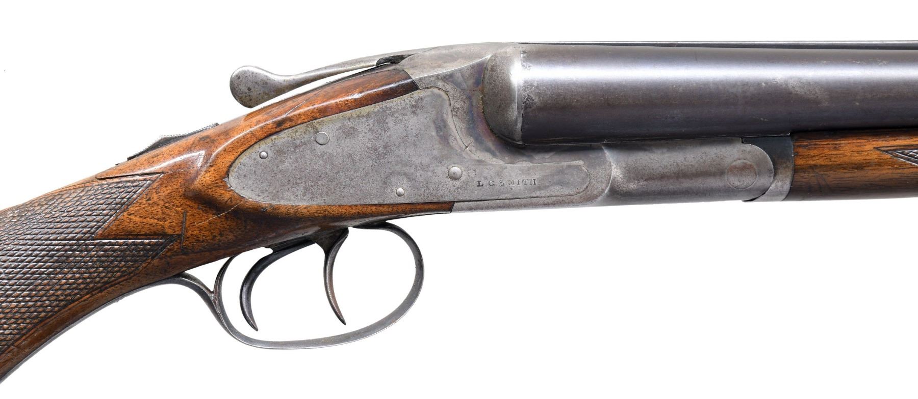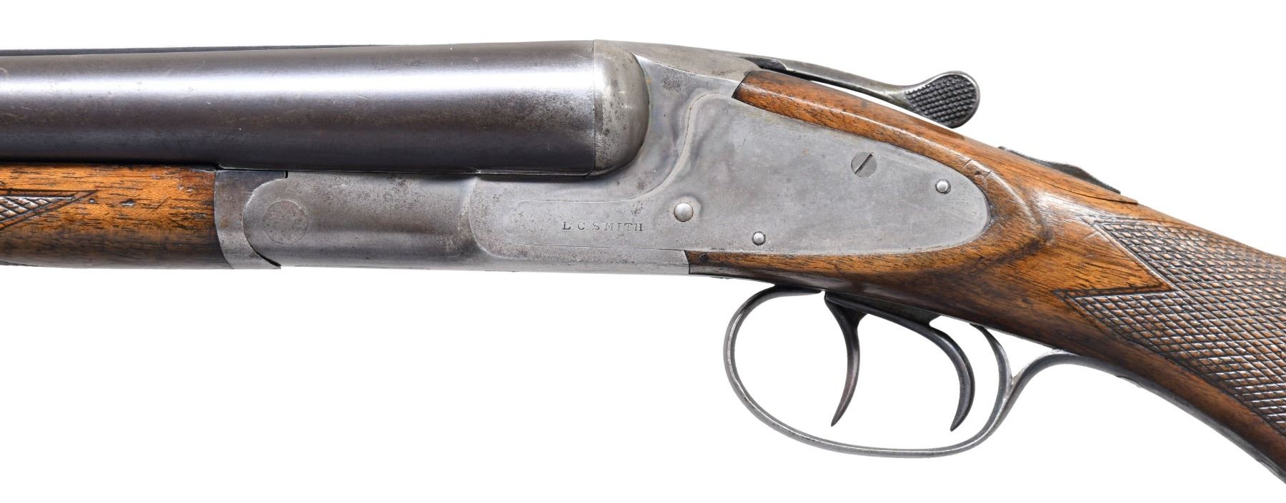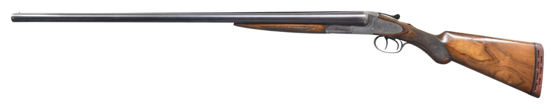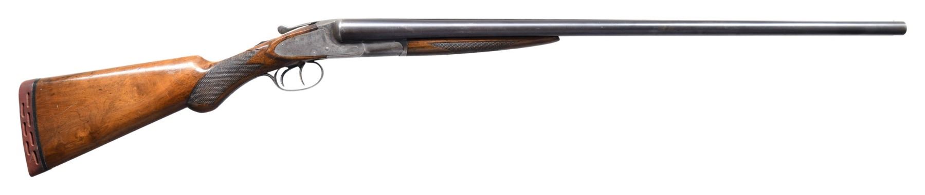 Cal. 12 Ga., 2 3/4". S# 327332 (1909). The Armor Steel 30" barrels have brass bead & "Hunter Arms Co. / Fulton, New York" address on matted rib. Full & Mod chokes. Boxlock action with double triggers, extractors & auto-safety. Walnut stock set: splinter checkered forearm with matching numbered iron & checkered rnd. knob pistol grip buttstock. LOP: stock cut to 13 3/4" over Jostam red pad. CONDITION: fair blue mixing with brown patina showing marks, sm. dents & scratches. Case colors visible in protected areas with balance having a gray patina appearance with peppery oxidation. Fair triggerguard blue silvering in carry ears with marks & oxidation. Sanded & refinished wood shows cracks & marks. Bores show fouling & pitting. (25-1460/MD). MODERN. $400-600.