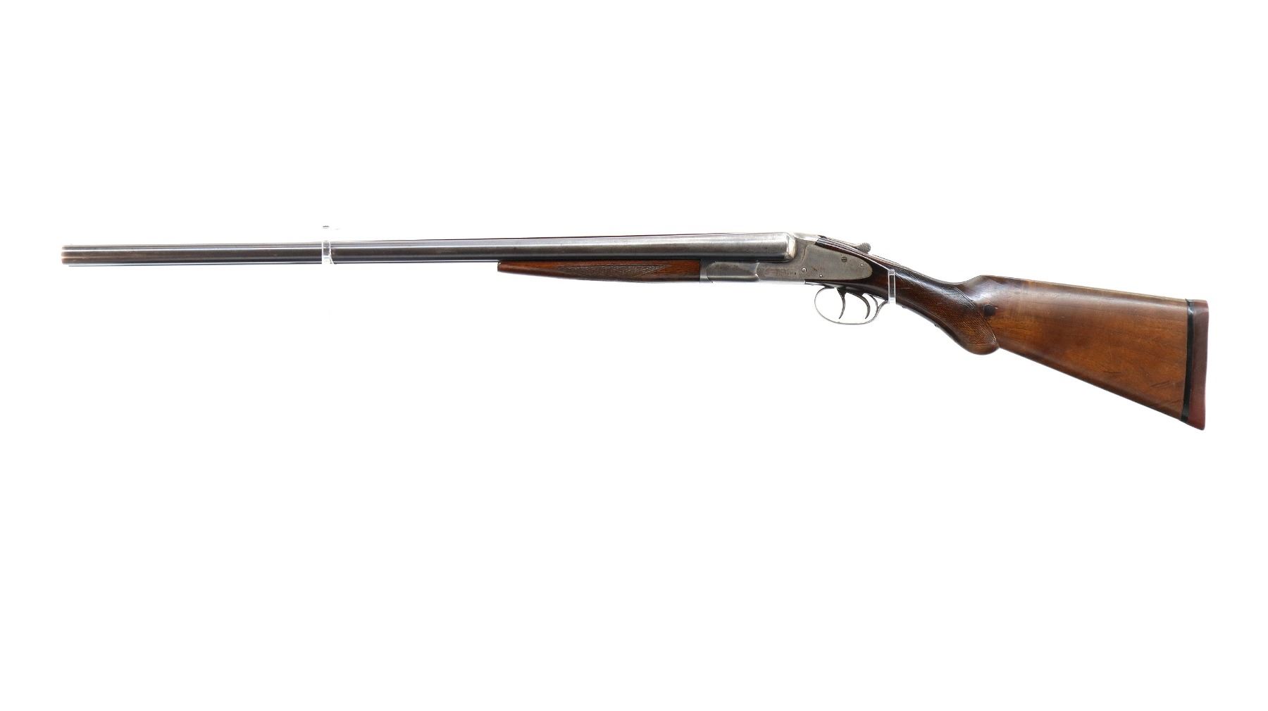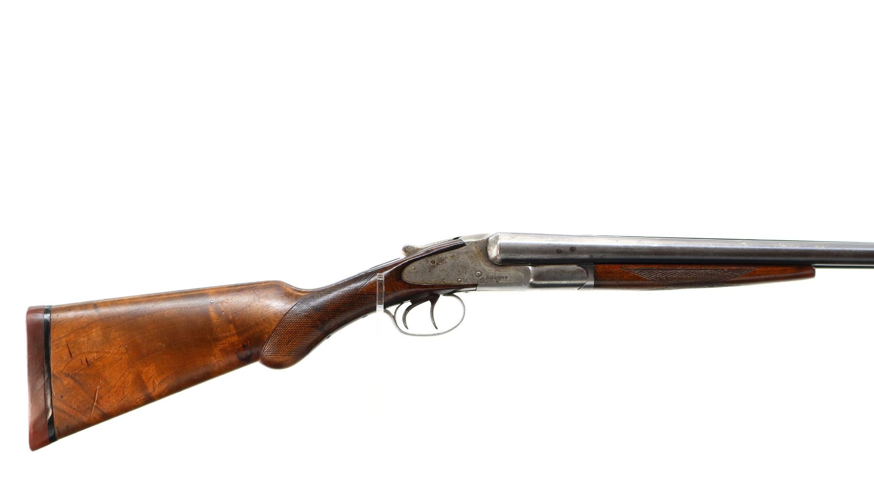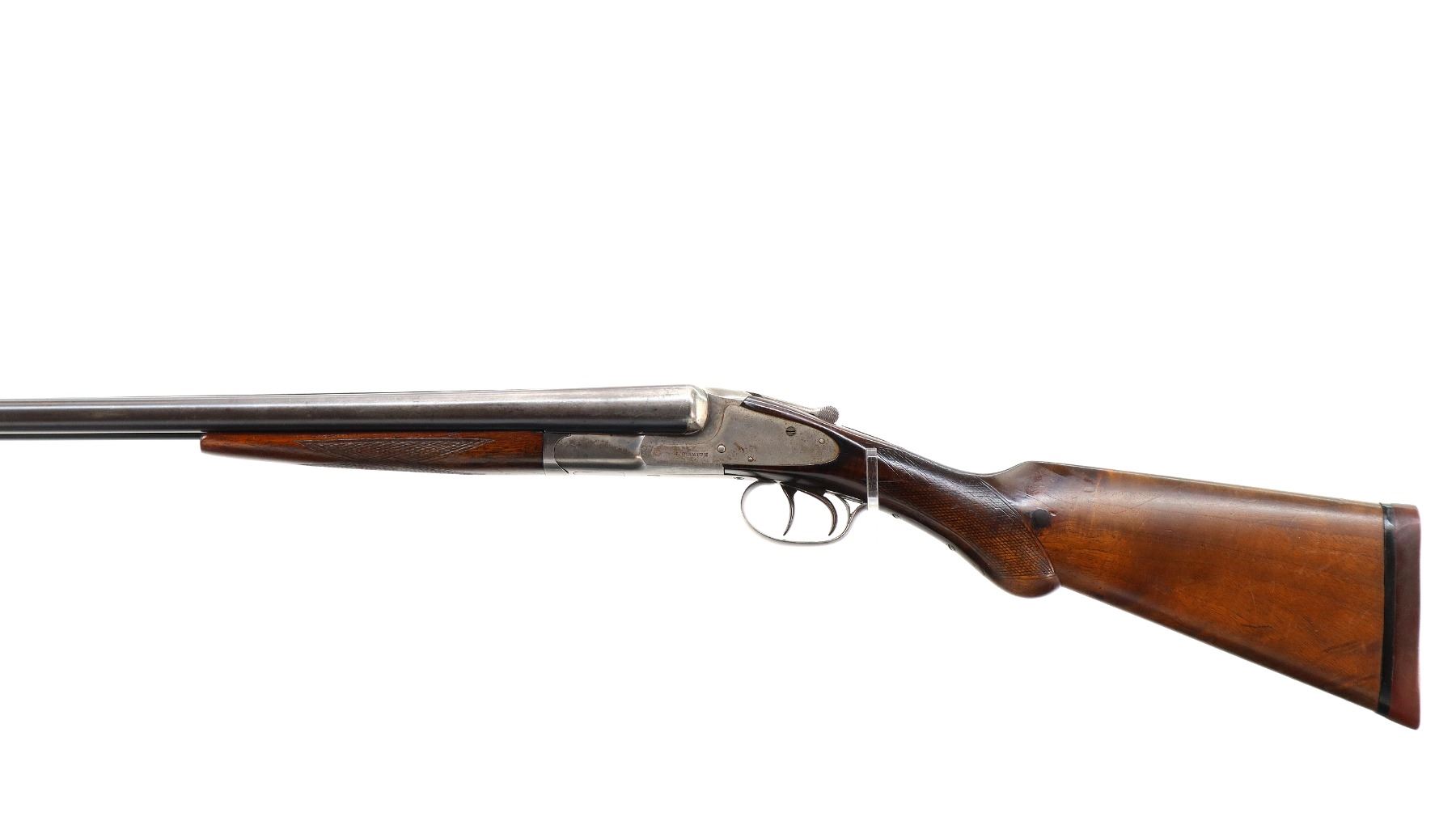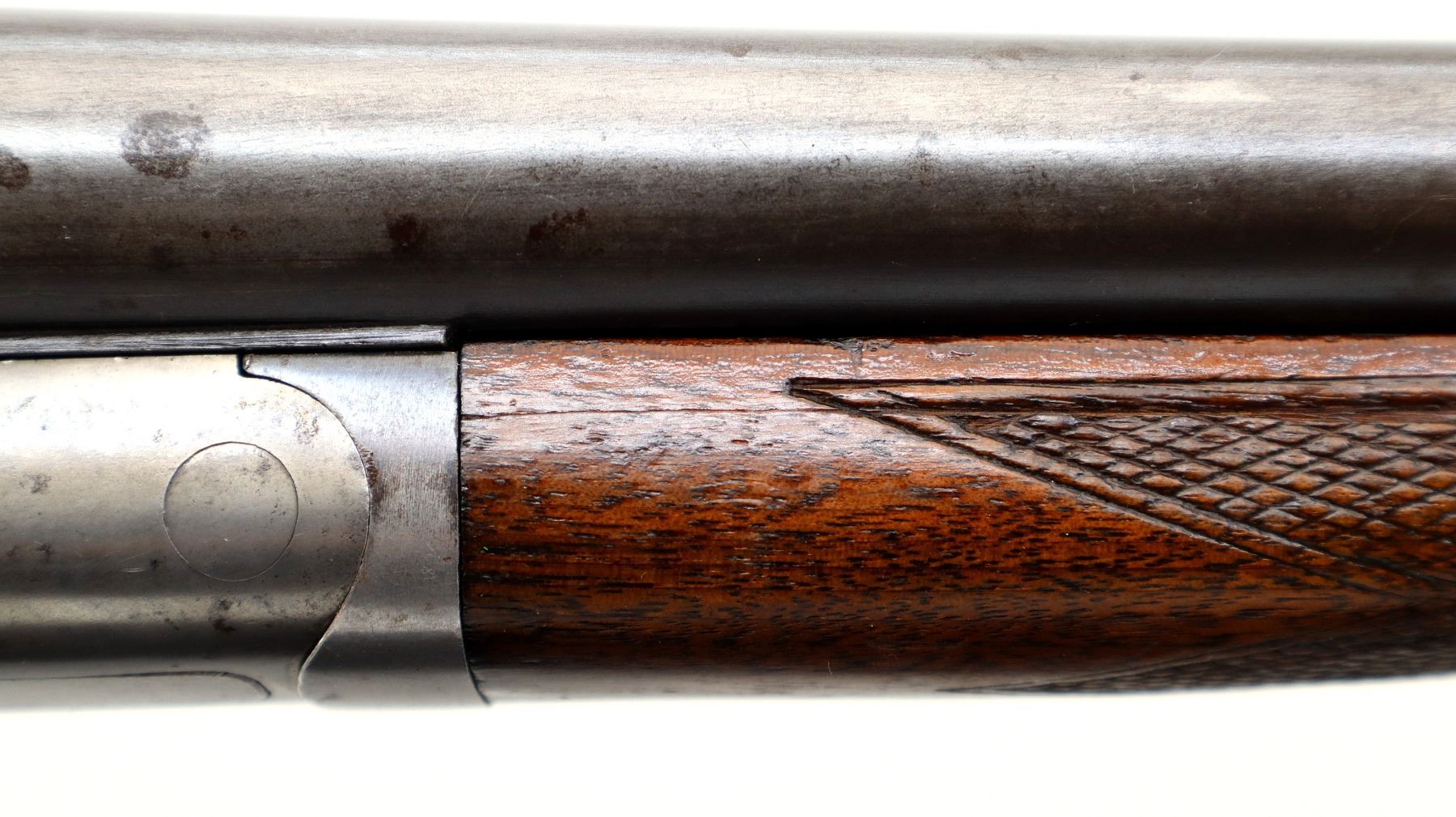 Main Description: Brass bead, blued finish, raised rib on barrels that chime and are tight on face, automatic safety, extractor, side locks, double triggers. Two piece wood stocks, checkered splinter forearm and pistol grip, small chips behind upper tang, small crack behind left side lock. Red rubber recoil pad, 14.25" LOP.