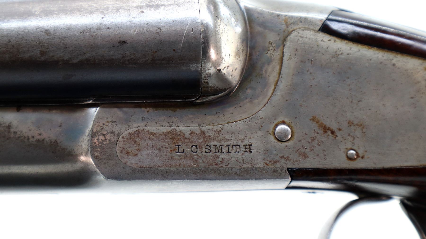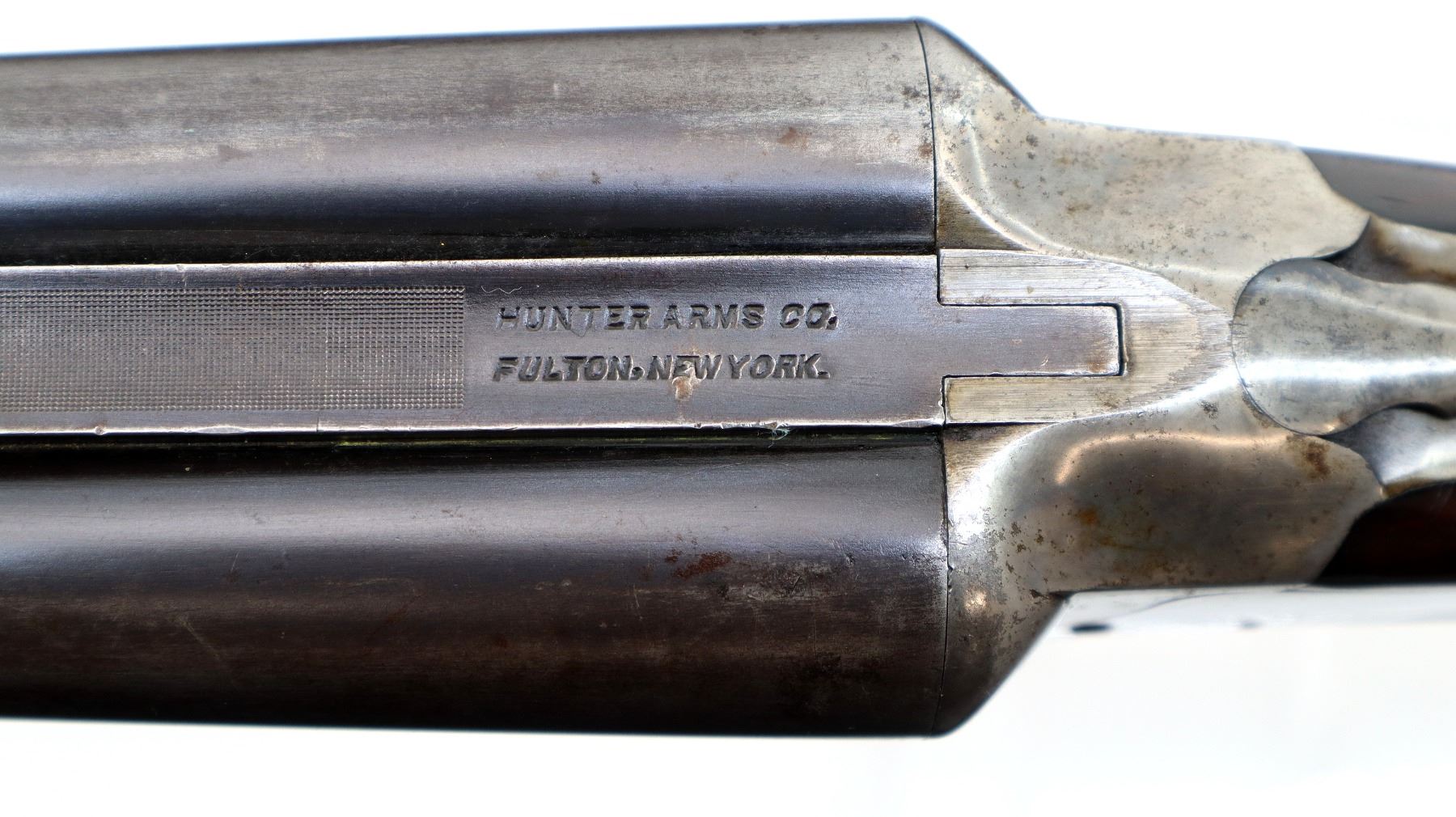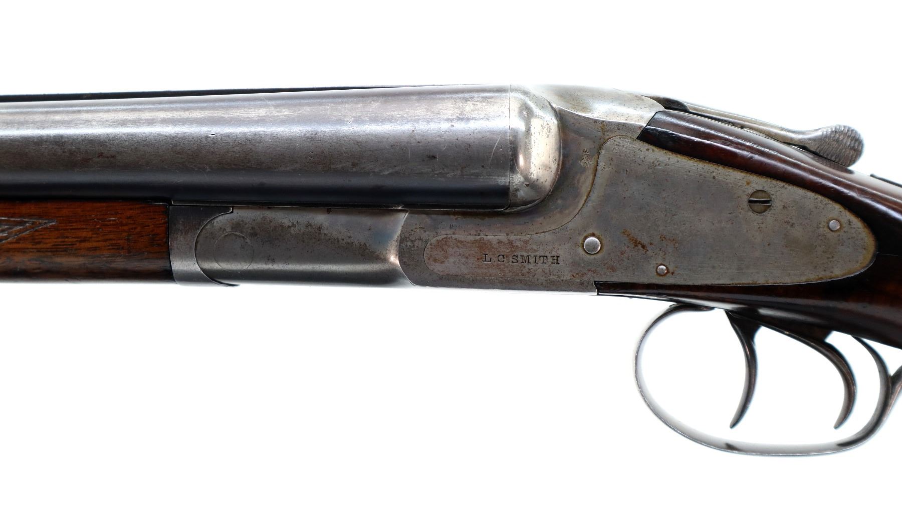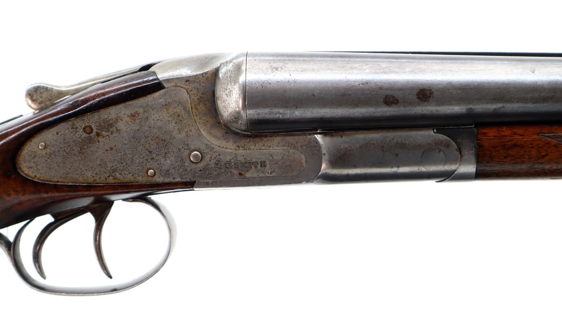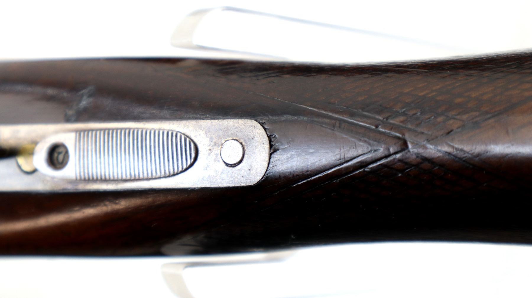Main Description: Brass bead, blued finish, raised rib on barrels that chime and are tight on face, automatic safety, extractor, side locks, double triggers. Two piece wood stocks, checkered splinter forearm and pistol grip, small chips behind upper tang, small crack behind left side lock. Red rubber recoil pad, 14.25" LOP.