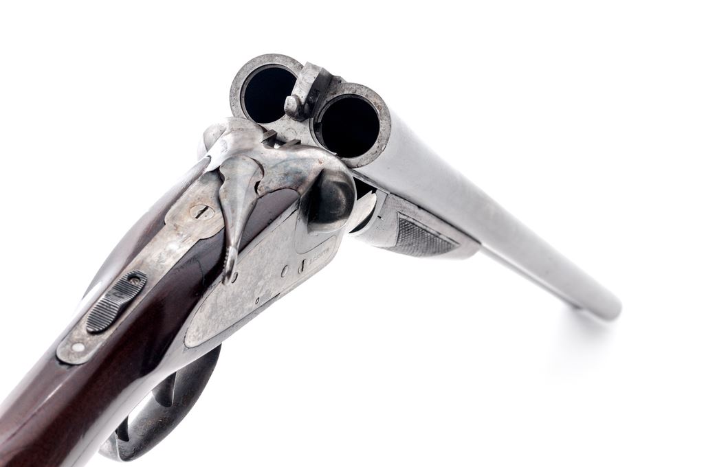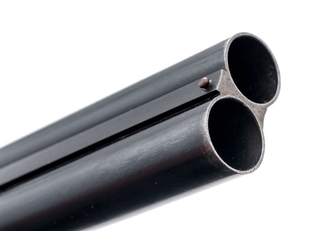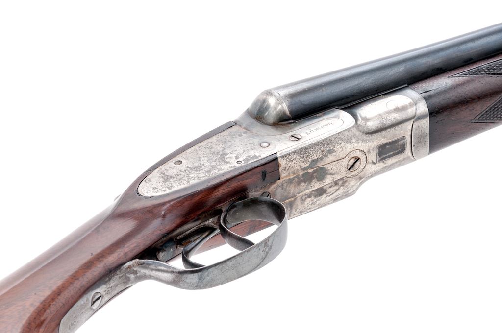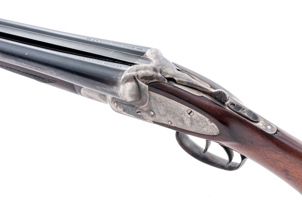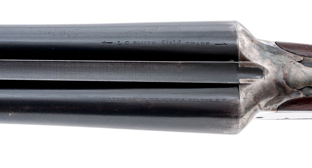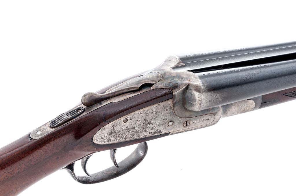 L.C. Smith Field Grade Side-by-Side Shotgun, #351951. 12 ga. 26'' armor steel barrels have 2-3/4'' chambers and are choked Mod./IM. Sidelock action features double triggers, auto safety, and simple extractors. Splinter forend and pistol-grip buttstock are oil-finished walnut, with unmarked black grip cap and buttplate. Mfg'd 1915. Condition is good, with approx. 30%-40% case color remaining on receiver. Forend appears original, but buttstock is a replacement, due to lack of checkering. There are also approx. five small cracks and areas of deterioration where the buttstock meets the receiver. Action still locks tight and functions well; bores are bright. Est.: $300-$500. (C&R)