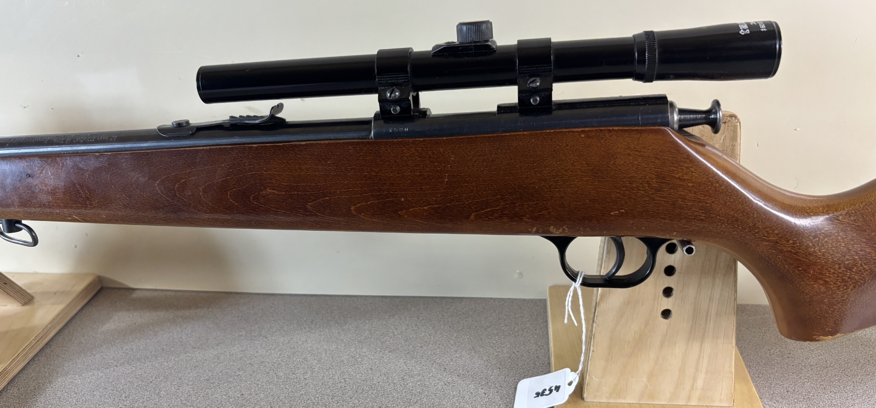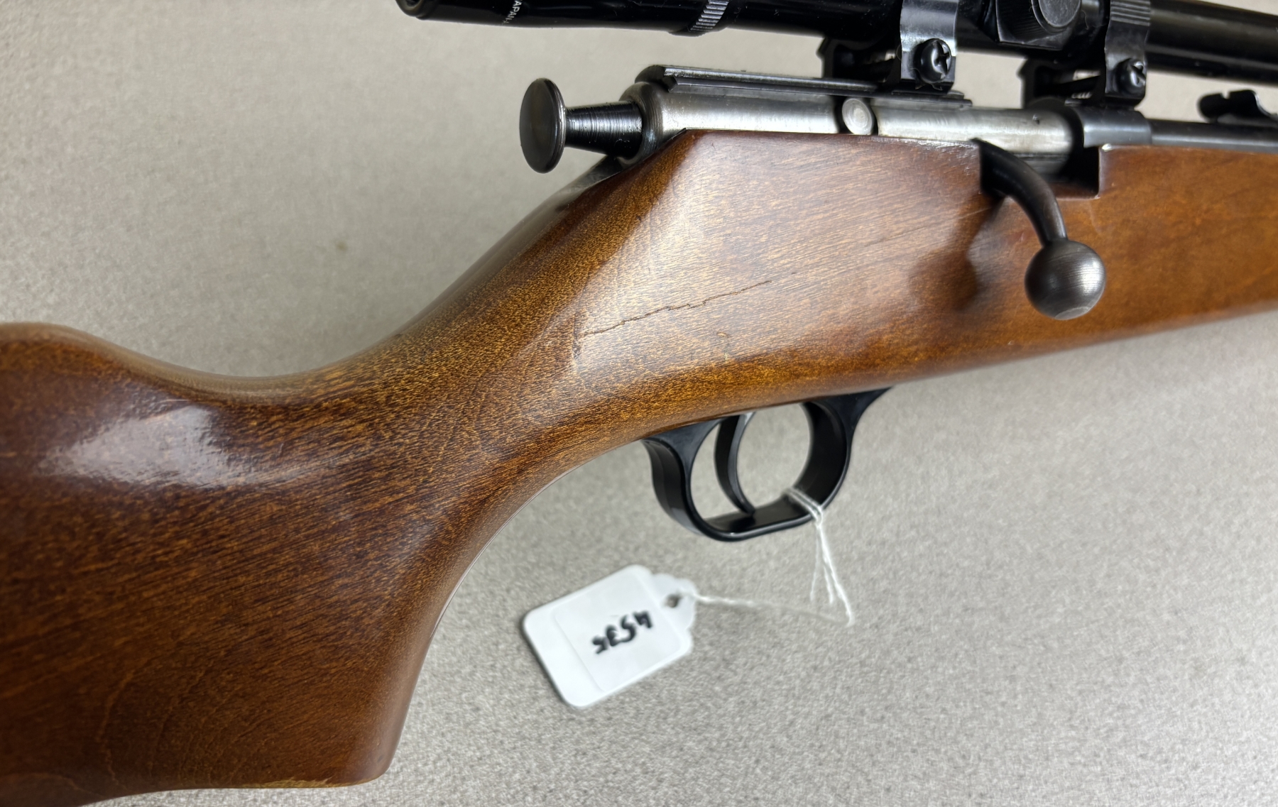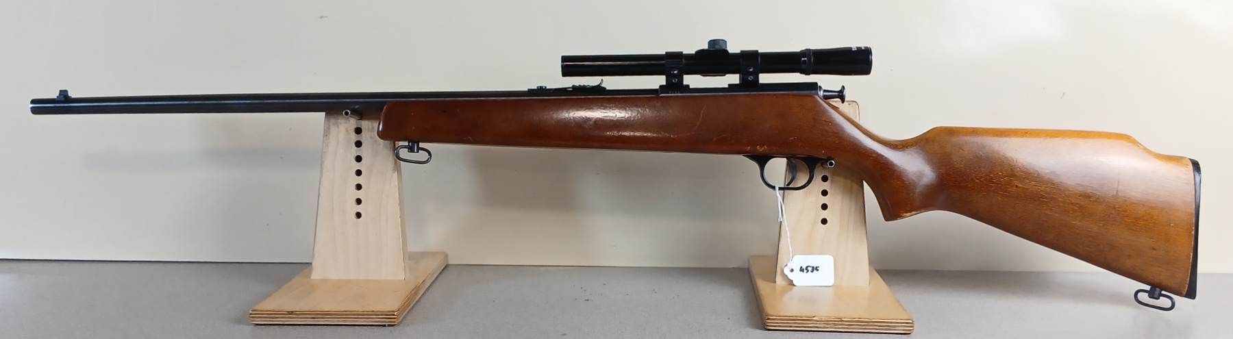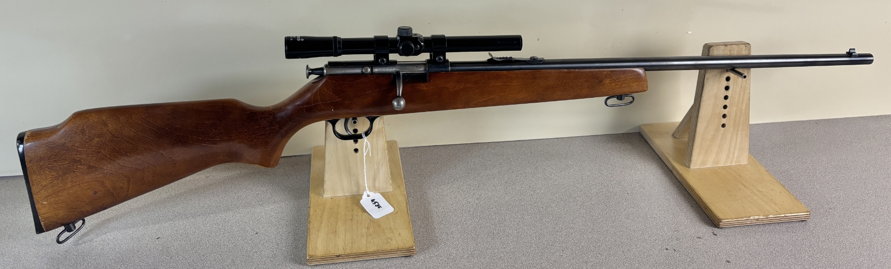 CONDITION: G OVERALL INCL BORE. NOTE: CRACK IN WRIST OF STOCK. SPECS: 23IN BBL. EXTRAS: TASCO 4X15 SCOPE CLEAR WITH CROSSHAIRS. S/N: 7590