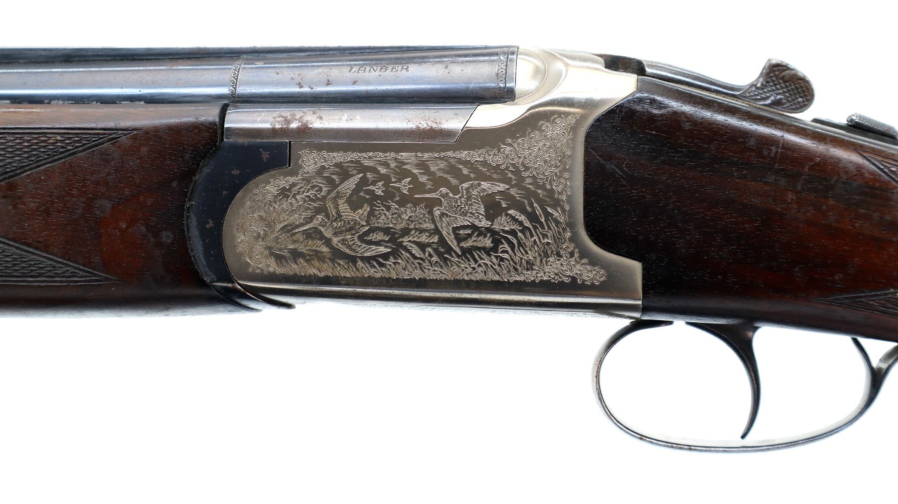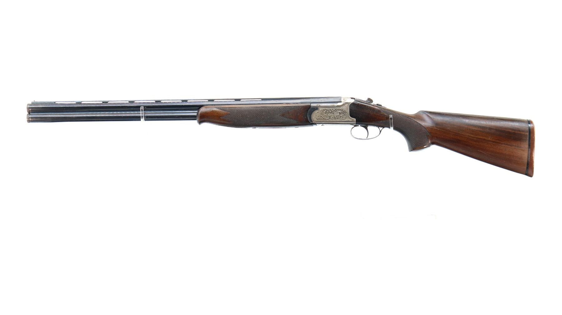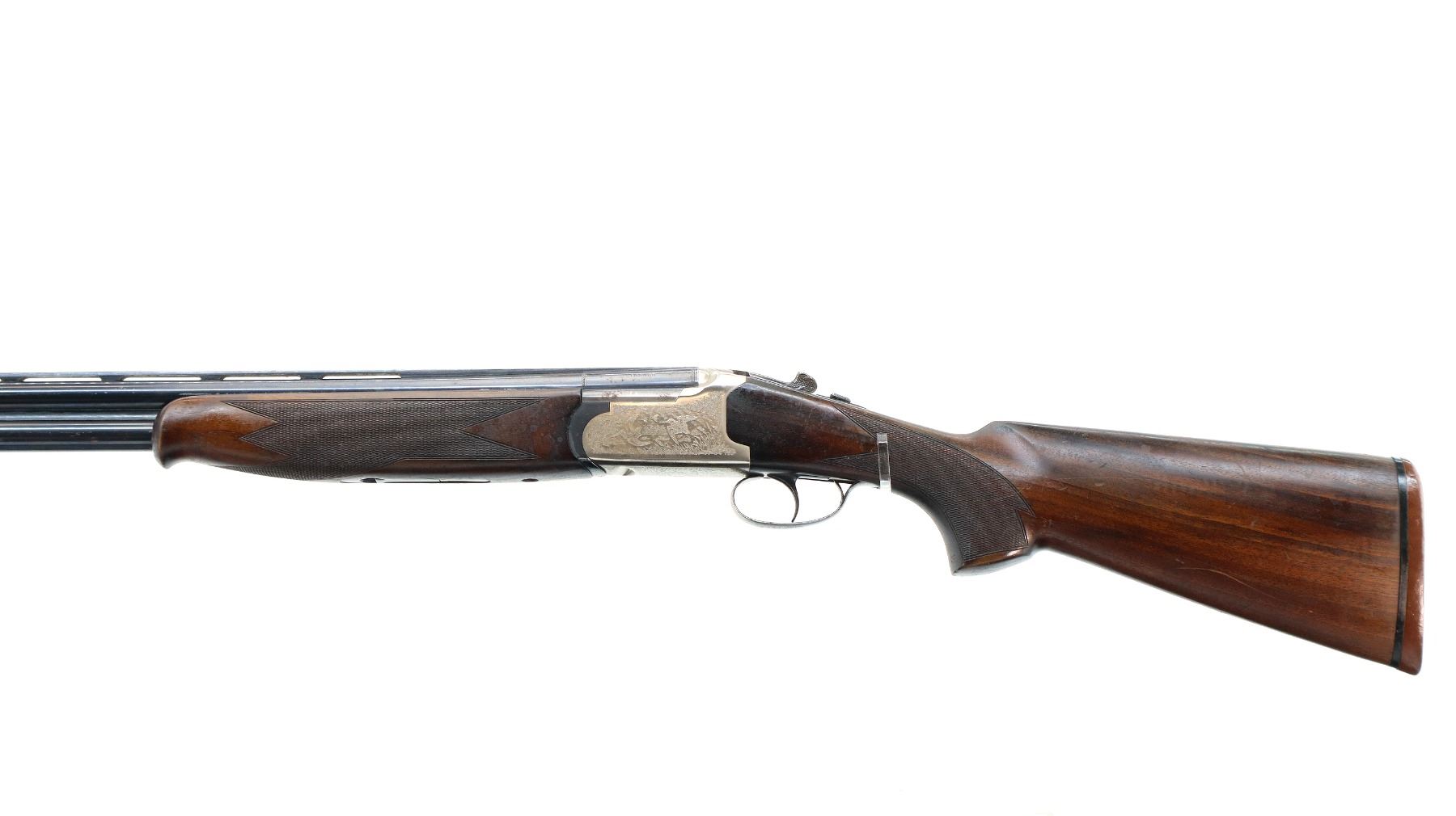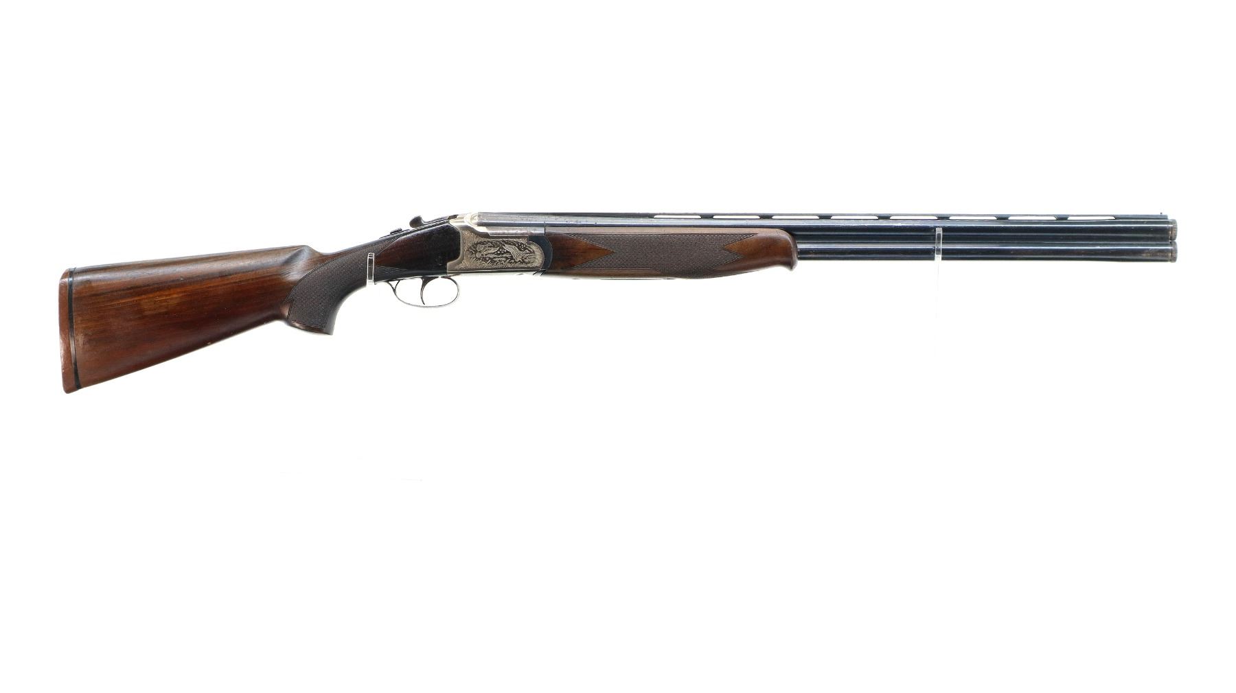 Main Description: Brass bead, blued barrels with vent rib, silver engraved receiver, manual selective safety, ejectors, single blued inertia trigger. Two piece wood stocks, checkered forearm and pistol grip, small crack behind upper tang, red rubber recoil pad.