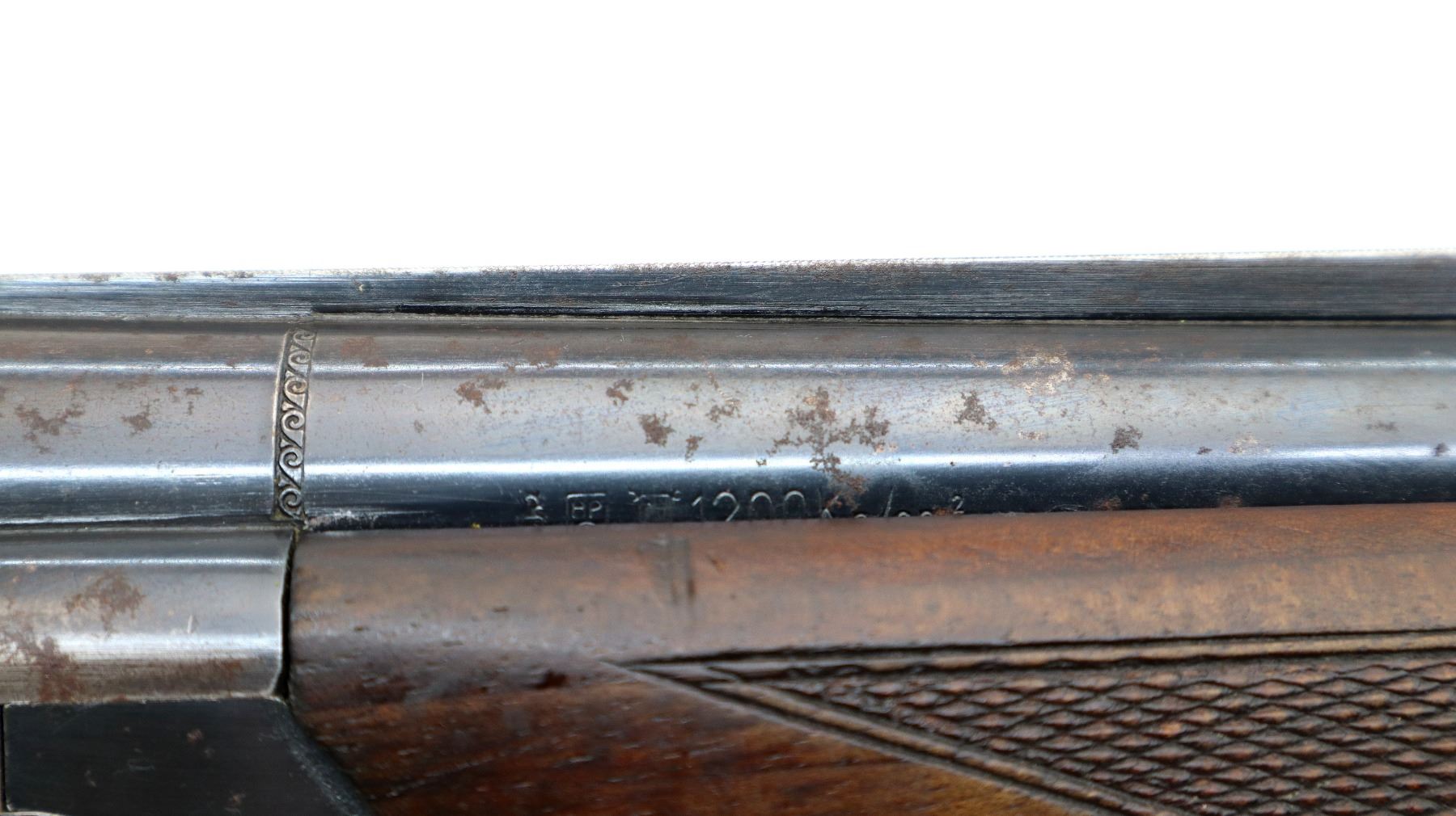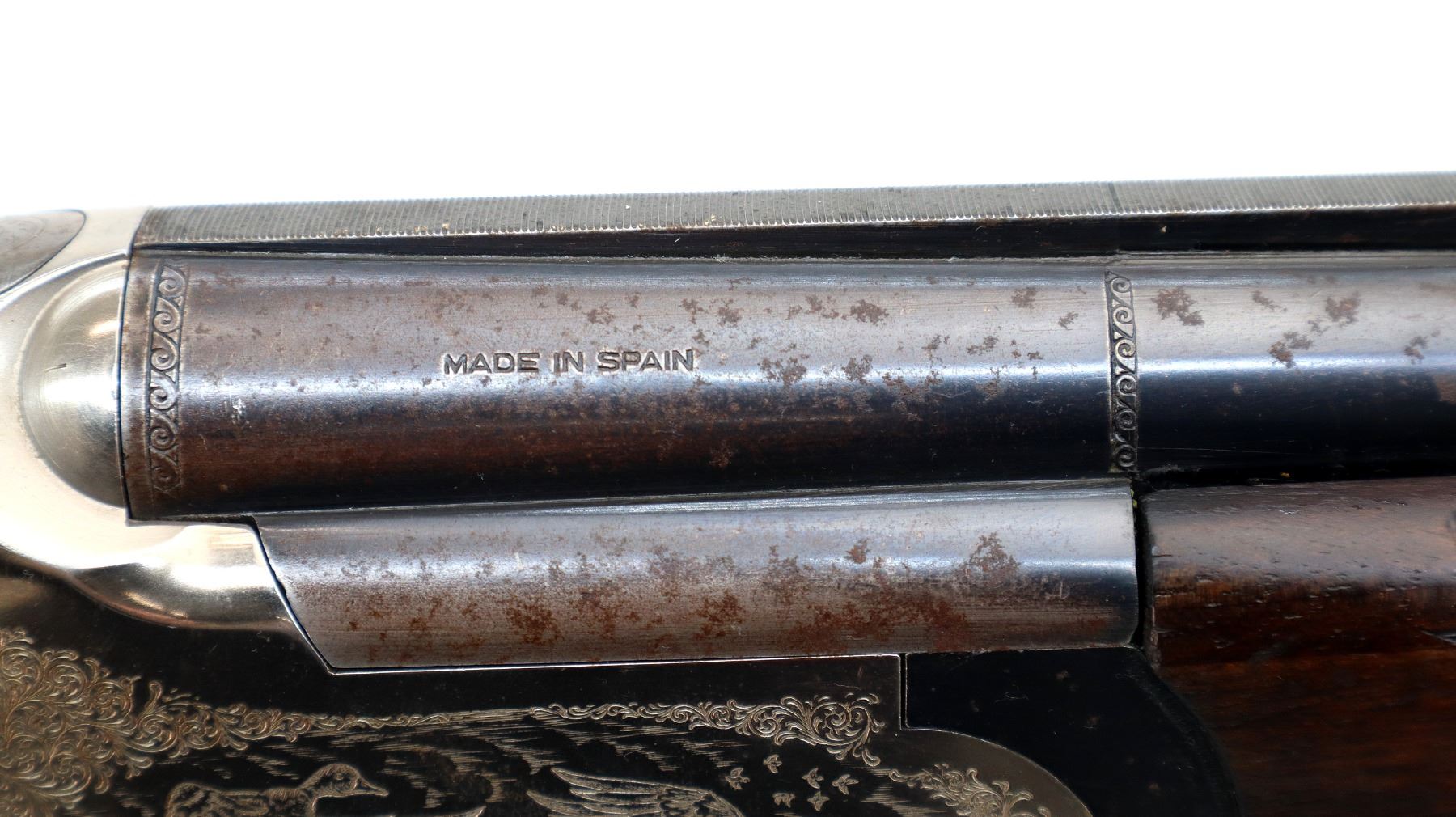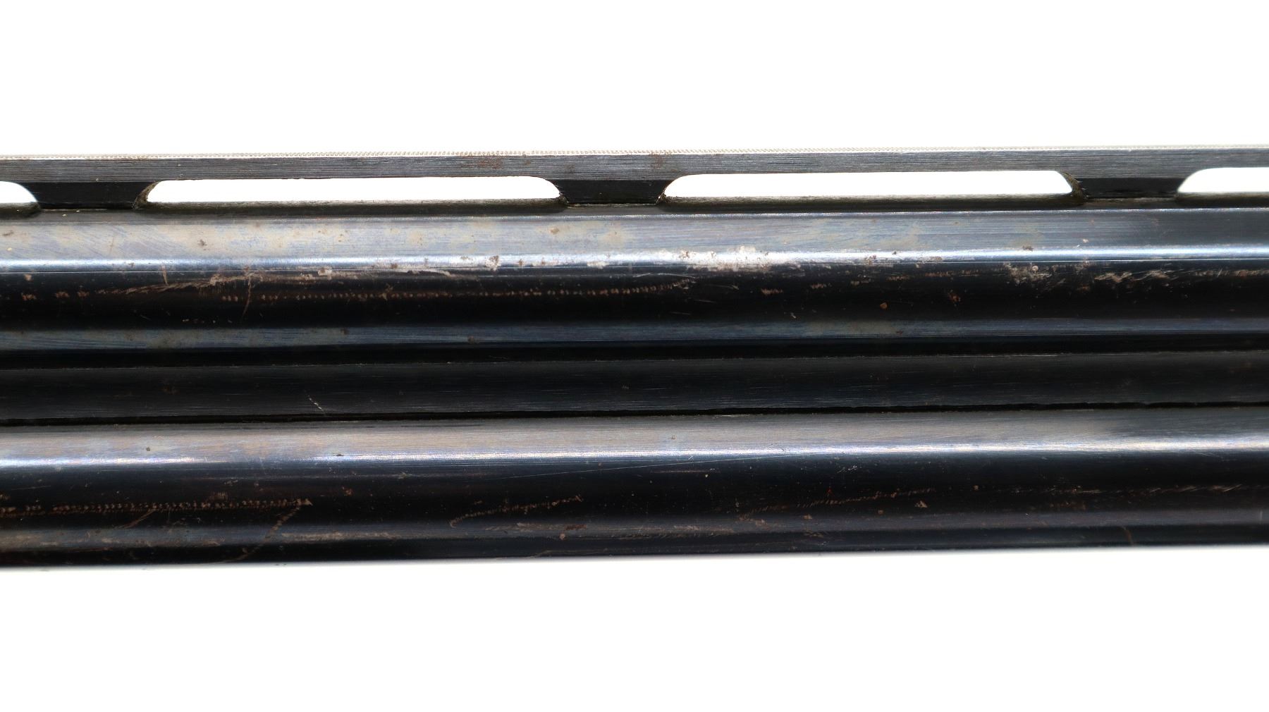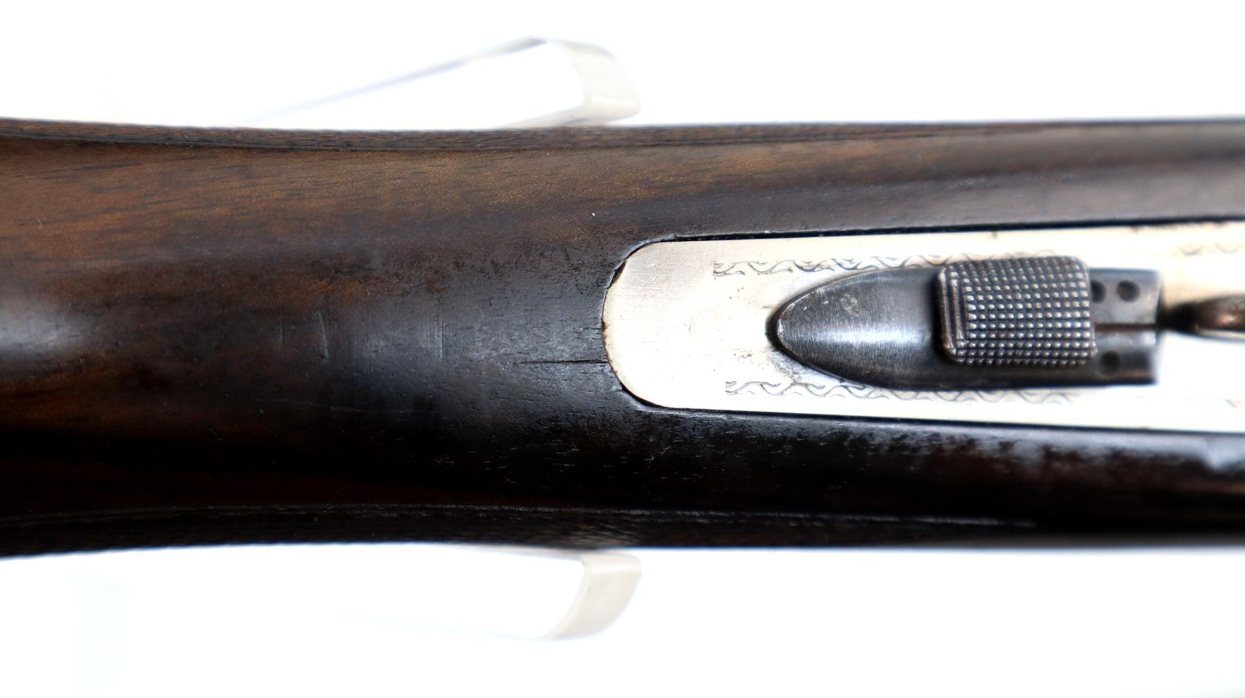 Main Description: Brass bead, blued barrels with vent rib, silver engraved receiver, manual selective safety, ejectors, single blued inertia trigger. Two piece wood stocks, checkered forearm and pistol grip, small crack behind upper tang, red rubber recoil pad.