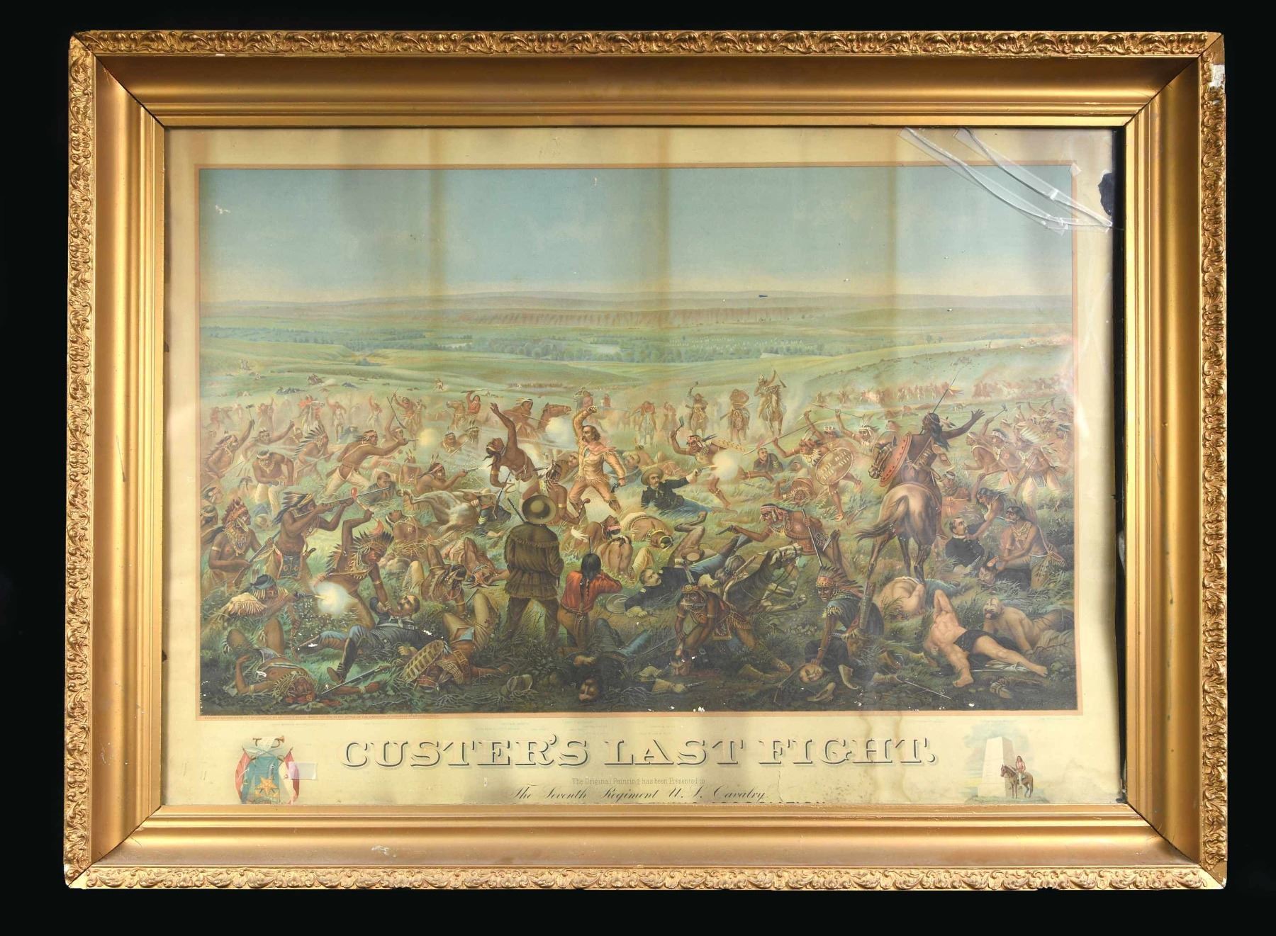 LAST FIGHT". This popular framed print has a sight size of 41 1/2" x 29 1/2". The gold leaf frame measures approx. 48" x 36". The image is that of General Custer's last stand with the 7th Cavalry against the Lakota Sioux, Northern Cheyenne, and Arapaho tribes at the Little Bighorn in Montana. This battle was part of the Great Sioux War of 1876 and was possibly the most significant engagement. In this battle, five of the 7th Cavalry's 12 companies were completely annihilated, and General Custer, along with two of his brothers, a nephew, and his brother-in-law, were killed. This print is from an original painting that was presented to the 7th Regiment of the US Cavalry. It depicts a pitched battle between Native Americans and the 7th Cavalry at the Little Bighorn. The print is boldly titled "CUSTER'S LAST STAND" along with the words "The original painting has been presented to The Seventh Regiment U.S. Cavalry." Several of the principal participants are named in blue print just under the image. CONDITION: the print does show darkening and some water damage. There are three vertical dark lines, possibly from folding many years ago. There are minor losses at the border, not affecting the image proper. There appears to be some very minor, though visible, insect damage to the image itself. The frame is solid but shows wear and some losses to the plaster scroll detail. The glass has two cracks in the upper right-hand corner. PROVENANCE: from the renowned collection of quality sporting arms from Lewis Drake together with inventory of Lewis Drake Associates. (02-23539/BF). $300-600.