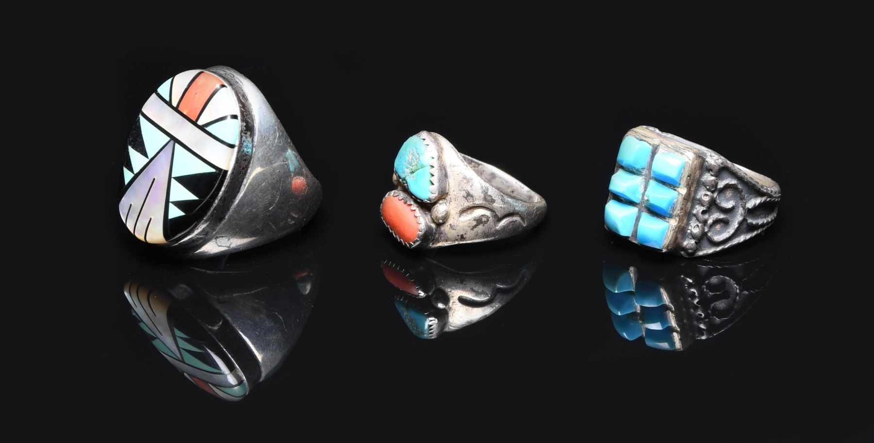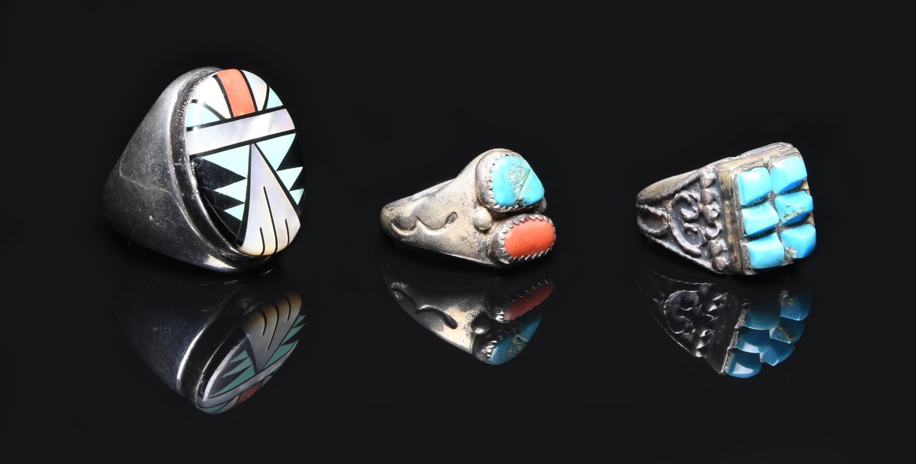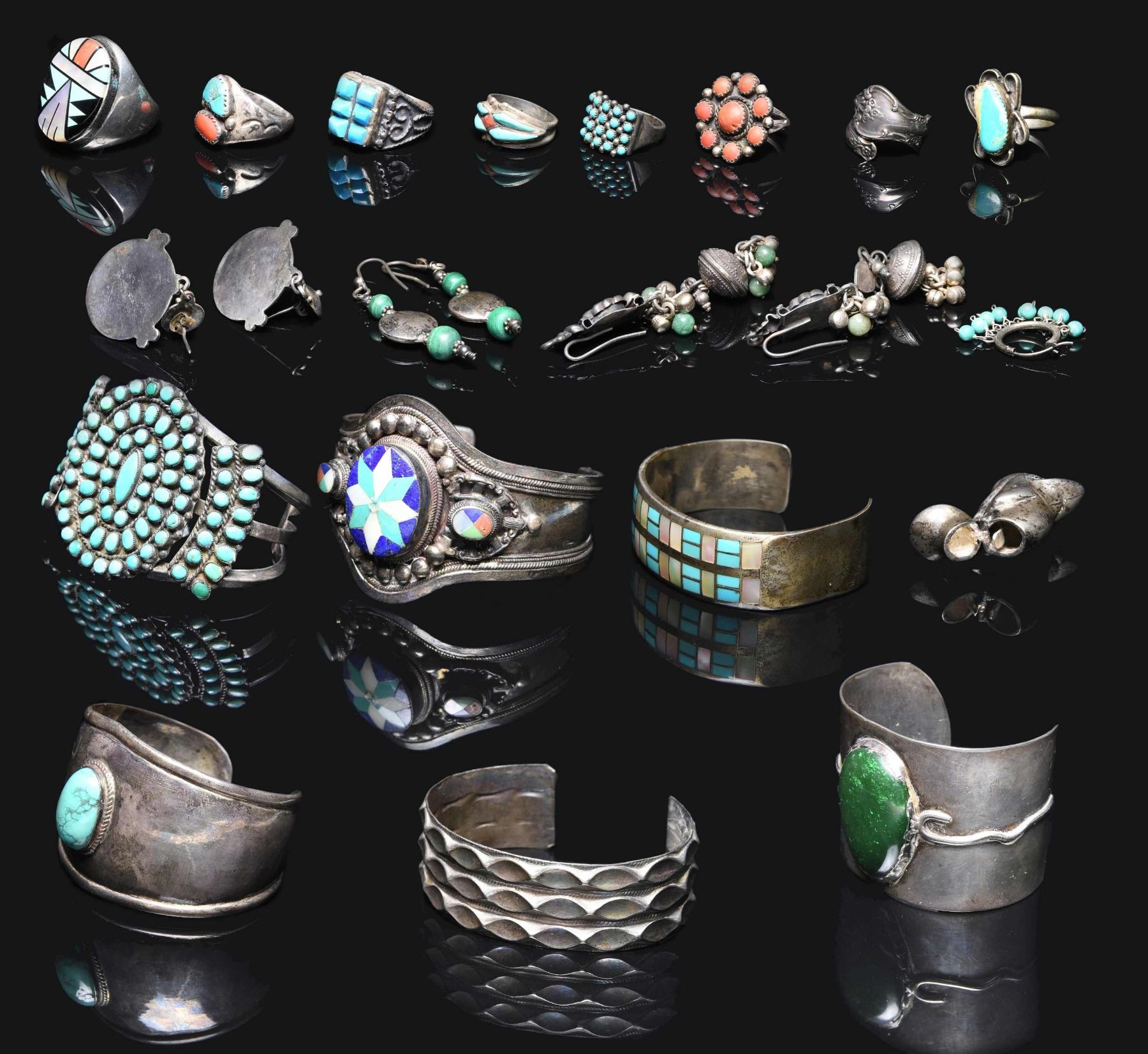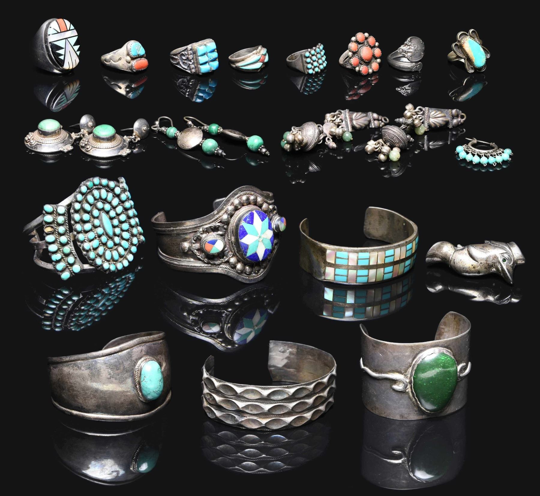 JEWELRY. This attractive lot consists of 1 large silver bracelet with royal blue, light blue, white, and red stones. / 1 large silver bracelet with a large dark green cabochon that might be jade. / 1 large silver bracelet marked "925" with a turquoise cabochon. / 1 large silver bracelet with rectangular turquoise stones and mother-of-pearl. / 1 large silver bracelet with numerous small turquoise stones (1 missing). / 1 pair of ornate silver drop earrings with possible jade beads. / 2 pair of silver and jade earrings. / 1 silver penguin shaped container. / 8 assorted silver rings with a selection of turquoise, coral, mother-of-pearl, and black enamel decorations. CONDITION: all items generally show light wear with significant tarnish. PROVENANCE: from the renowned collection of quality sporting arms from Lewis Drake together with inventory of Lewis Drake Associates. (02-23573-1/BF). $500-1,000.