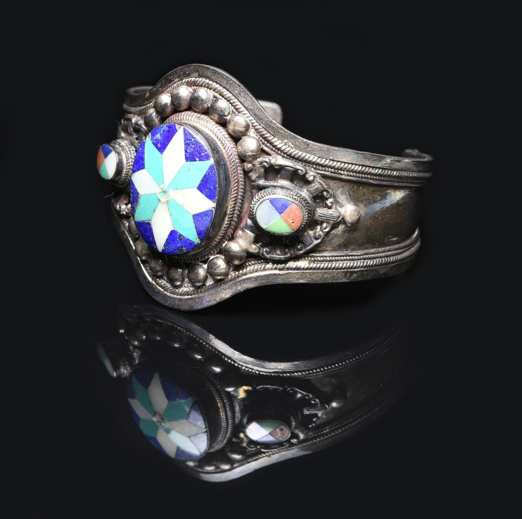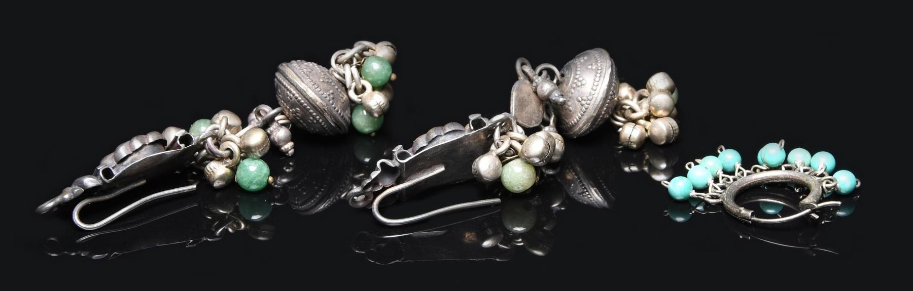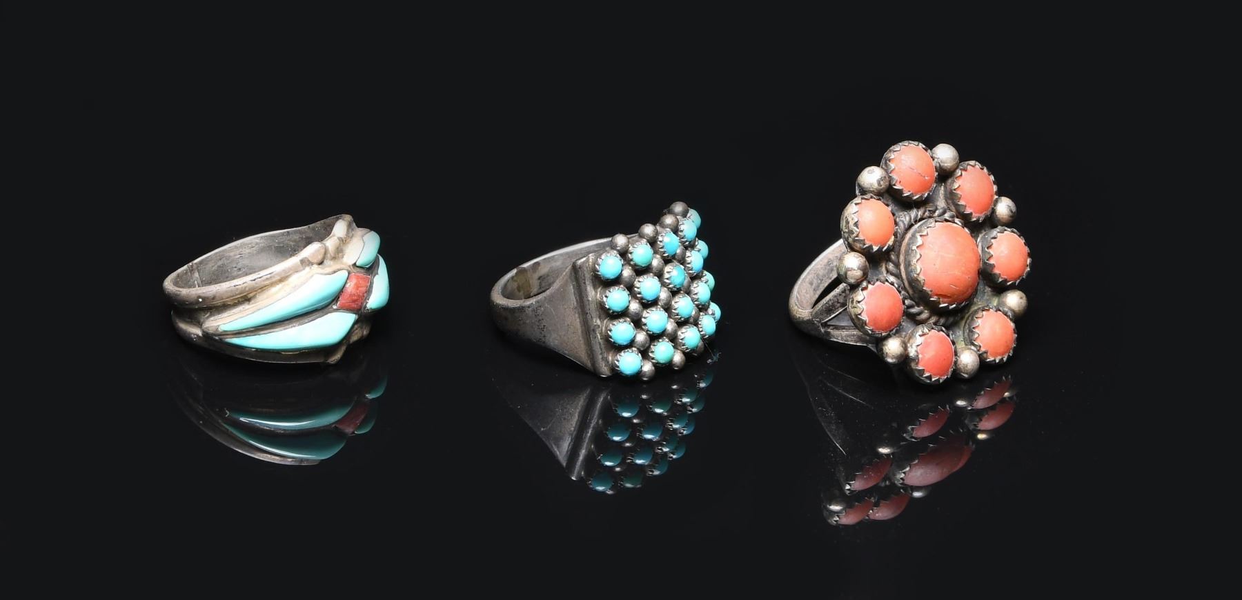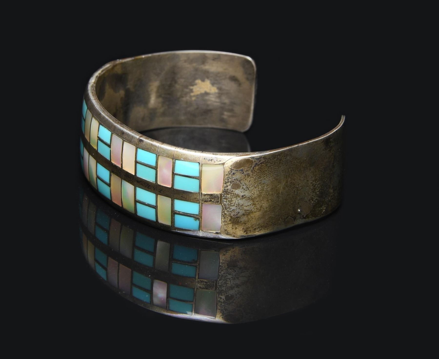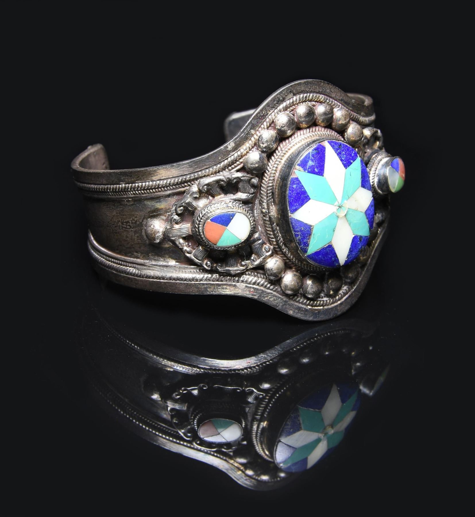 JEWELRY. This attractive lot consists of 1 large silver bracelet with royal blue, light blue, white, and red stones. / 1 large silver bracelet with a large dark green cabochon that might be jade. / 1 large silver bracelet marked "925" with a turquoise cabochon. / 1 large silver bracelet with rectangular turquoise stones and mother-of-pearl. / 1 large silver bracelet with numerous small turquoise stones (1 missing). / 1 pair of ornate silver drop earrings with possible jade beads. / 2 pair of silver and jade earrings. / 1 silver penguin shaped container. / 8 assorted silver rings with a selection of turquoise, coral, mother-of-pearl, and black enamel decorations. CONDITION: all items generally show light wear with significant tarnish. PROVENANCE: from the renowned collection of quality sporting arms from Lewis Drake together with inventory of Lewis Drake Associates. (02-23573-1/BF). $500-1,000.