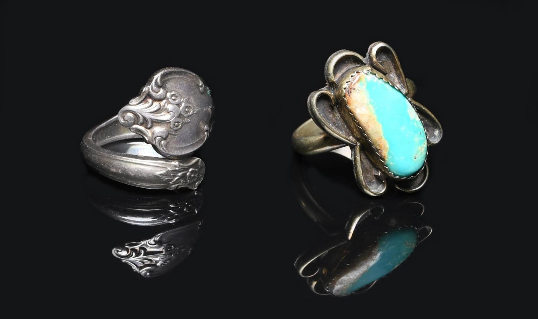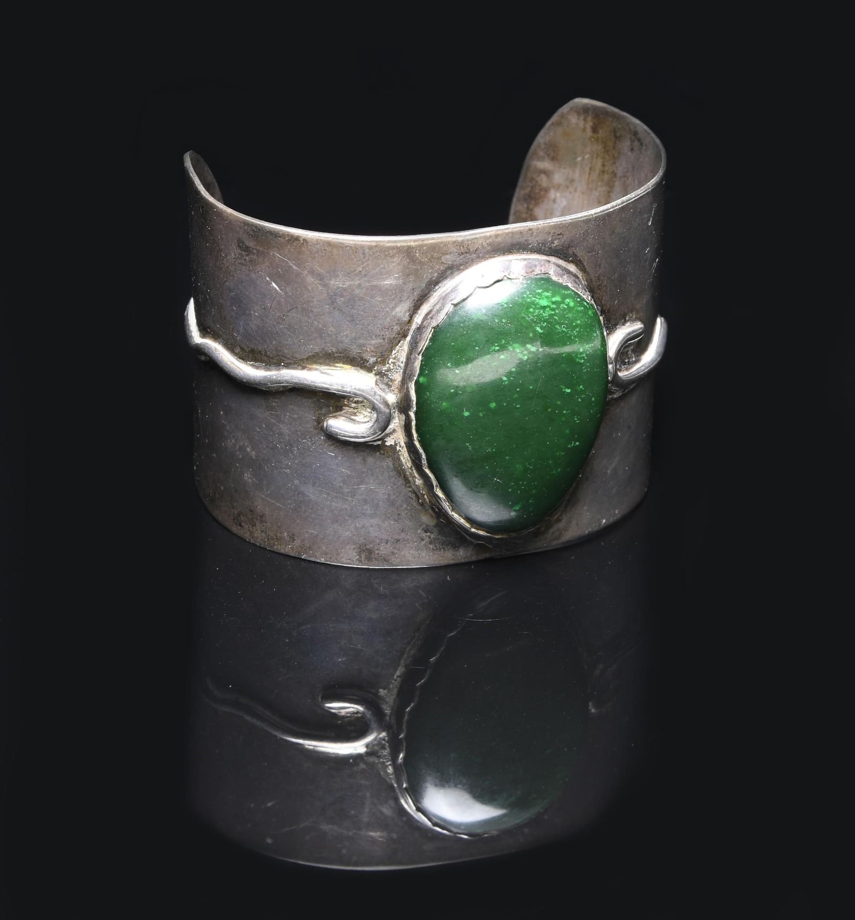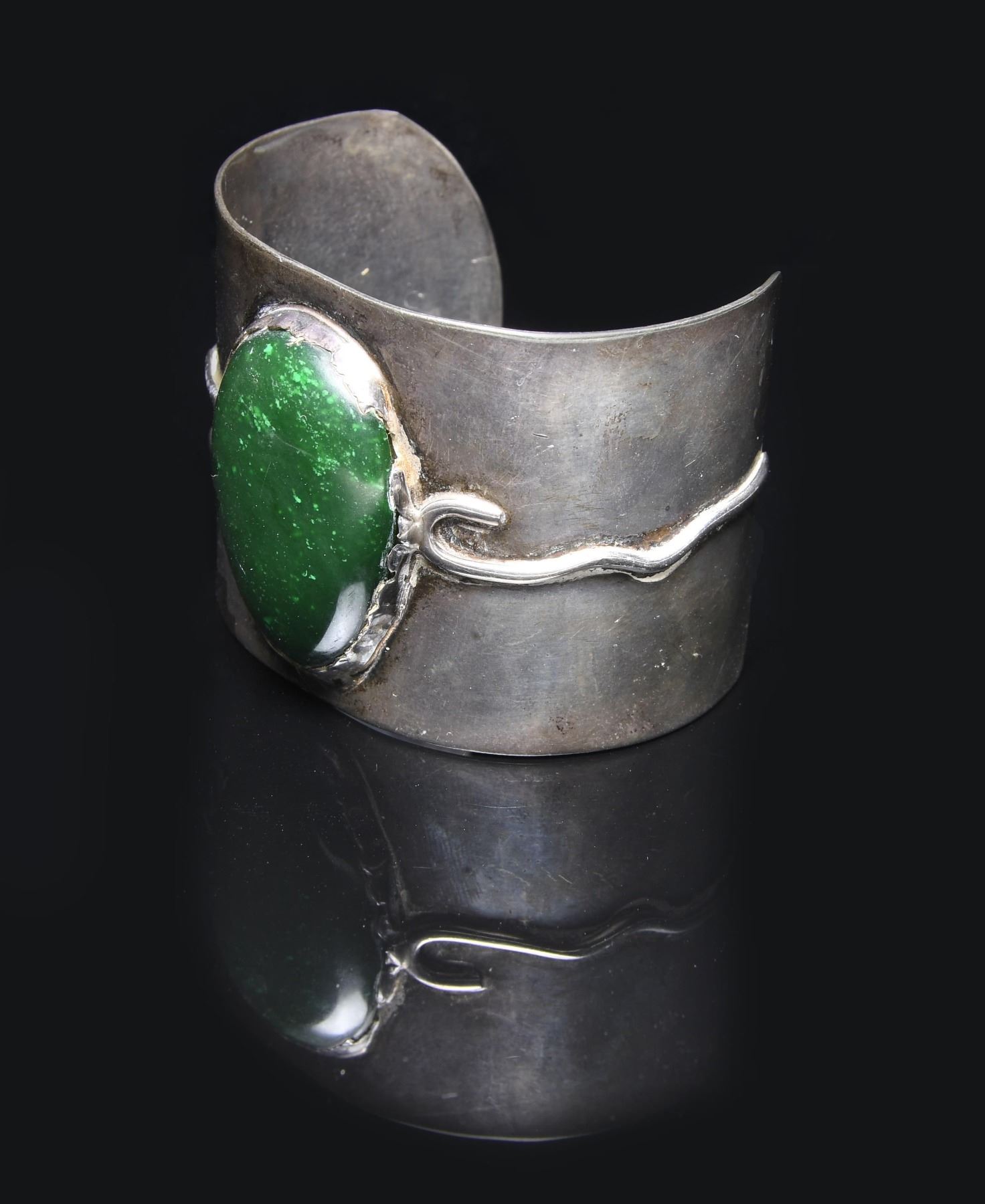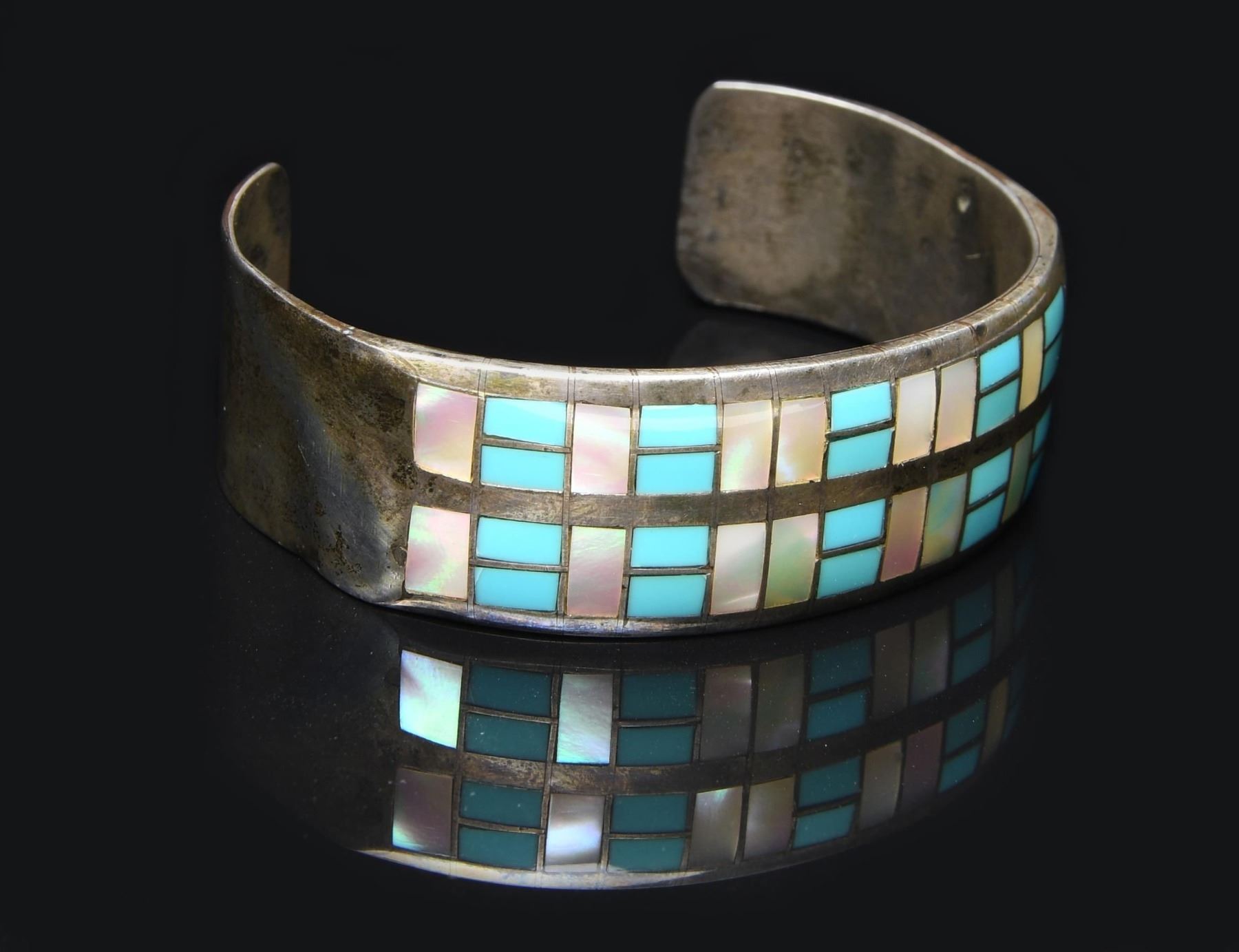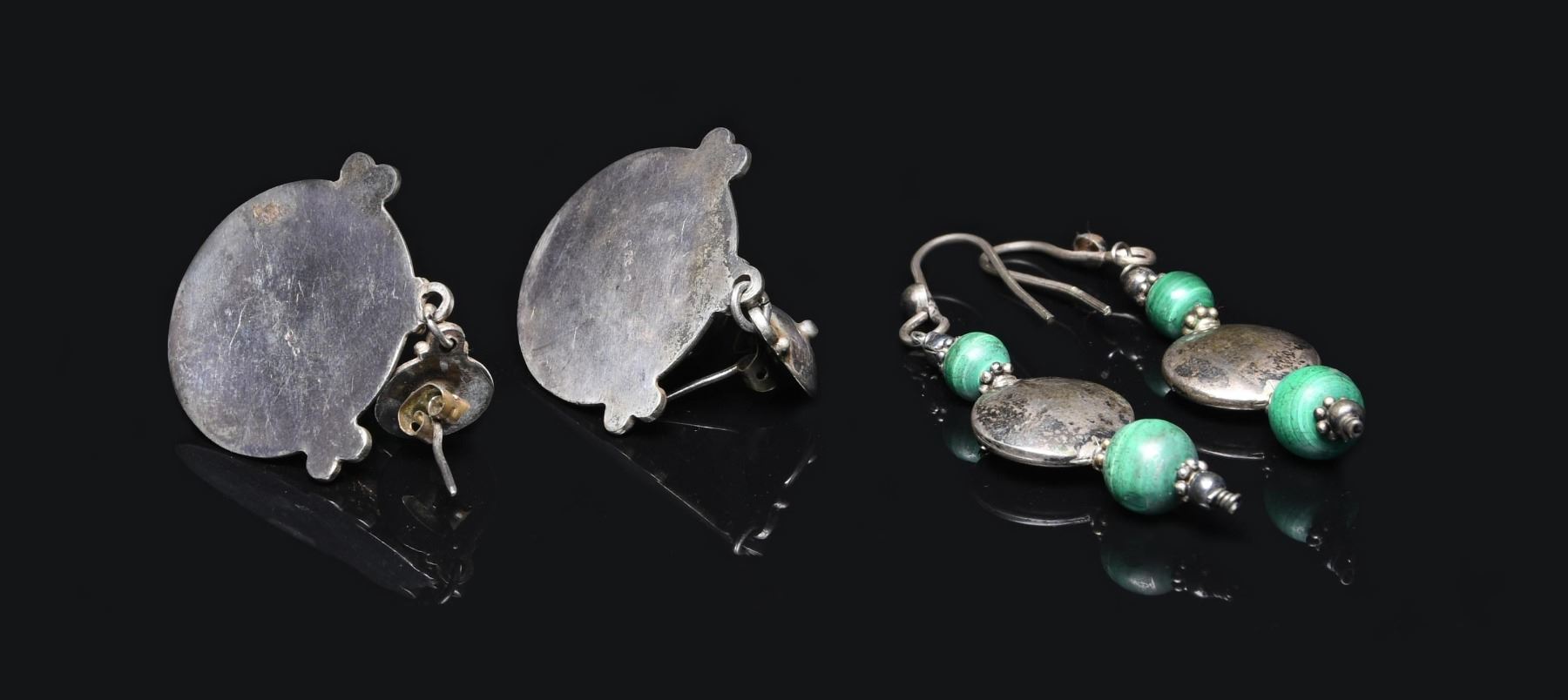 JEWELRY. This attractive lot consists of 1 large silver bracelet with royal blue, light blue, white, and red stones. / 1 large silver bracelet with a large dark green cabochon that might be jade. / 1 large silver bracelet marked "925" with a turquoise cabochon. / 1 large silver bracelet with rectangular turquoise stones and mother-of-pearl. / 1 large silver bracelet with numerous small turquoise stones (1 missing). / 1 pair of ornate silver drop earrings with possible jade beads. / 2 pair of silver and jade earrings. / 1 silver penguin shaped container. / 8 assorted silver rings with a selection of turquoise, coral, mother-of-pearl, and black enamel decorations. CONDITION: all items generally show light wear with significant tarnish. PROVENANCE: from the renowned collection of quality sporting arms from Lewis Drake together with inventory of Lewis Drake Associates. (02-23573-1/BF). $500-1,000.