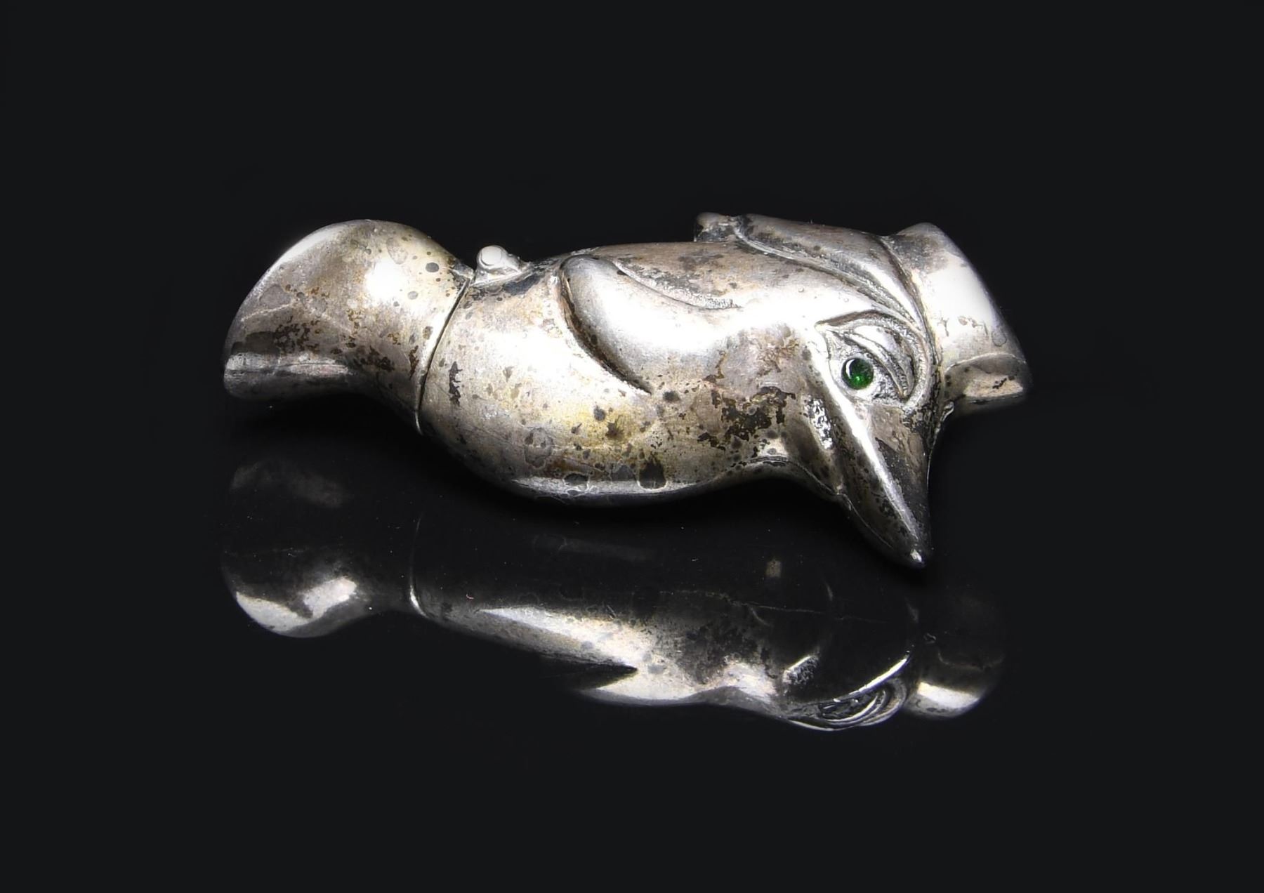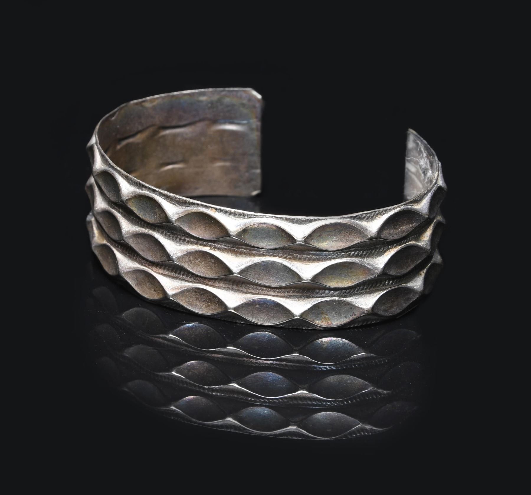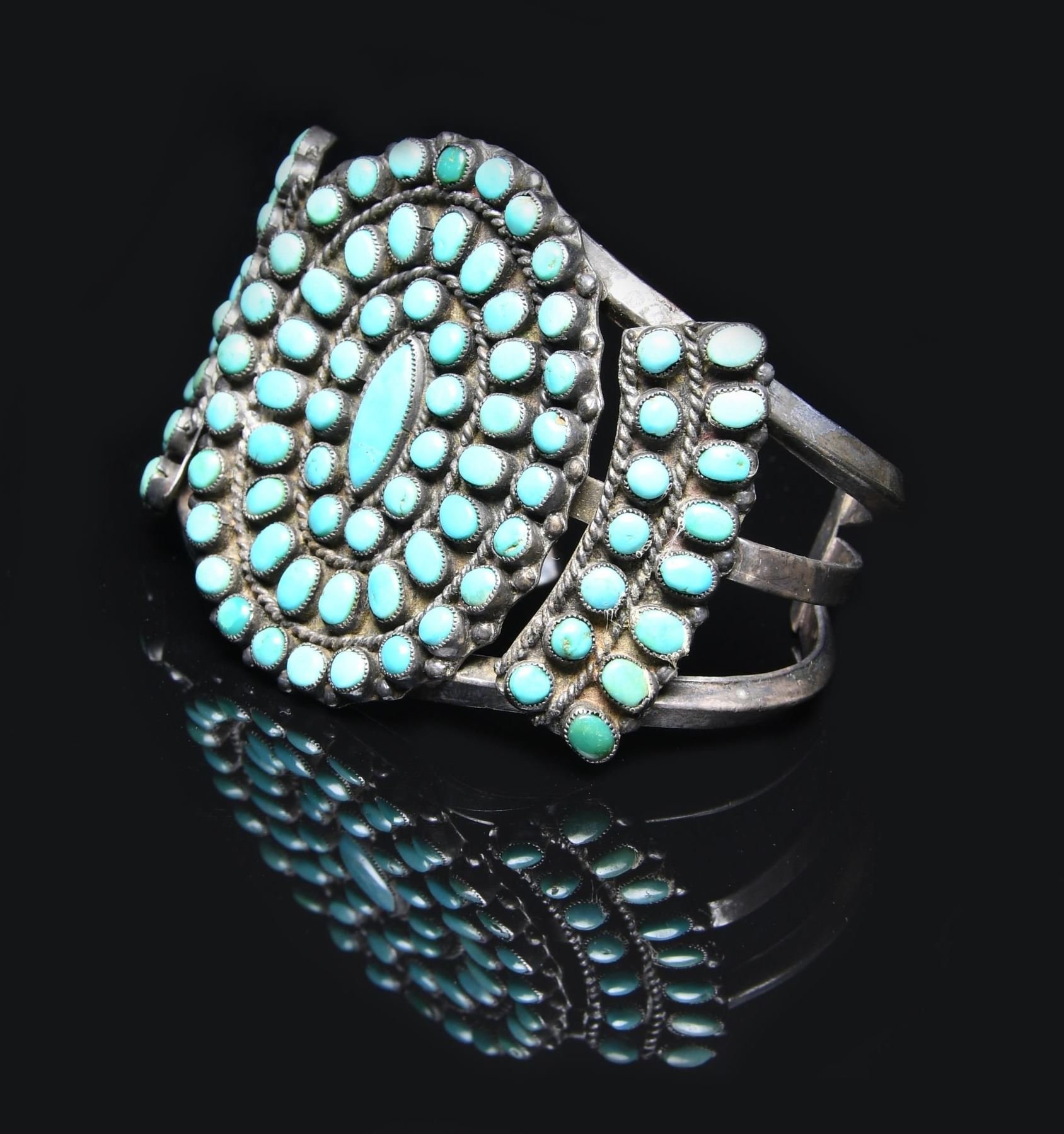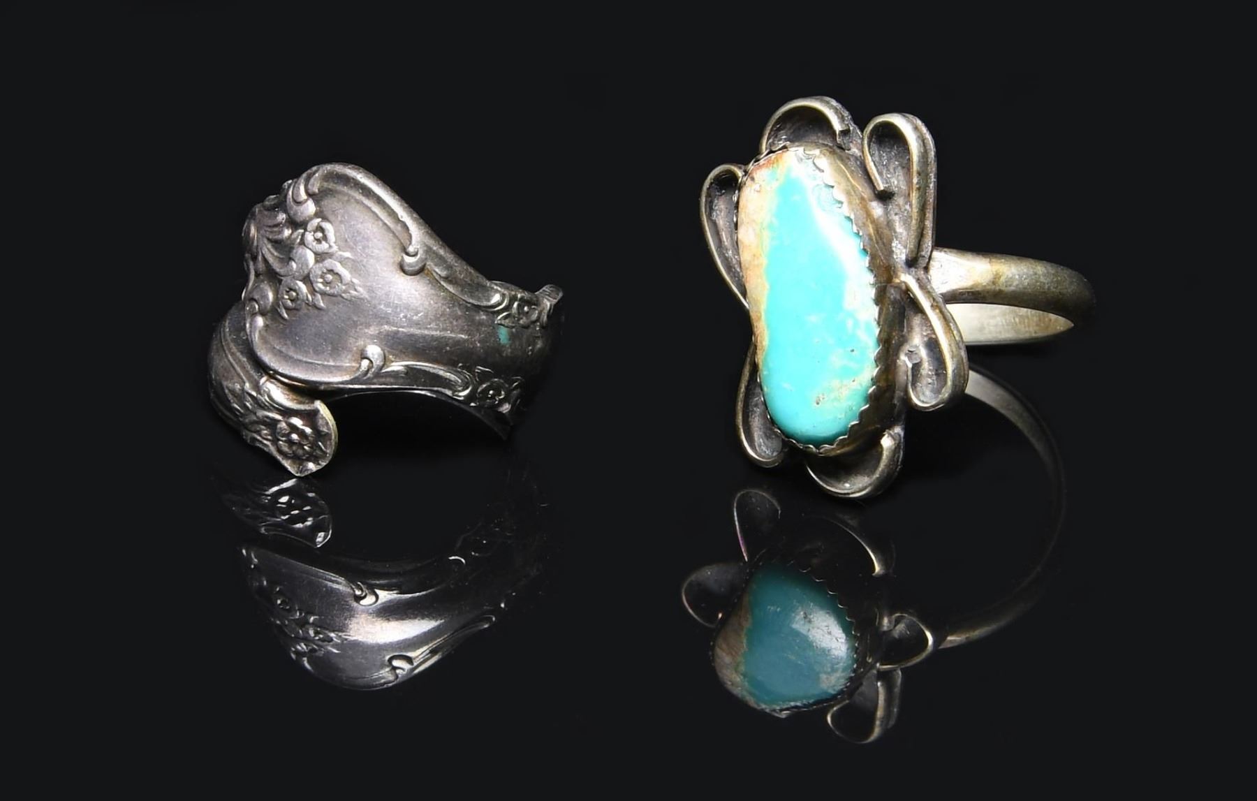 JEWELRY. This attractive lot consists of 1 large silver bracelet with royal blue, light blue, white, and red stones. / 1 large silver bracelet with a large dark green cabochon that might be jade. / 1 large silver bracelet marked "925" with a turquoise cabochon. / 1 large silver bracelet with rectangular turquoise stones and mother-of-pearl. / 1 large silver bracelet with numerous small turquoise stones (1 missing). / 1 pair of ornate silver drop earrings with possible jade beads. / 2 pair of silver and jade earrings. / 1 silver penguin shaped container. / 8 assorted silver rings with a selection of turquoise, coral, mother-of-pearl, and black enamel decorations. CONDITION: all items generally show light wear with significant tarnish. PROVENANCE: from the renowned collection of quality sporting arms from Lewis Drake together with inventory of Lewis Drake Associates. (02-23573-1/BF). $500-1,000.