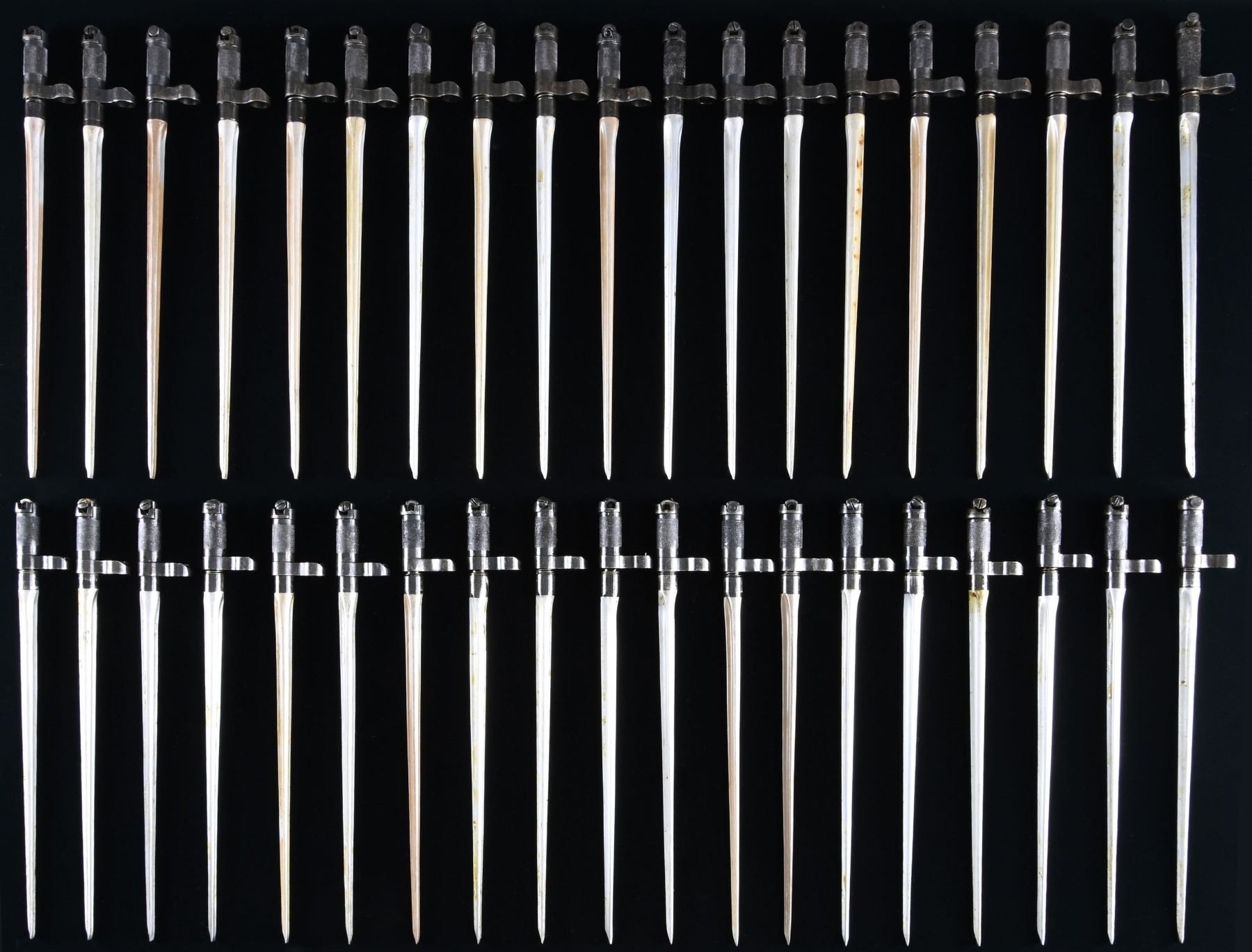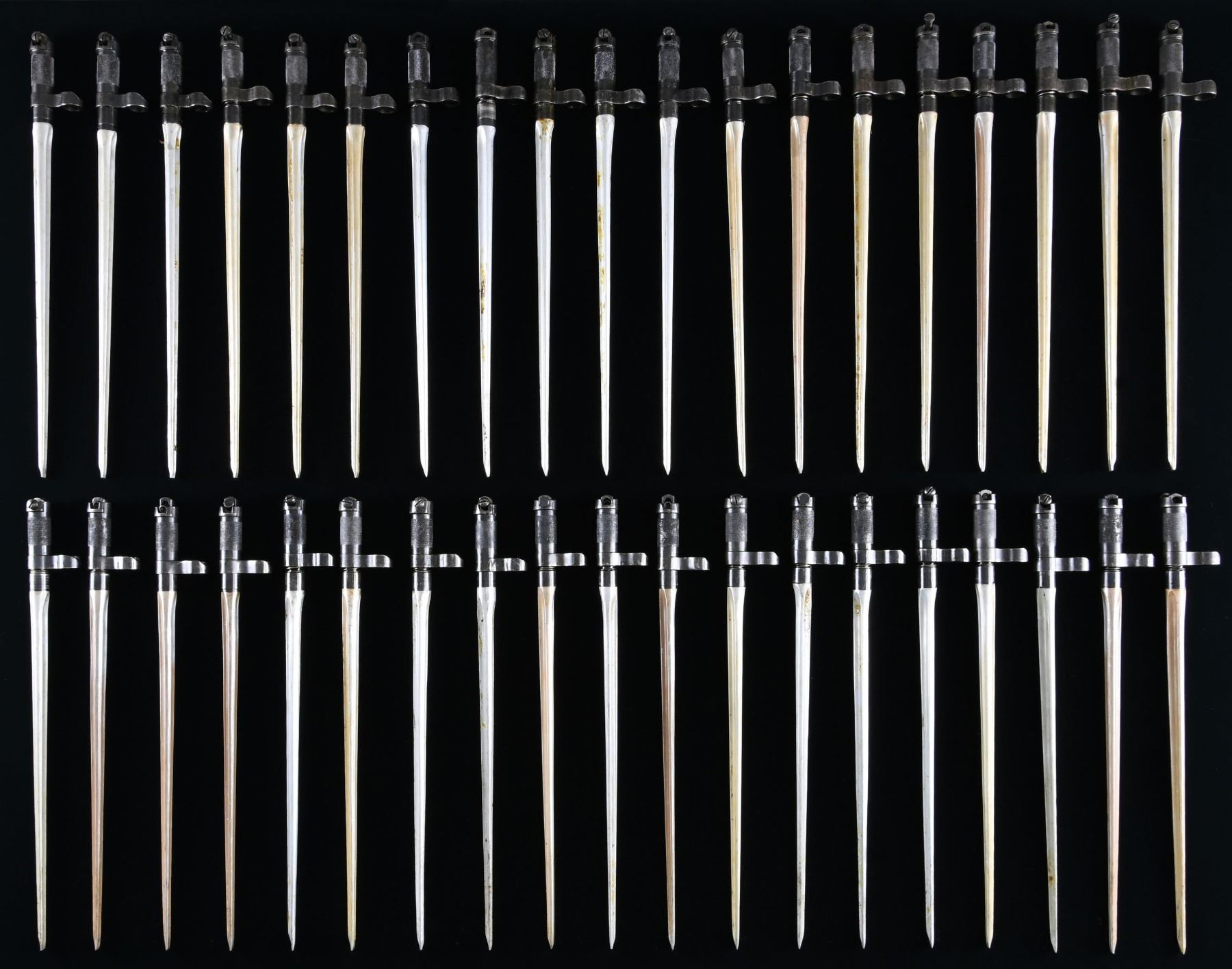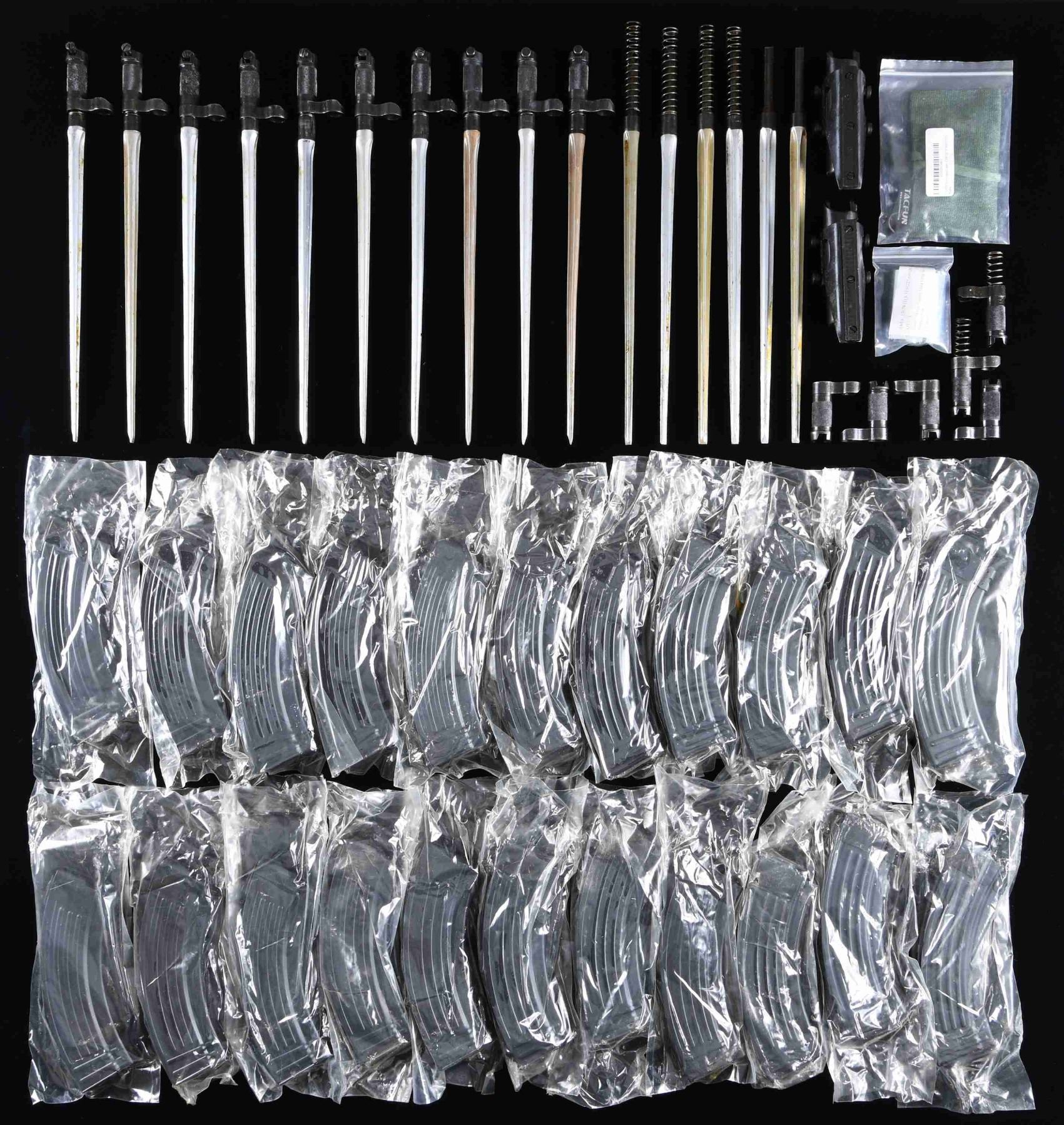 BAYONETS, & ACESSORIES. Large lot of AK mags., SKS bayonets, and accessories, including: 1) 73 unmarked steel AK 7.62x39mm 30-rd. mags. 2) approx. 91 (likely Chinese) SKS spike bayonets. Some bayonets are missing their handle and spring. 3) 6 SKS bayonet handles. 4) 2 aftermarket SKS receiver covers. 5) 1 M91/30 cleaning pouch. 6) 5 M91/30 stripper clips. CONDITION: very good, with nearly all mags. remaining in their original plastic packaging. Bayonets are very good, showing some scattered superficial handling marks, with nearly all retaining a layer of cosmoline overall. (02-24272-6/MLW). $1,200-2,000.