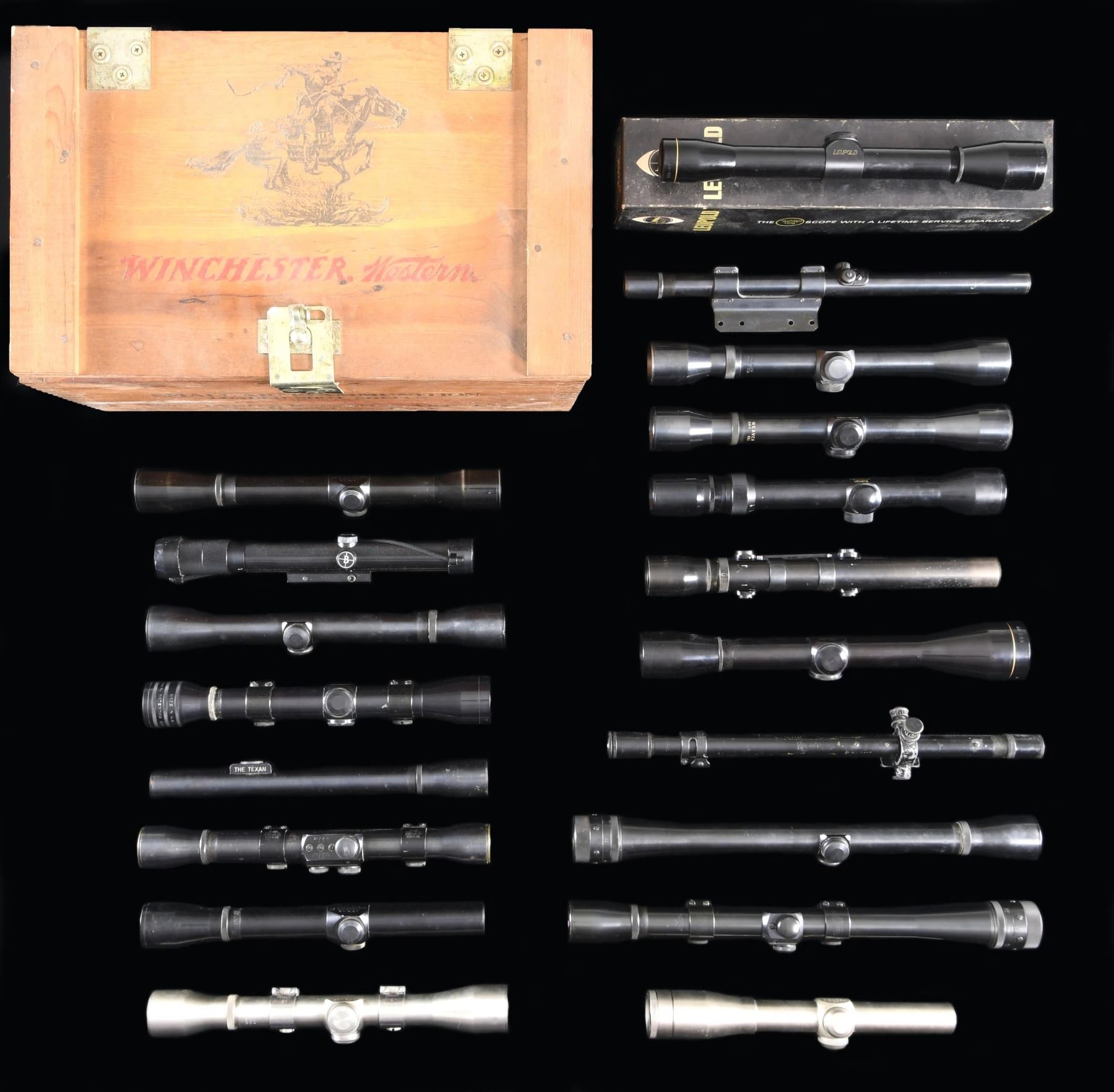 Large lot of assorted scopes, including: 1) 1 Weaver G6 scope. 2) 1 Weaver K4-1 Micro-Trac scope. 3) 1 Weaver K4 60-B scope. 4) 1 Weaver K8 60-B scope. 5) 1 Weaver K4-1 scope. 6) 1 Weaver K10 scope. 7) 1 Weaver stainless K4-S scope. 8) 1 Weaver K8 scope. 9) 1 Bushnell Sportview 3-9x scope. 10) 1 Bushnell Scopechief 22 3-8x scope. 11) 1 Lyman All-American 3x scope. 12) 1 Lyman All-American 4x scope. 13) 1 Leupold M8 4x scope with box. 14) 1 Leupold M8 7.5x scope. 15) 2 assorted Redfield 4x scopes. 16) 1 Norman-Ford & Co. "The Texan" scope. 17) 1 Winchester 2 3/4-X scope. 18) 1 Bausch & Lomb Balvar scope. CONDITION: scopes range in condition, with most retaining the majority of their original factory finishes. Some scopes show varying degrees of wear, scattered superficial handling marks, and some spots of surface oxidation, with all appearing to retain clear optics. (02-24473-1/MLW). $500-800.