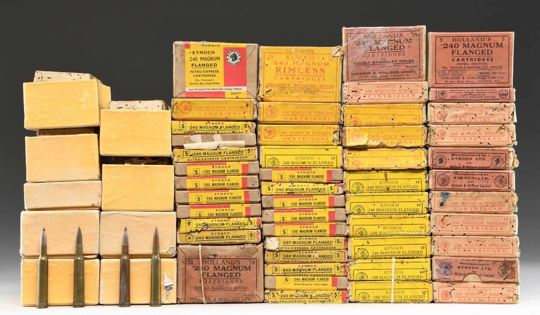 AMMUNITION . The ammunition is nearly all Flanged and Rimless with only a few loose belted rds. Lot may contain hollow points. The loadings vary but seem to be mostly soft-nose. Boxes vary in the number of rounds and labeling. The Flanged cartridges number app. 360 including those without boxes. Rimless cartridges number 150, all with boxes. The belted cartridges total 20 and seem to be mostly misfires. CONDITION: The boxes show extensive insect damage with wear and staining. Ammunition shows oxidation and verdigris. PROVENANCE: from the renowned collection of quality sporting arms from Lewis Drake together with inventory of Lewis Drake Associates. (02-23571-6/RW). AMMO. $300-600.