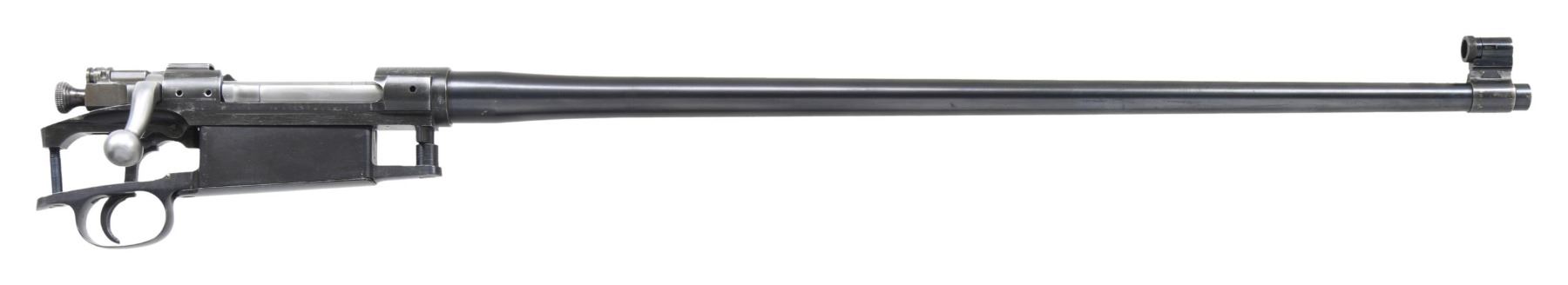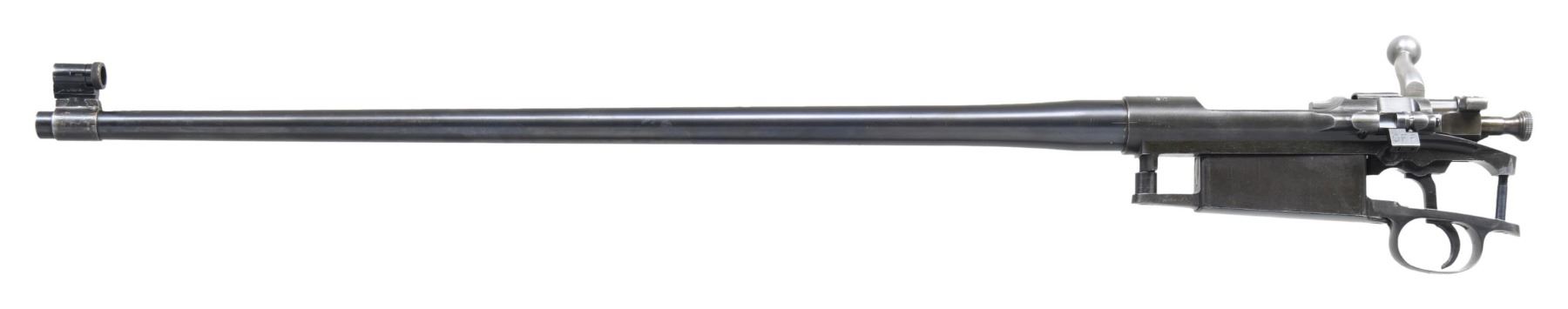 ACTION. Cal. 30-06. S# 1479562. Bbl. 24". Marked behind front sight "SA / flaming bomb / 5-38". Rear sight is not present. Fixed front sight base has been fitted w/ a Lyman globe target sight assembly w/ aperture insert. Receiver manufactured in 1934. Bright nickeled-steel bolt w/ punch proof. Receiver bridged drilled & tapped on the right side for aperture sight. Action is complete w/ milled trigger guard & grooved trigger. CONDITION: bbl. & receiver have professional quality reblue w/ thinning & light wear. Very good shiny bore w/ sharp lands. (25-2930/RW). MODERN. $200-400.