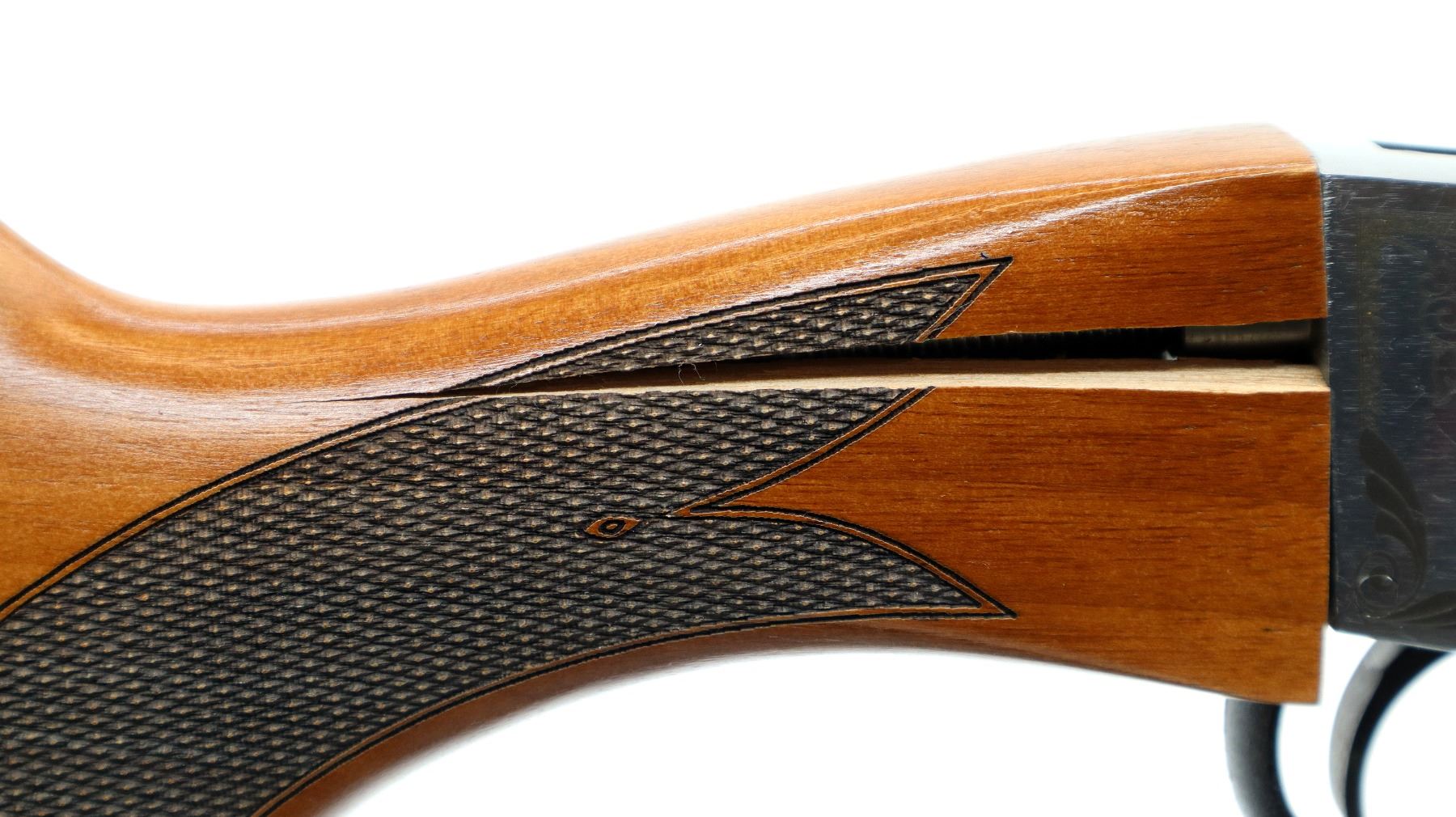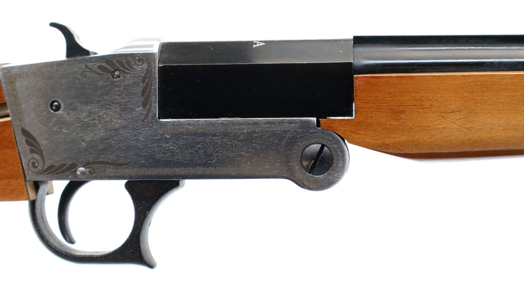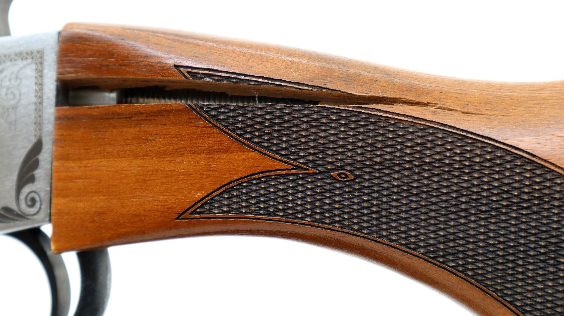 Main Description: Missing front bead hole is present, blued vent rib barrel, silver engraved receiver, grooved spur hammer, extractor, trigger guard opens action. Two piece wood stocks, checkered pistol grip, broken behind receiver, missing butt plate and screws, has sling swivels.