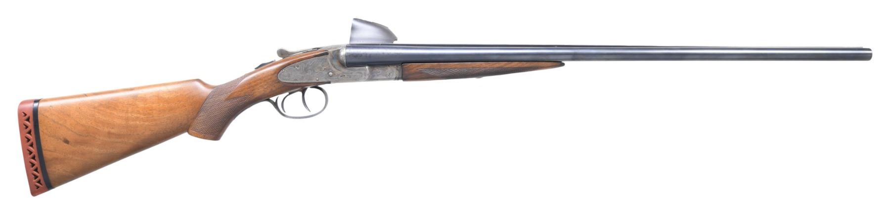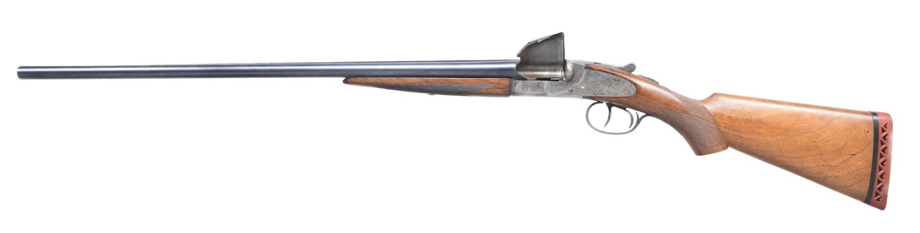 Cal. 20 ga. 2 3/4". S# 162632. Bbl. 26" of London steel w/ left chamber blown-out. Case colored sidelock action w/ open floral pattern engraving & wavy borders. Double triggers. Selective ejectors. Splinter forend & pistol grip stock of checkered walnut. LOP: altered to 14" over an aftermarket Hawkins pad. CONDITION: damaged gun w/ good action for parts, or needs to be rebarreled. Left chamber is blown wide open. Refinished wood, grip cap is missing. Action appears to be sound. PROVENANCE: from the renowned collection of quality sporting arms from Lewis Drake together with inventory of Lewis Drake Associates. (24-6584/DS). MODERN. $300-500.