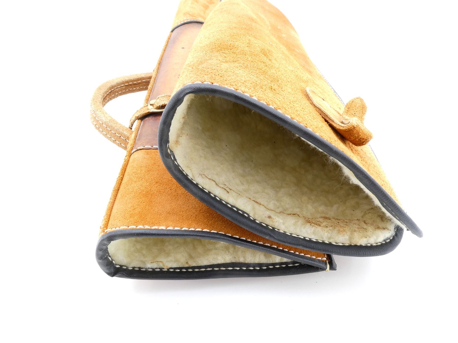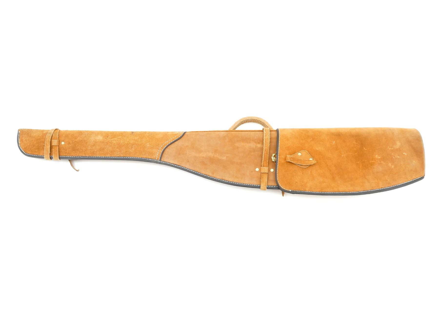 LOT INCLUDES; (1) LEATHER RIFLE SCABBARD, CARRY HANDLE, (4) LEATHER STRAPS & BUCKELS, ENGRAVED LEATHER, APPROX. OVERALL LENGTH 52", SHOWS WEAR AND TEAR FROM USAGE, SEE PHOTOS.