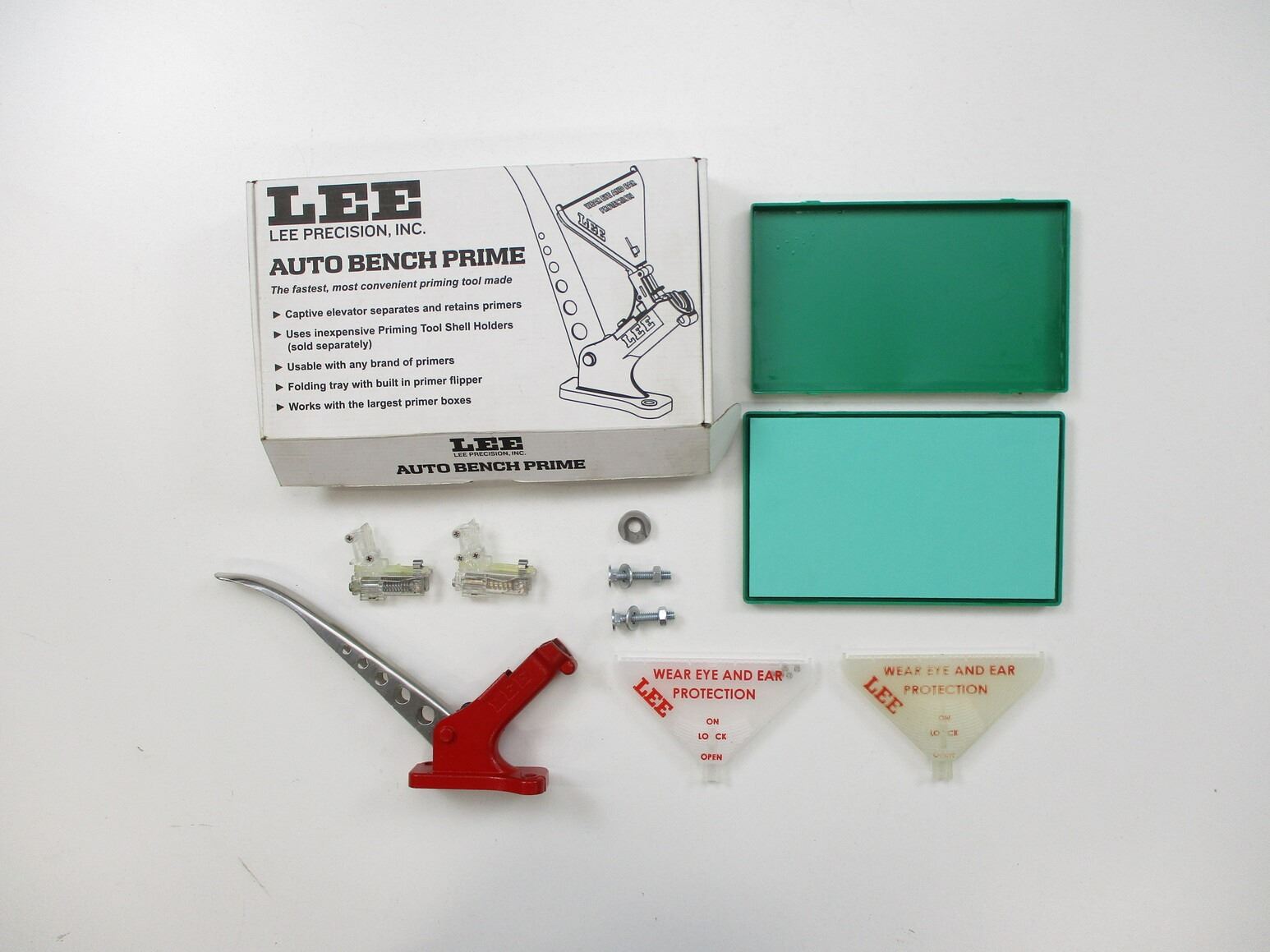 LEE AUTO BENCH PRIME AND RCBS CASE LUBE PAD LOT. LOT INCLUDES; (1) LEE AUTO BENCH PRIME, IN ORIGINAL PACKAGING, MAY REQUIRE ADJUSTMENTS AND/OR MAY NOT BE COMPLETE & (1) RCBS CASE LUBE PAD. SEE PHOTOS.