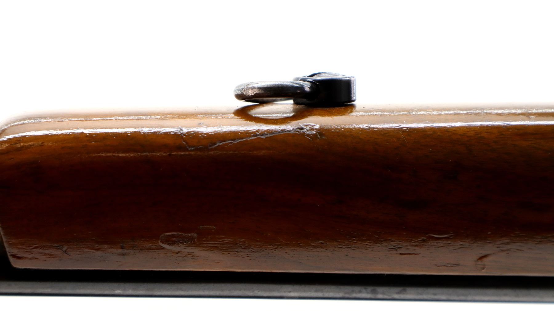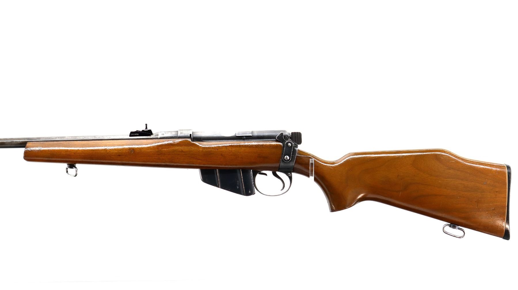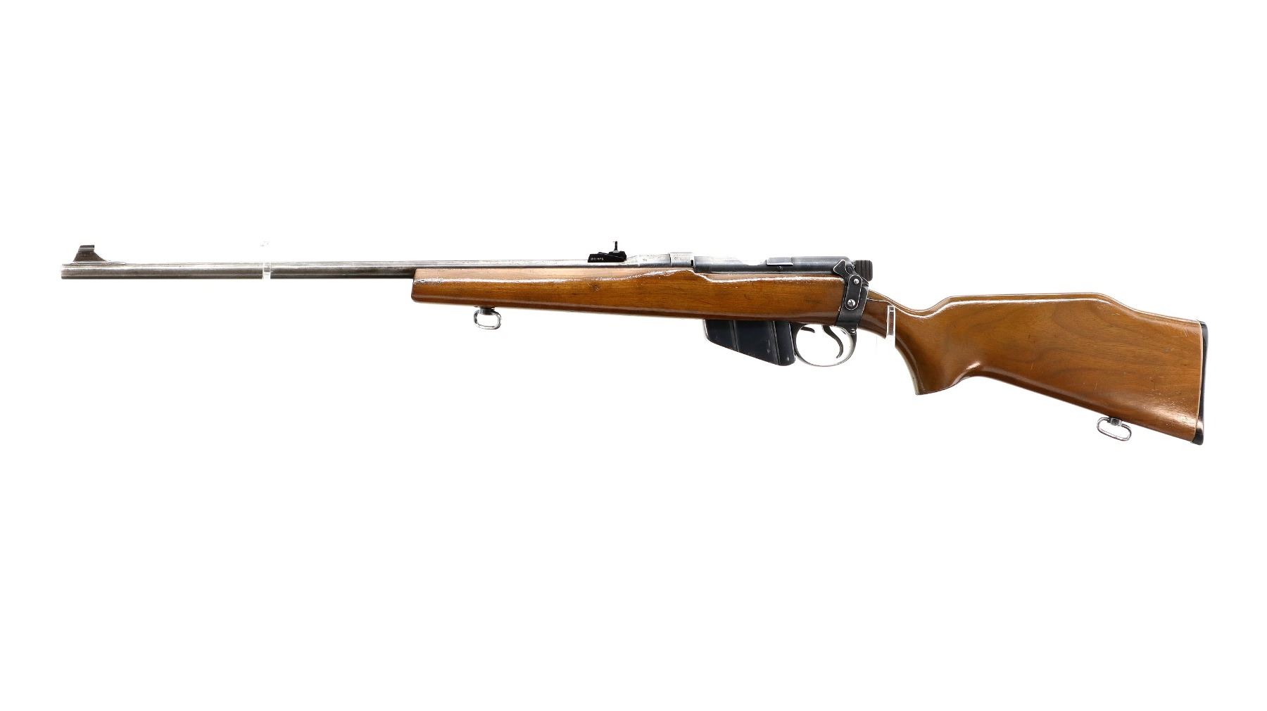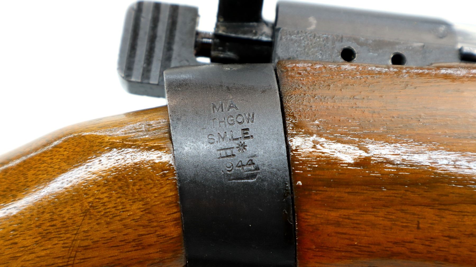 Main Description: Manufactured by Lithgow 1944, bolt matches. Blade front sight with ramp, adjustable u notched rear sight, receiver bridge removed, right side drilled and tapped with no plug screws installed. Two piece sporterized wood stocks, pistol grip, raised comb, grooved black polymer butt plate, sling swivels.