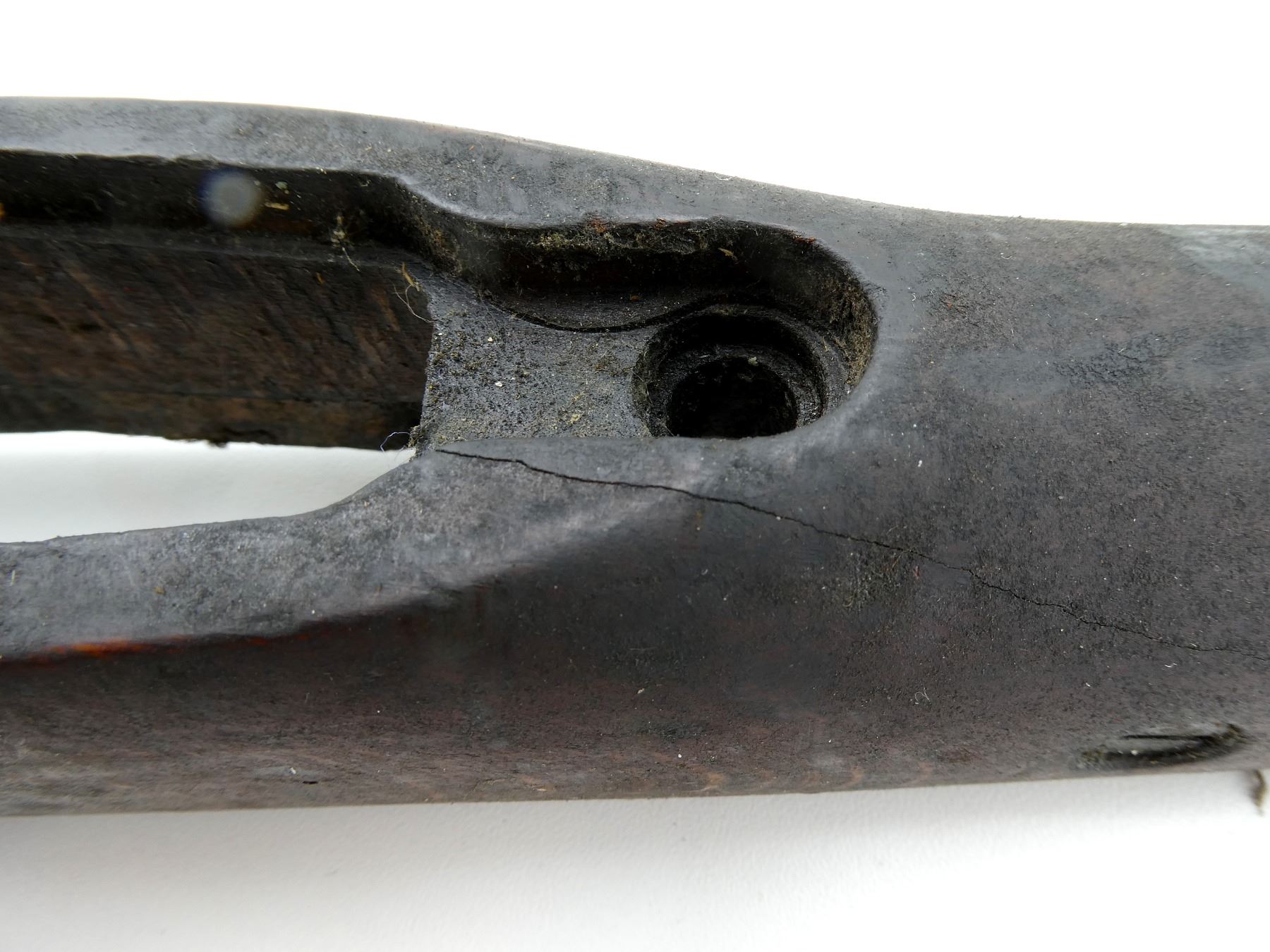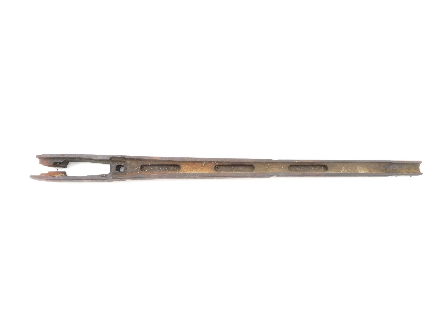 (1) WOODEN CONSTRUCTION WITH METAL FITTING, METAL FITTING SHOWS RUST, SMOOTH, UNMARKED, SHOWS WEAR / TEAR, MAY HAVE SMALL CRACKS / CHIPS, OVERALL LENGTH APPROX. 28.25". MAY REQUIRE FITTING. SEE PHOTOS.