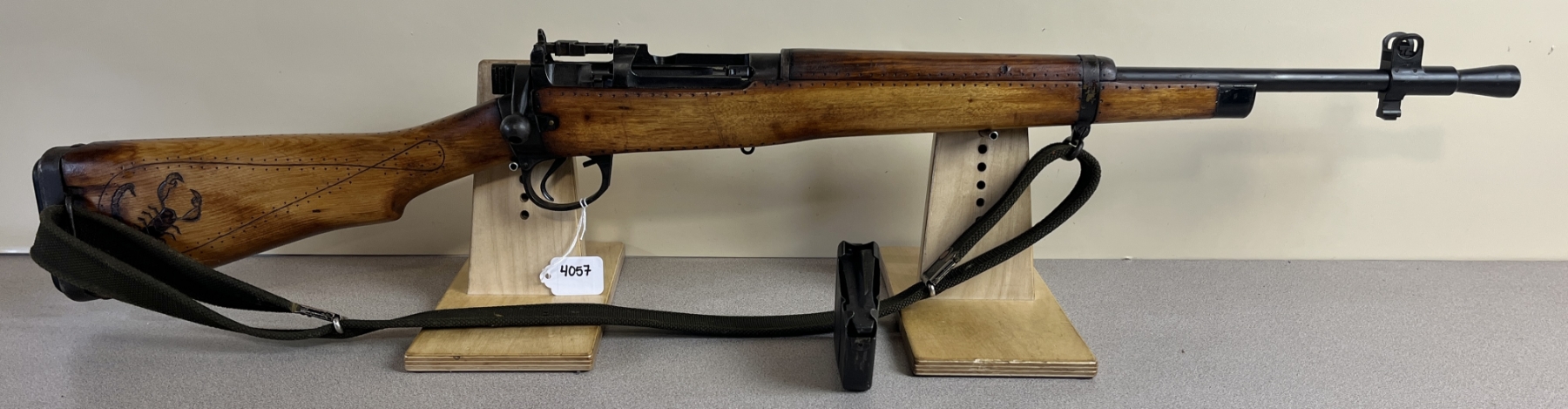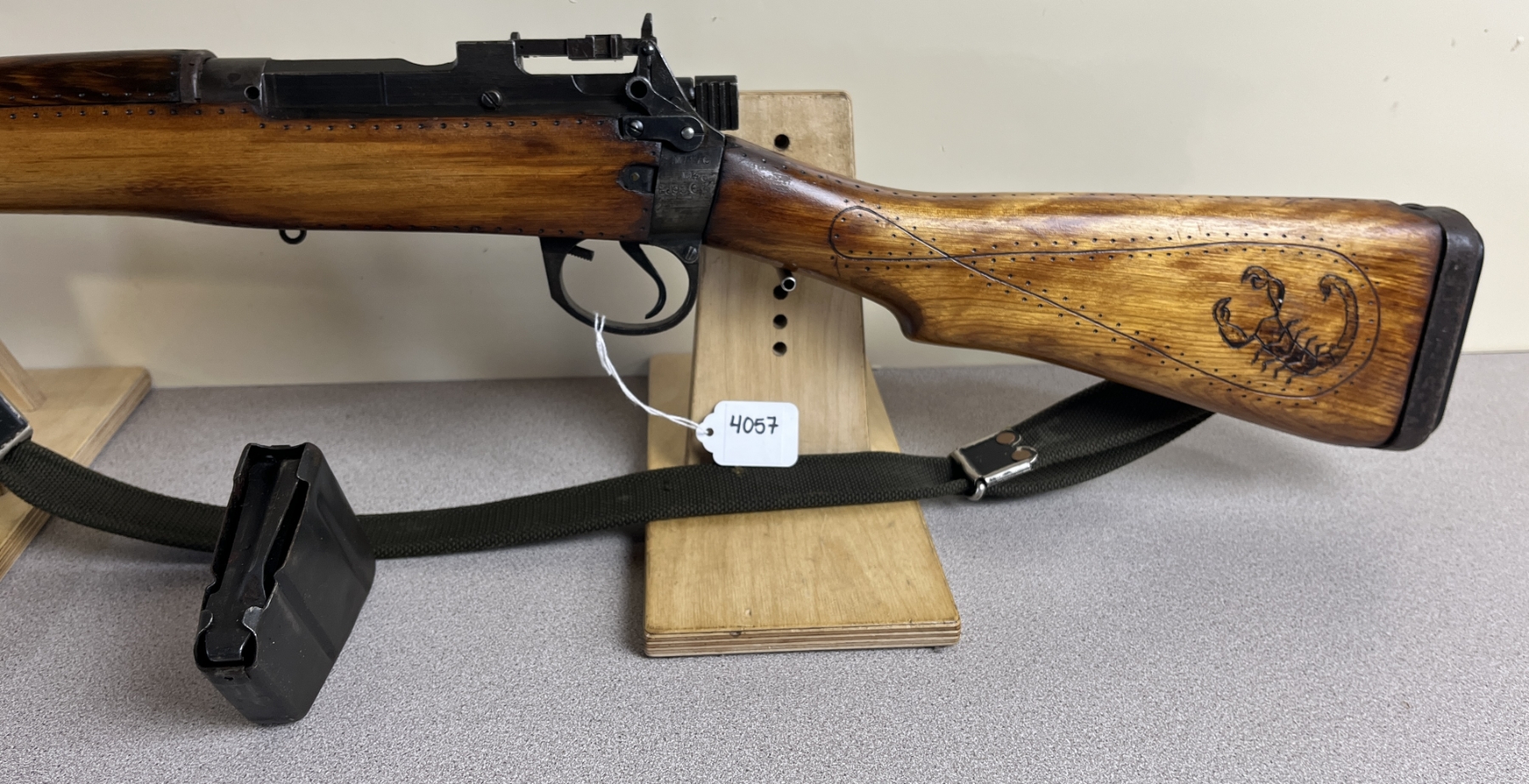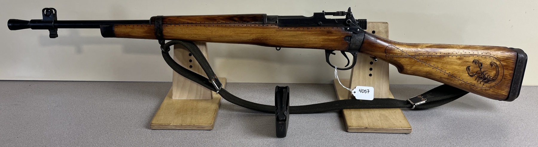 CONDITION: G OVERALL INCL BORE. SPECS: 20.5IN BBL. STOCK W/ CUSTOM ENGRAVING - DOT PATTERN W/ SCORPIONS. INCL 1X MAG. EXTRAS: CANVAS SLING. S/N: BJ9562.