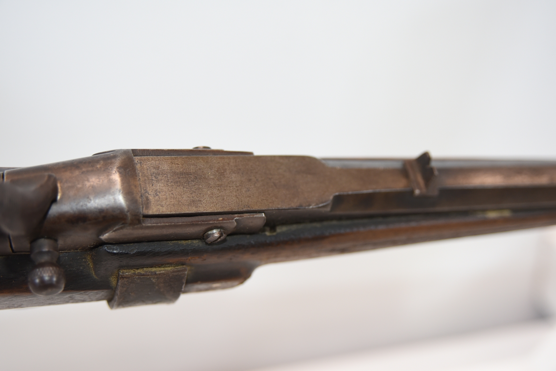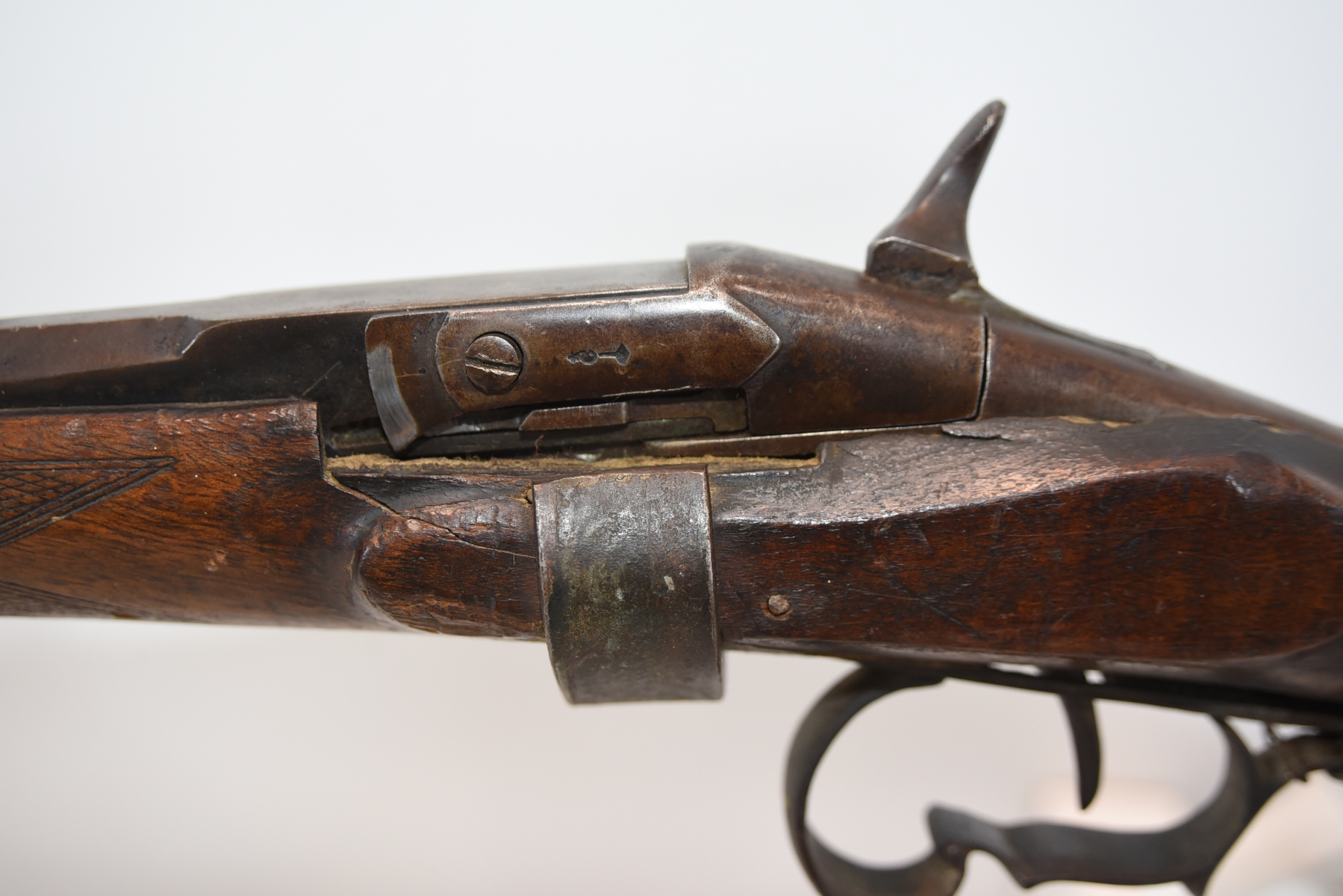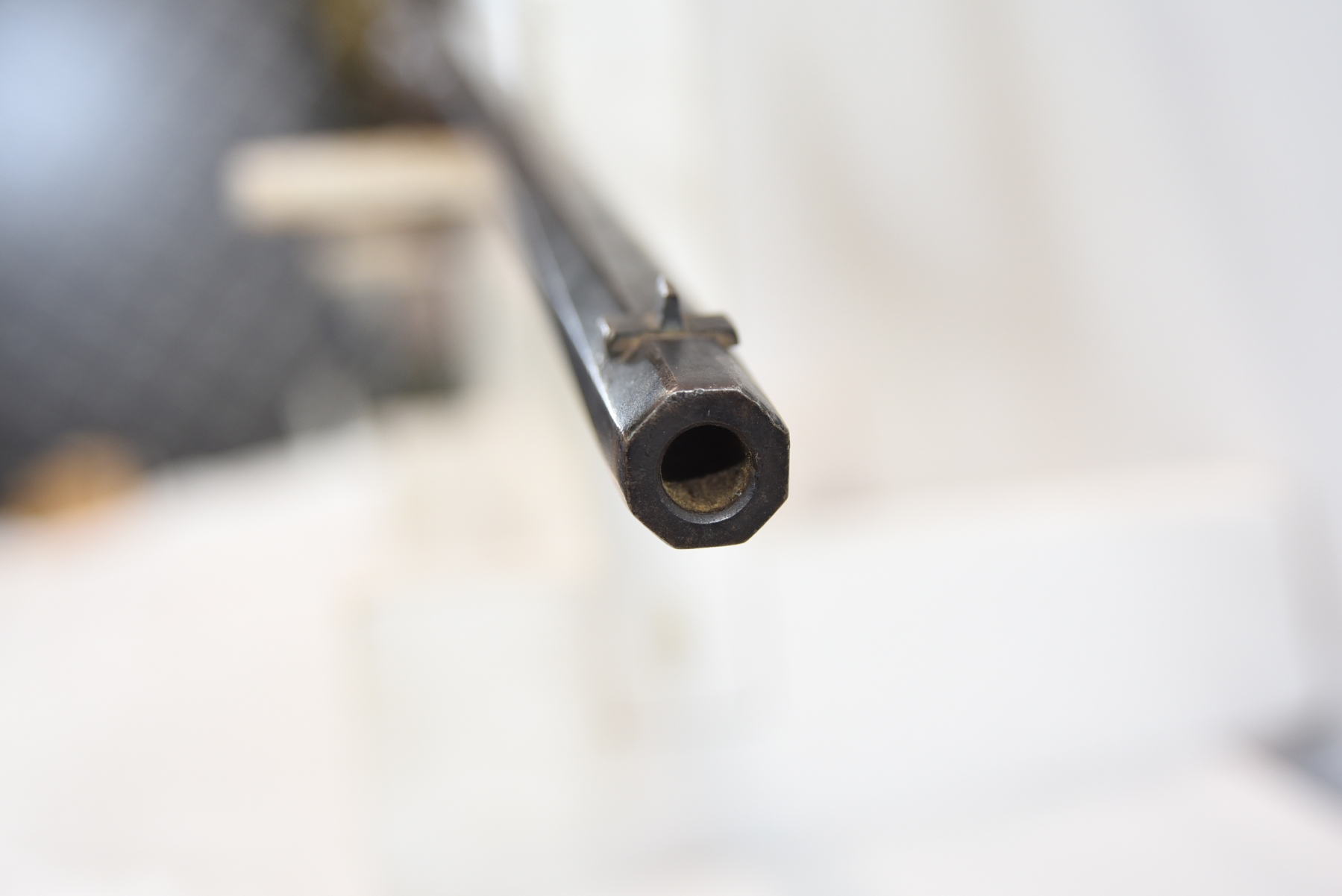 Bore is grey, lightly pitted with some rifling present; condition is less than fair.