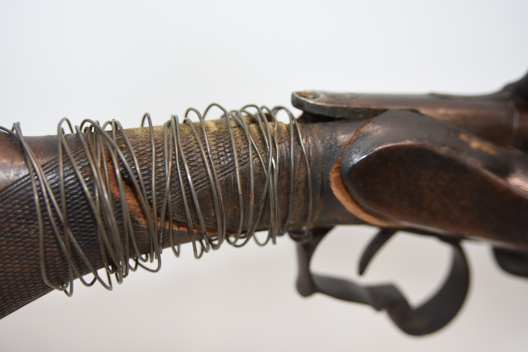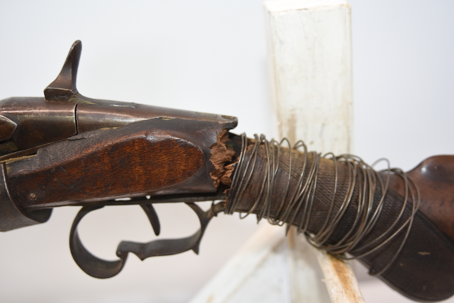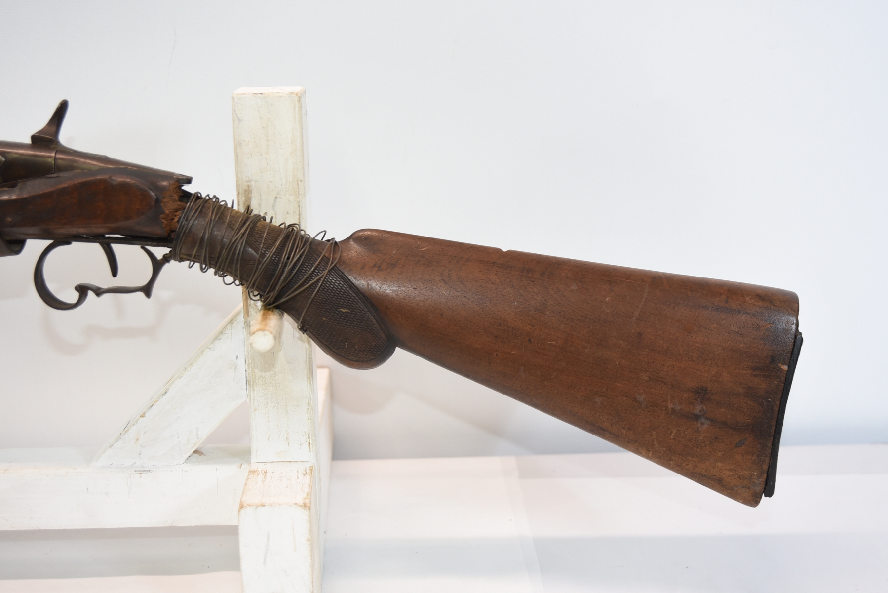 Wood stock is broken has wires wrapped around the grip area, there are also chips and cracks; condition is poor.