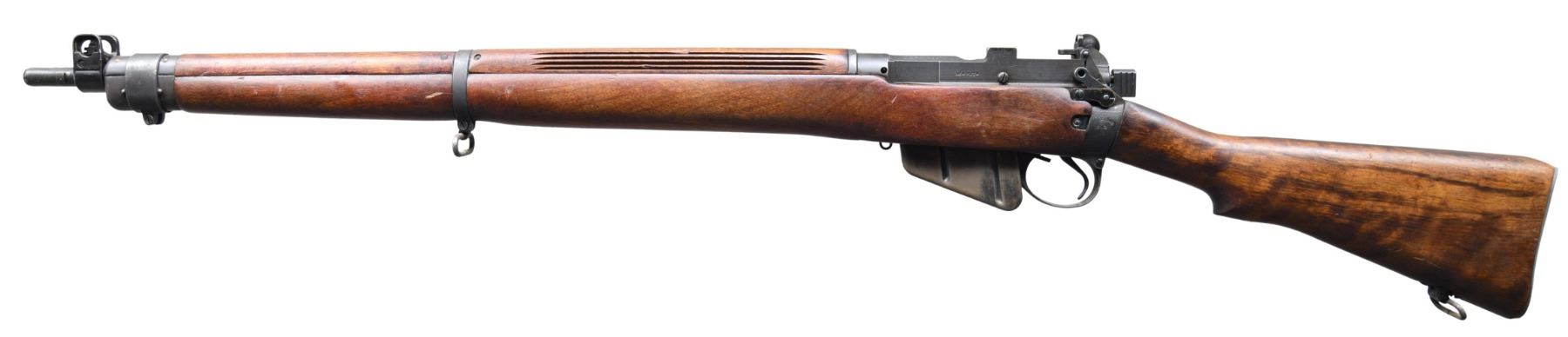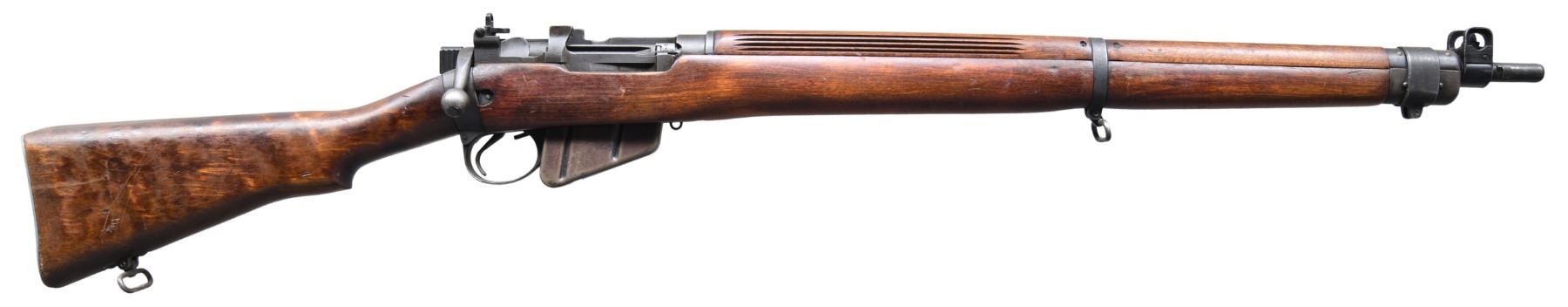 Cal. 303 Brit. S# 44C1113. Bbl. 25 1/5". Blade front sight with protective ears. Flip up aperture rear sight. Matching numbers on bolt handle & socket. Other visible parts appear unnumbered but a few parts are marked with Savage "S". Savage No. 4 MKI* Enfield rifle made for Commonwealth during WW2. Top left of reciever marked "U.S. PROPERTY". Left side of socket has serial number, 1943 date & US flaming bombs. Phosphate finish. Hardwood stock set with bottom mounted sling swivels. MAGS: 1-10 rd. marked with a Savage "S". CONDITION: stock set has arsenal type oil finish with scattered dings, scratches & handling marks. Metal retains 60% arsenal phosphate finish with some light pitting on mag body, scattered thinning, edge wear & some light oxidation. Trigger is sluggish but functional when hand cycled, possibly from internal grease. Action otherwise functions properly when hand cycled. Very good bright bore. (25-3840/MJC). CURIO. $200-400.