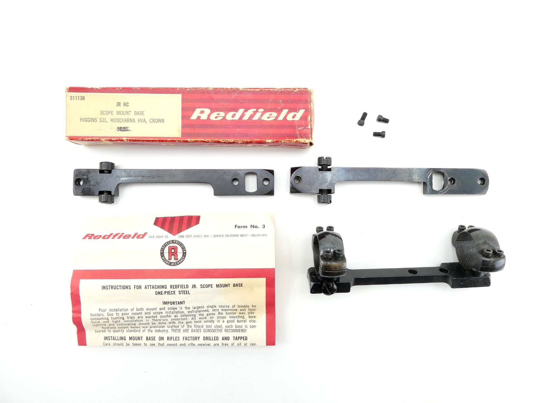 LOT INCLUDES; (1) LEUPOLD BROWNING PRE 81 BLR SCOPE MOUNT, WITH 1" DIAMETER SCOPE RINGS, (1) REDFIELD JR HC SCOPE MOUNT BASE, PRODUCT #: 511136, APPEARS NEW OLD STOCK, IN ORIGINAL PACKAGING & (1) UNKNOWN SCOPE MOUNT BASE, APPEARS NEW OLD STOCK. MAY REQUIRE FITTING. SEE PHOTOS.