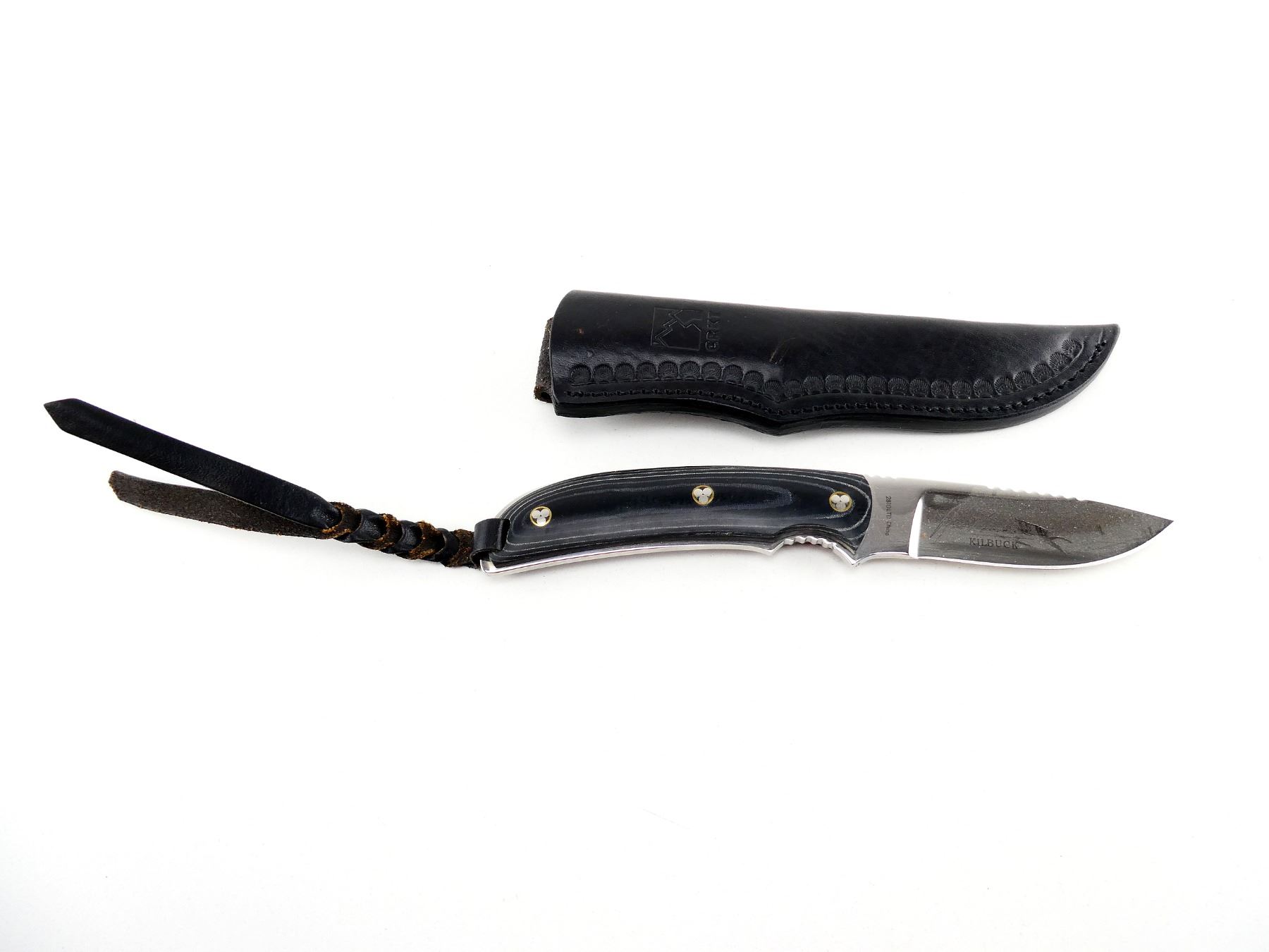 (1) STEEL BLADE, SIGNED BY DESIGNER RUSS KOMMER, MARKED "SIGNATURE LIMITED EDITION NO. 454 OF 500", ETC., MICARTA HANDLE, UNMARKED, SHOWS LIGHT WEAR & TEAR / USE MARKS, BLADE OVERALL LENGTH APPROX. 3.25", OVERALL LENGTH APPROX. 7.75", WITH BLACK LEATHER SHEATH, MARKED "CRKT". SEE PHOTOS.