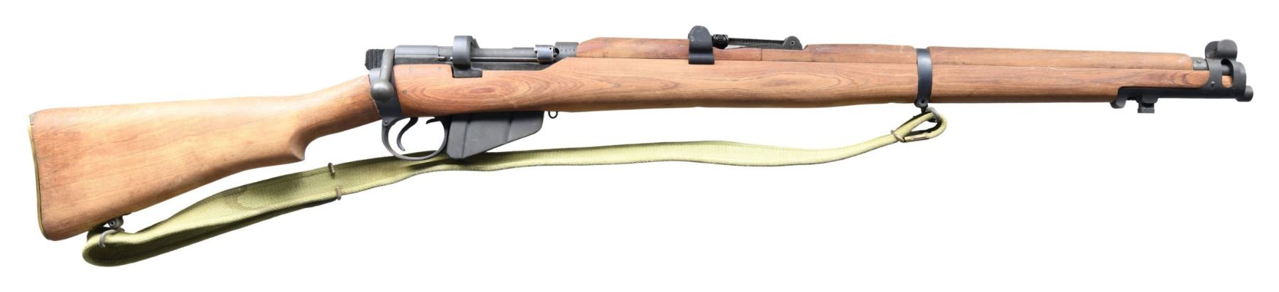 Cal. 303 Brit. S# F6404. Bbl. 25 1/5". Blade front sight with protective ears. Tangent rear sight graduated to 2000m. Matching numbers on receiver, bolt & nosecap. Other parts appear unnumbered. Right rear of receiver has Jovino import marking & rifle was likely assembled by Jovino using NOS parts. Right side of socket has Lithgow markings with 1944 date. Phosphate finish. Hardwood stock set with bottom mounted sling swivels & canvas SMLE sling. MAGS: 1-10 rd. CONDITION: hardwood stock shows an armorer reinforcement to right rear of action & some handling marks. Metal retains 95% arsenal grade phosphate with scattered edge & handling wear. Action functions properly when hand cycled. Very good bore with strong rifling. (25-3759/MJC). CURIO. $300-500.