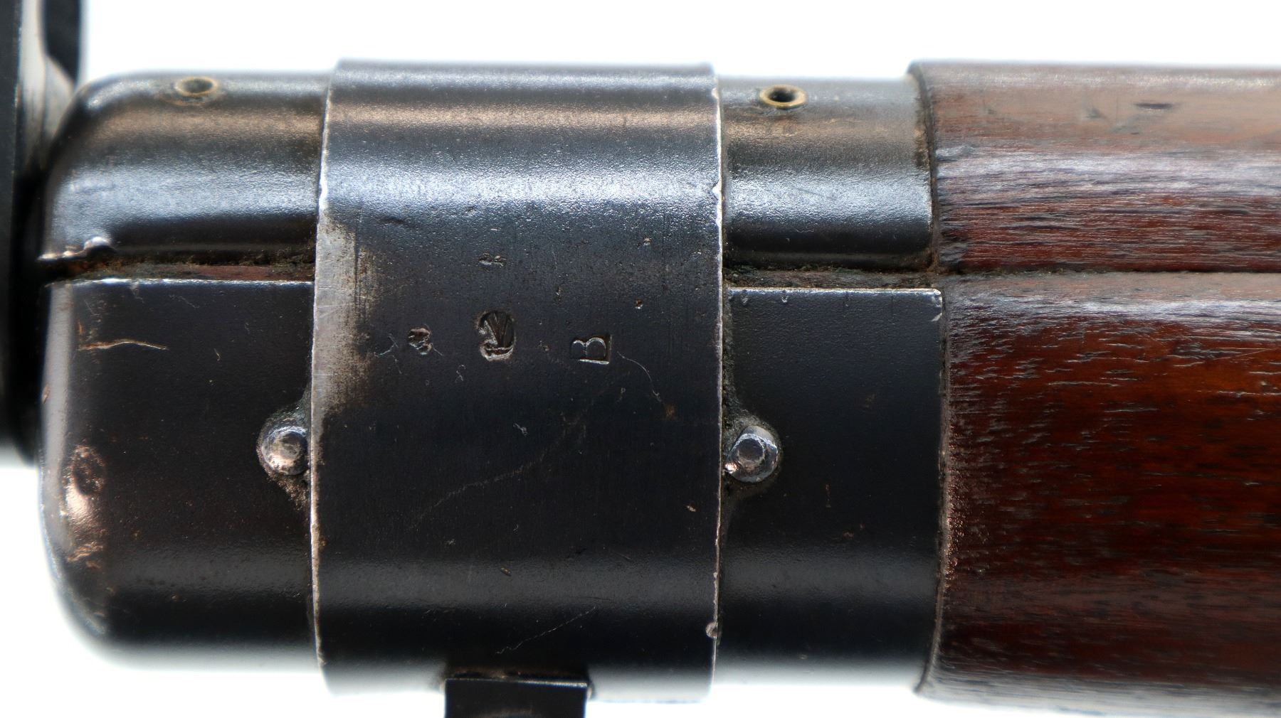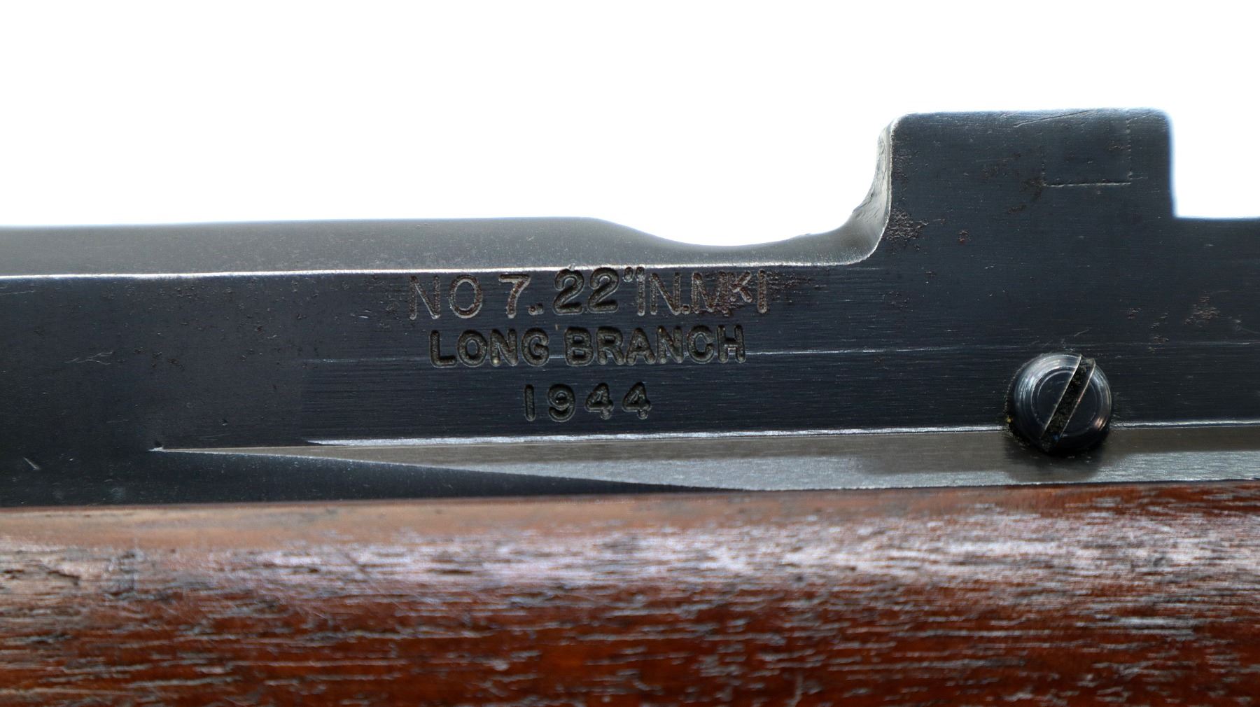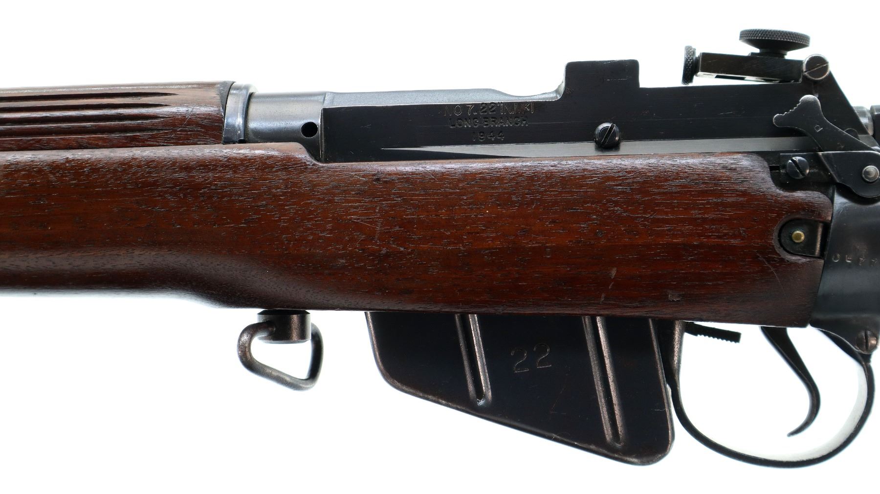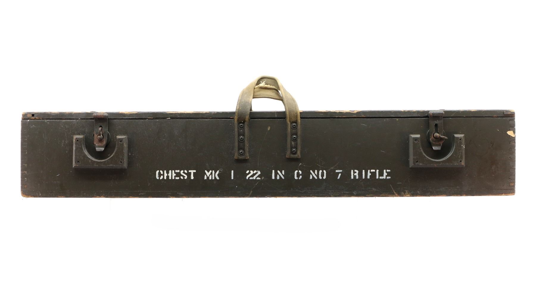 Main Description: Manufactured by Long Branch 1944, bolt matches. Blade front sight with ears and ramp, adjustable rear peep sight with correct plunger, blued finish, magazine marked 22 with single shot follower and spring. Four piece full military wood stocks, grooved rear handguard, pistol grip, smooth steel butt plate with trap, three sling swivels one has a target swivel in front of magazine, various parts have c-broad arrow and LB markings. Transit Case: Green painted marked Chest MKI 22 IN CNO7 Rifle with canvas handles and 1940? dated, Overall Length 47"
