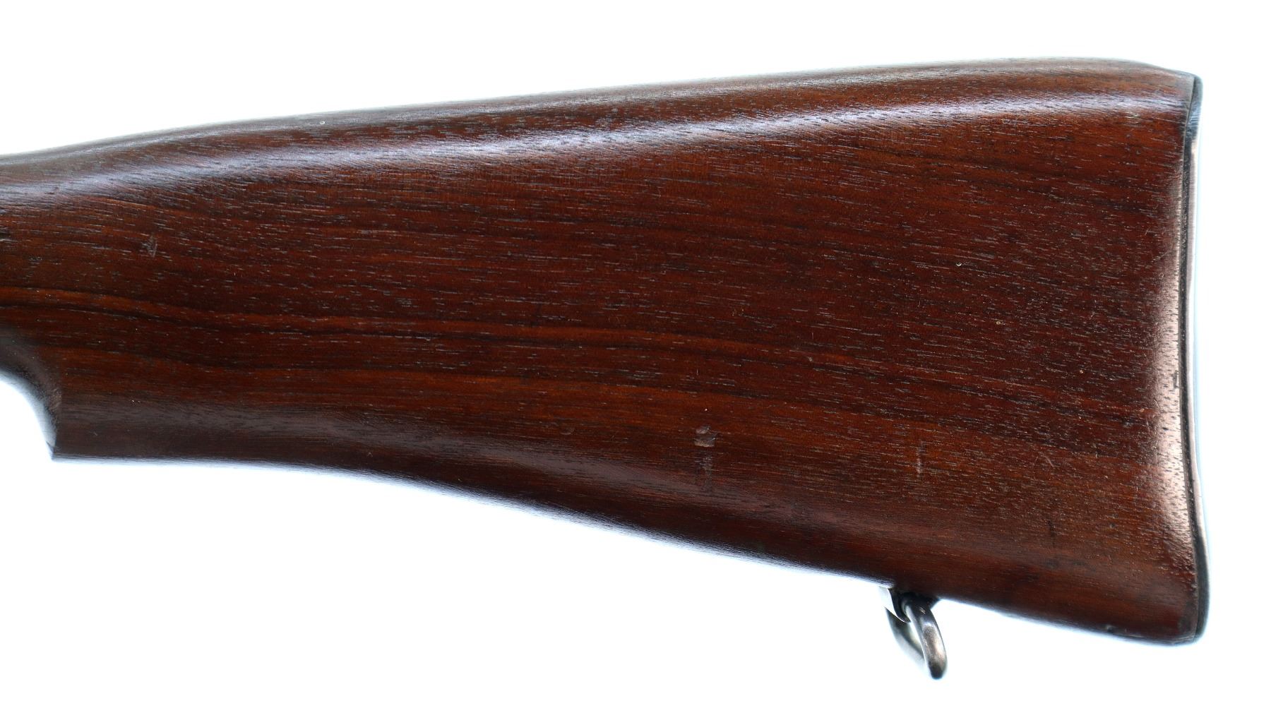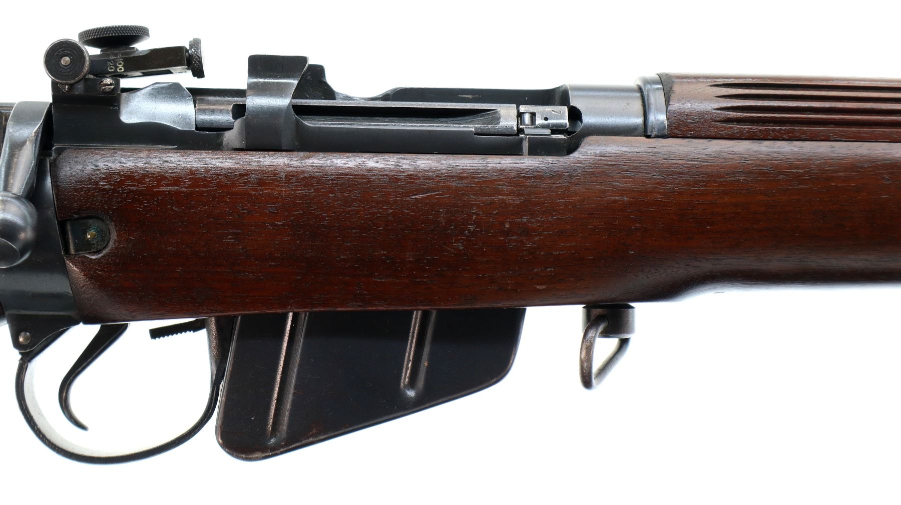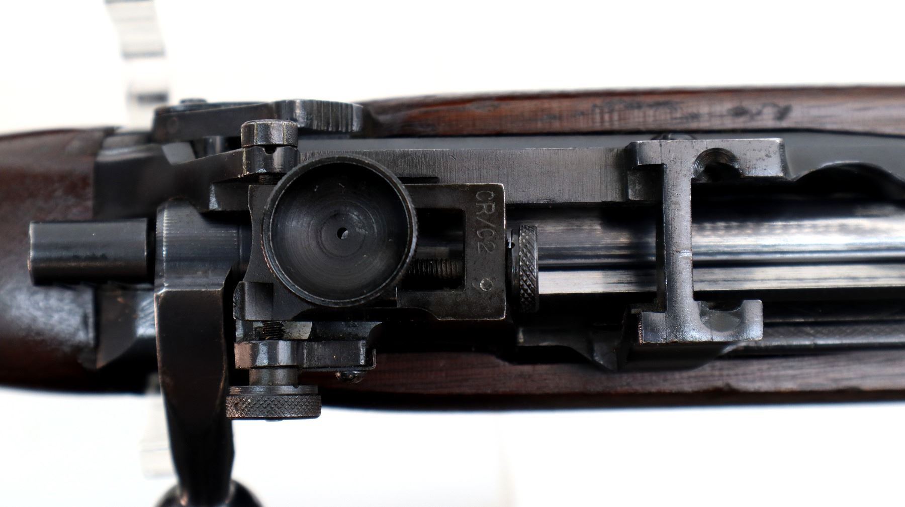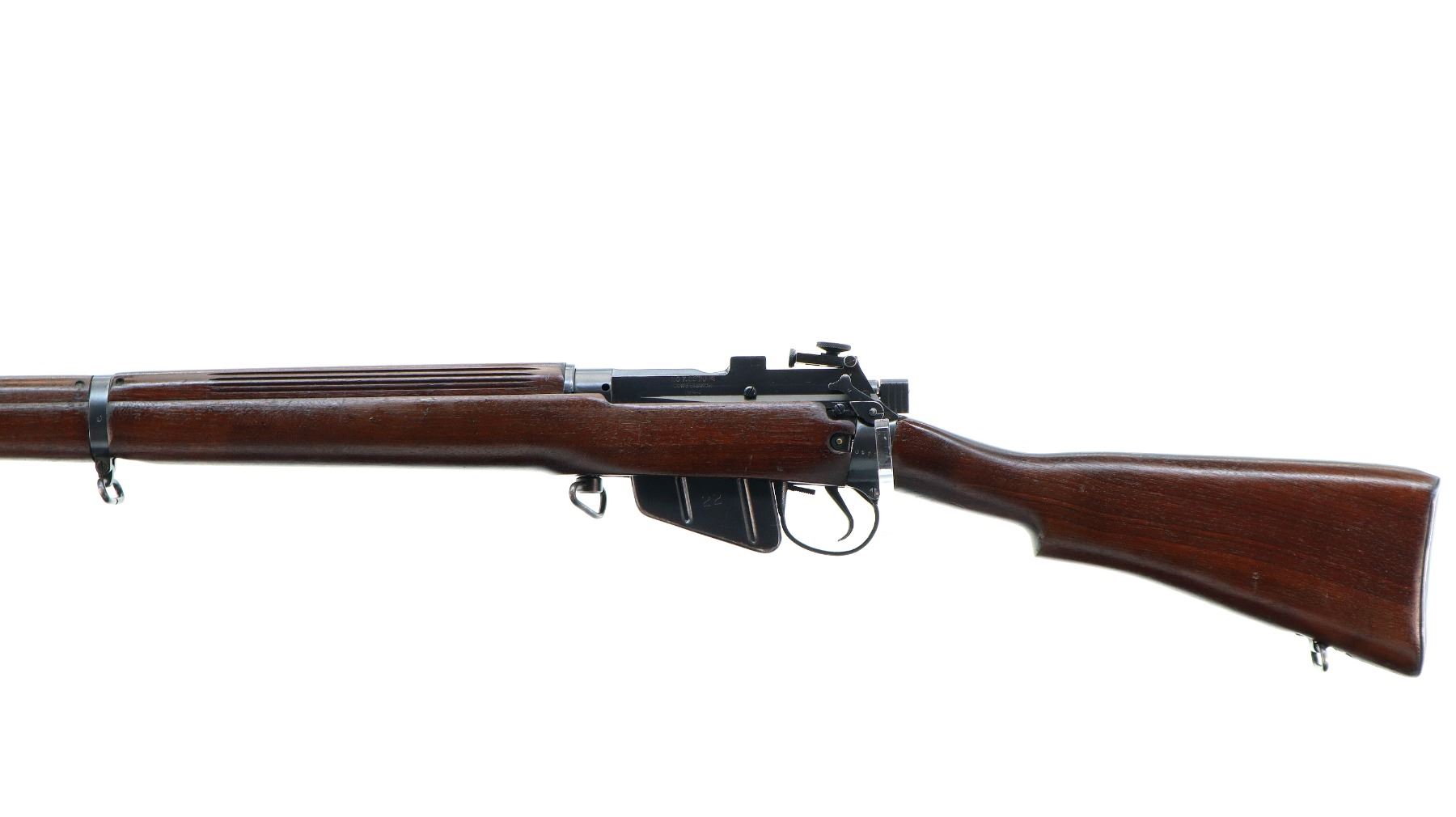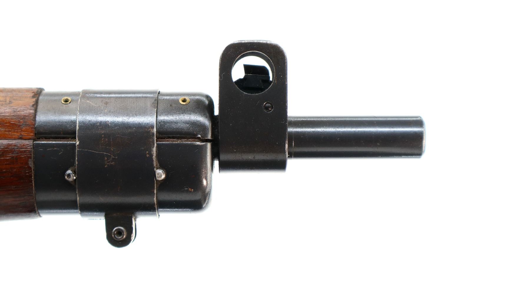 Main Description: Manufactured by Long Branch 1944, bolt matches. Blade front sight with ears and ramp, adjustable rear peep sight with correct plunger, blued finish, magazine marked 22 with single shot follower and spring. Four piece full military wood stocks, grooved rear handguard, pistol grip, smooth steel butt plate with trap, three sling swivels one has a target swivel in front of magazine, various parts have c-broad arrow and LB markings. Transit Case: Green painted marked Chest MKI 22 IN CNO7 Rifle with canvas handles and 1940? dated, Overall Length 47"