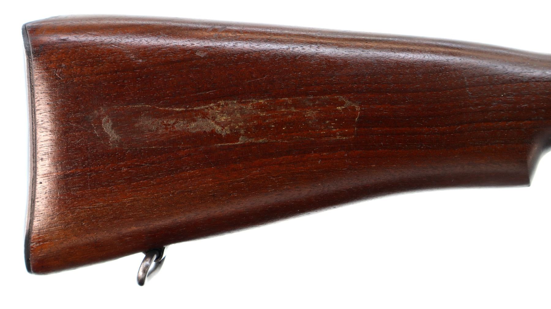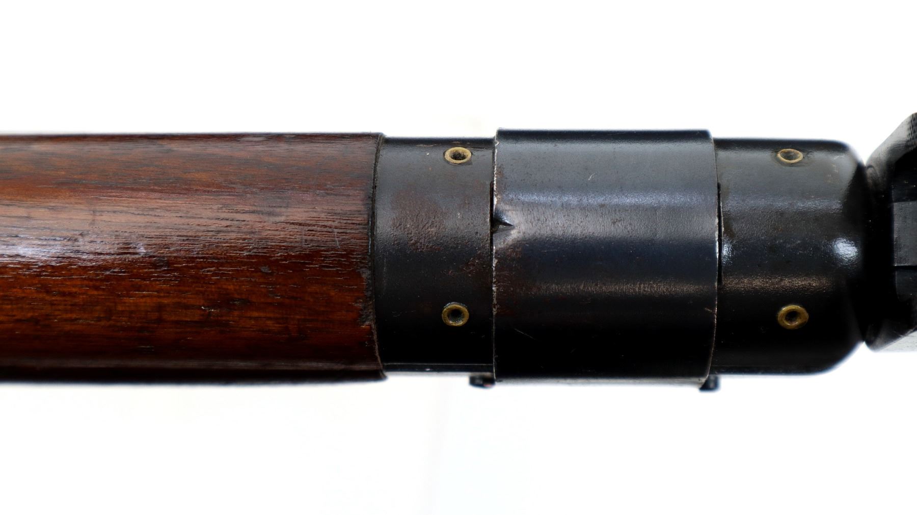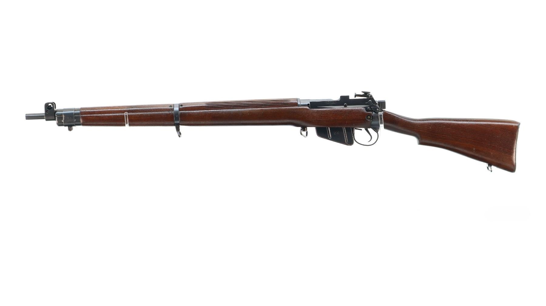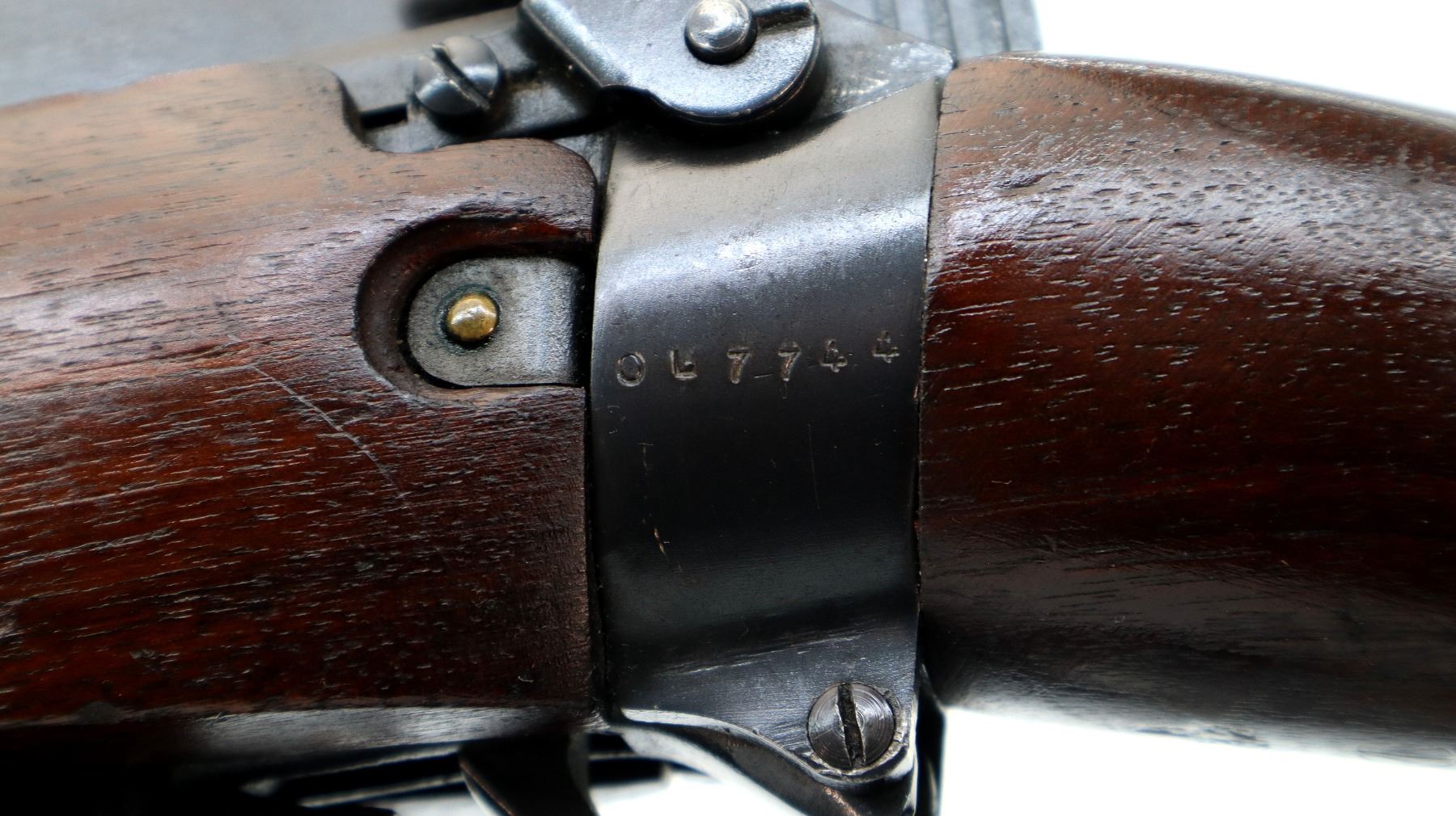 Main Description: Manufactured by Long Branch 1944, bolt matches. Blade front sight with ears and ramp, adjustable rear peep sight with correct plunger, blued finish, magazine marked 22 with single shot follower and spring. Four piece full military wood stocks, grooved rear handguard, pistol grip, smooth steel butt plate with trap, three sling swivels one has a target swivel in front of magazine, various parts have c-broad arrow and LB markings. Transit Case: Green painted marked Chest MKI 22 IN CNO7 Rifle with canvas handles and 1940? dated, Overall Length 47"