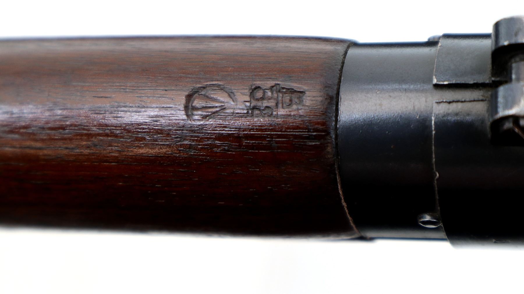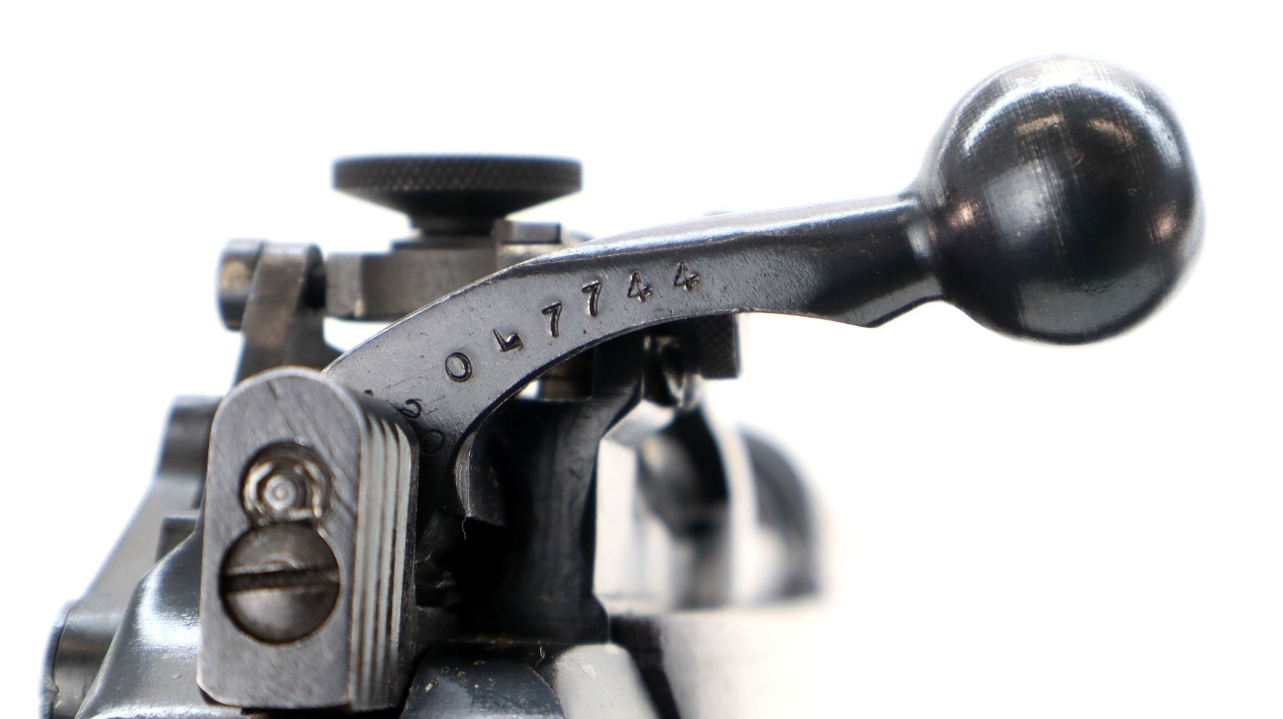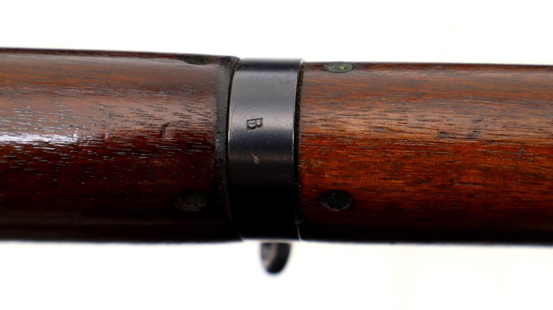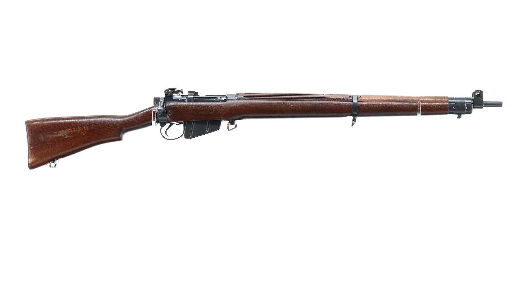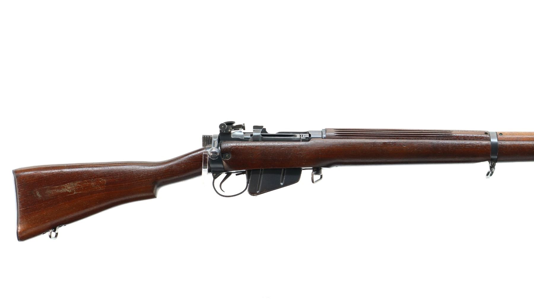 Main Description: Manufactured by Long Branch 1944, bolt matches. Blade front sight with ears and ramp, adjustable rear peep sight with correct plunger, blued finish, magazine marked 22 with single shot follower and spring. Four piece full military wood stocks, grooved rear handguard, pistol grip, smooth steel butt plate with trap, three sling swivels one has a target swivel in front of magazine, various parts have c-broad arrow and LB markings. Transit Case: Green painted marked Chest MKI 22 IN CNO7 Rifle with canvas handles and 1940? dated, Overall Length 47"