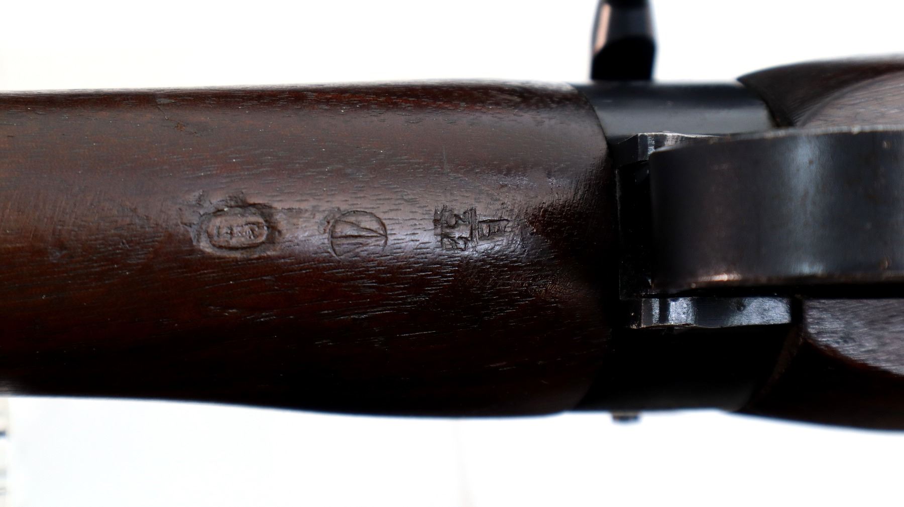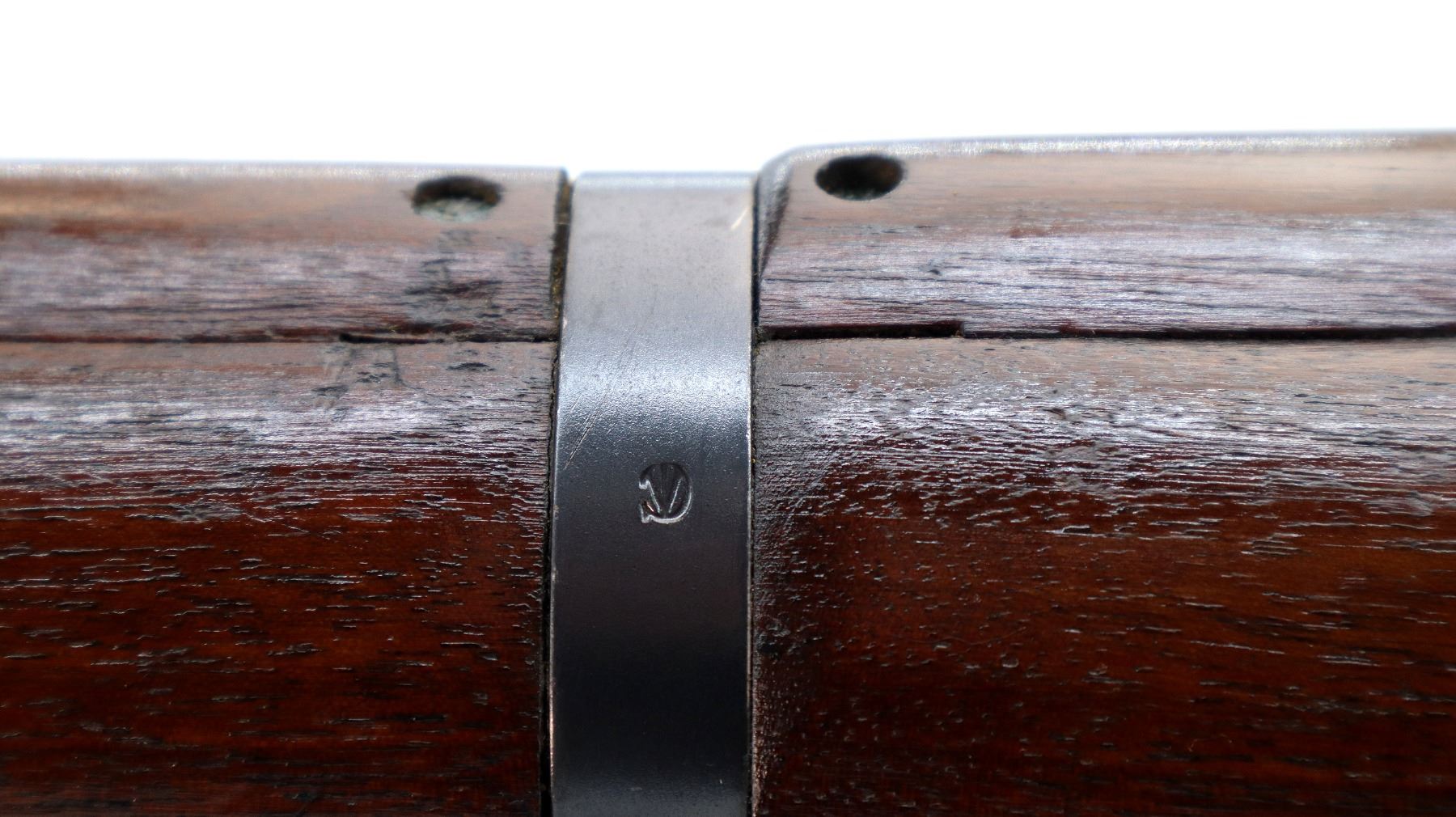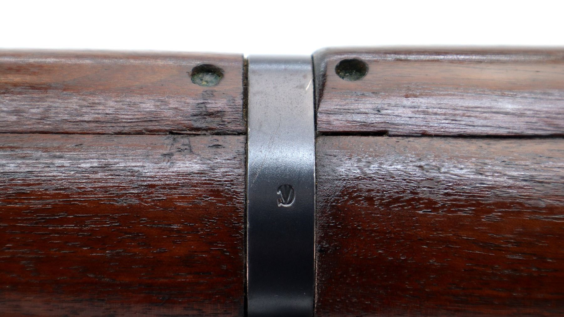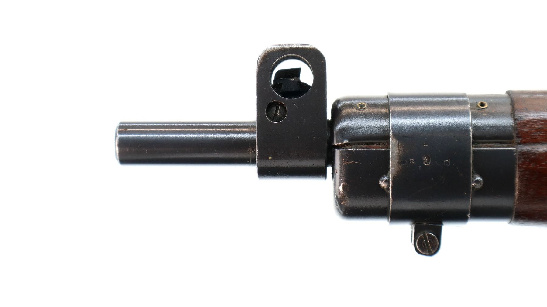 Main Description: Manufactured by Long Branch 1944, bolt matches. Blade front sight with ears and ramp, adjustable rear peep sight with correct plunger, blued finish, magazine marked 22 with single shot follower and spring. Four piece full military wood stocks, grooved rear handguard, pistol grip, smooth steel butt plate with trap, three sling swivels one has a target swivel in front of magazine, various parts have c-broad arrow and LB markings. Transit Case: Green painted marked Chest MKI 22 IN CNO7 Rifle with canvas handles and 1940? dated, Overall Length 47"
