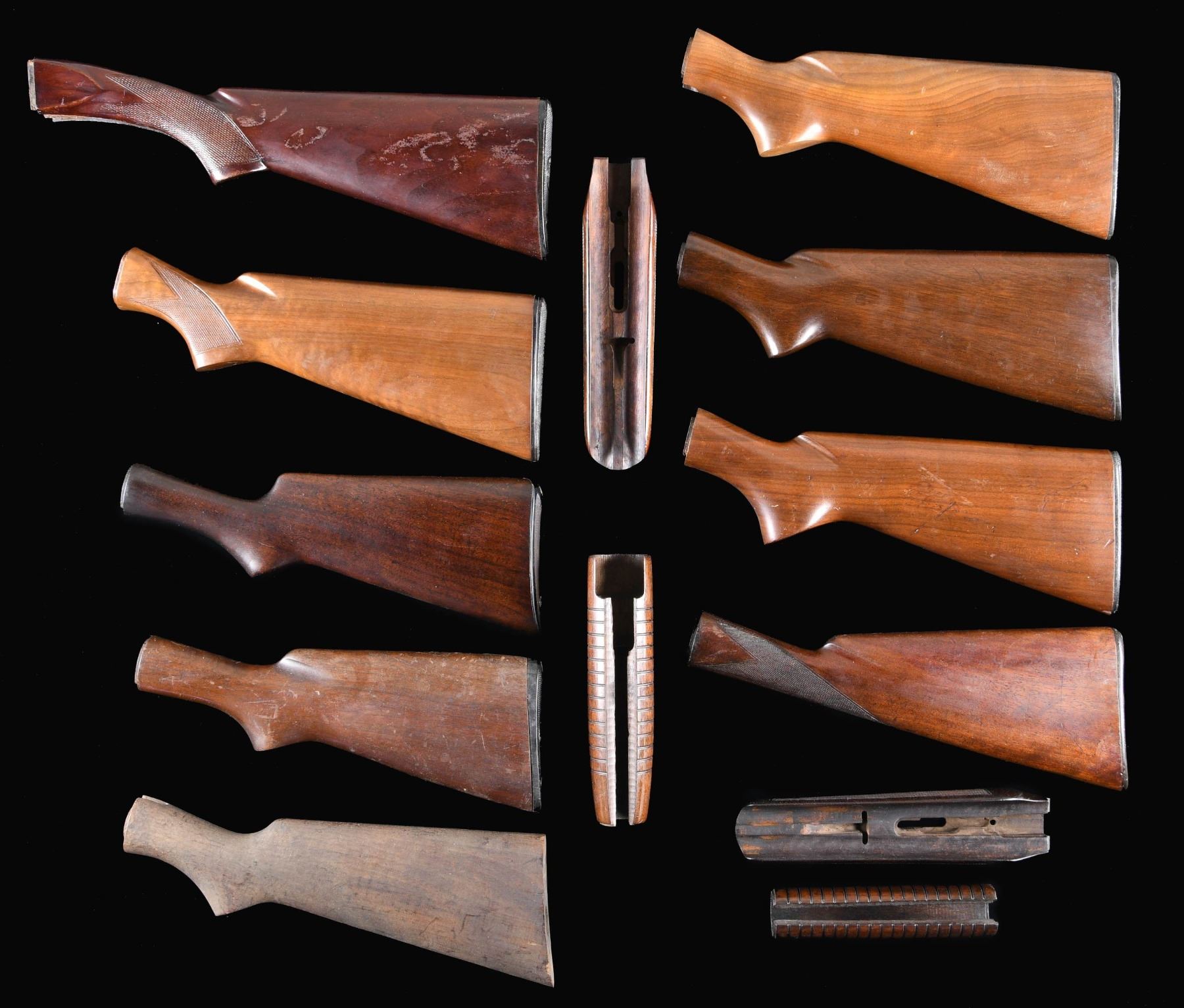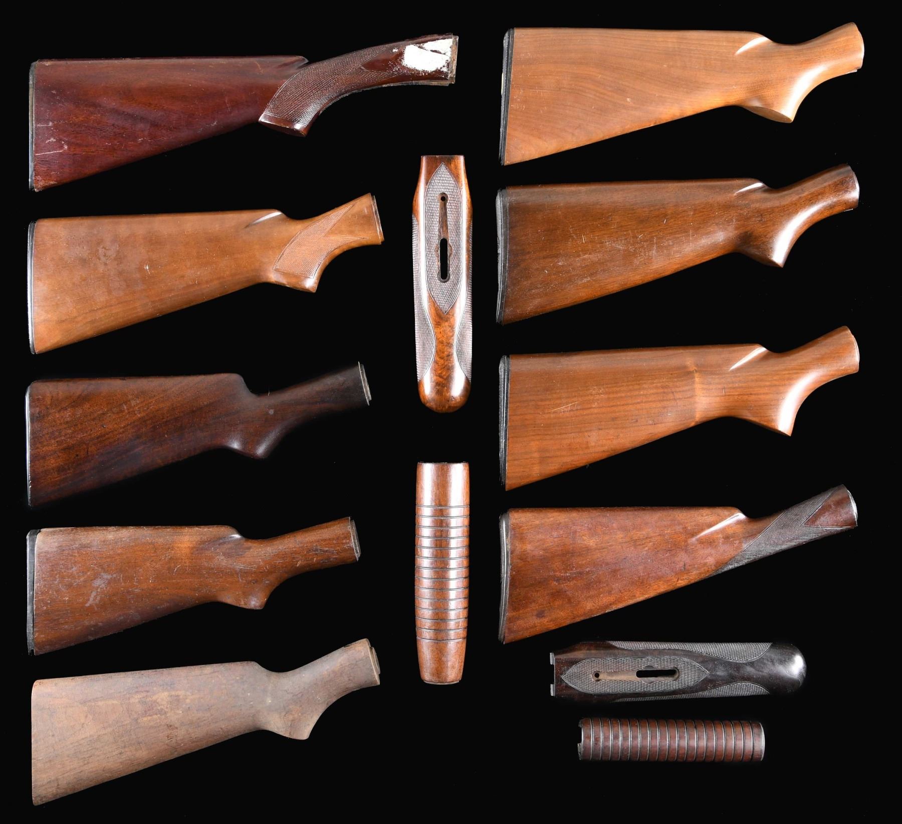 SHOTGUNS. Lot consists of: (1.) Model 21 Field style buttstock. Stock is full length with original buttplate. CONDITION: sanded and refinished stock has dark finish showing wear spots with partially filled checkering. Stock has small chips left of and behind the top tang. (2.) Model 21 12 GA beavertail forearm with kidney pattern checkering. CONDITION: both sides of stock have added wood repairs along the rear edges of the bbl. channels. Good checkering with light coat of added finish over handling marks. (3.) Model 21 12 GA beavertail forearm with kidney pattern checkering. CONDITION: forearm has a dark almost black refinish and retains good checkering. (4.) Model 12 straight grip Tournament Grade stock with original buttplate. CONDITION: sanded and refinished stock shows numerous scratches and marks with small chips and hairline crack having an area of epoxy repair on left side. (5.) Model 12 12 GA Field Grade stock with early style pistol grip and original checkered hard rubber buttplate with circular logo. CONDITION: stock has lightly worn original finish showing scattered scratches and marks. (6.) Model 12 12 GA late style Field Grade stock with flat bottom pistol grip. Stock is full length with original checkered black plastic buttplate and straight "WINCHESTER" marking. CONDITION: Stock has moderately worn finish showing numerous scratches and marks with a small chip at the toe. (7.) Model 12 12 GA Field Grade stock with late style flat bottom pistol grip. Original checkered plastic buttplate has straight line "WINCHESTER" marking. CONDITION: good original finish showing light spots of wear with scattered small handling marks. (8.) Model 12 12 GA large rnd. grooved forend. CONDITION: worn original finish showing scratches and marks with a small chip on left side of front edge. (9.) Model 42 Field Grade semi-inletted stock with storage darkened unfinished appearance. CONDITION: stock has small chips and grain cracks in butt area. (10.) Model 97 pistol grip Field Grade stock with checkered steel buttplate. CONDITION: sanded and refinished stock shows scattered scratches and marks. Buttplate has a bright high polished reblued finish. (11.) Model 97 12 GA Field stock with flat bottom pistol grip. Stock is cut very short with poorly trimmed reattached buttplate. CONDITION: finish shows wear with dents and handling marks having a large chip at the comb. (12.) Model 97 rnd. grooved forearm. CONDITION: sanded and refinished forearm has a crack extending from front edge and shows small handling marks. (13.) Model 50 or 59 12 GA pistol grip stock. Stock is full length with original checkered buttplate having straight line "WINCHESTER" marking. CONDITION: stock retains lightly worn finish and checkering showing a few small marks. (02-24462-4/DS). $500-900.