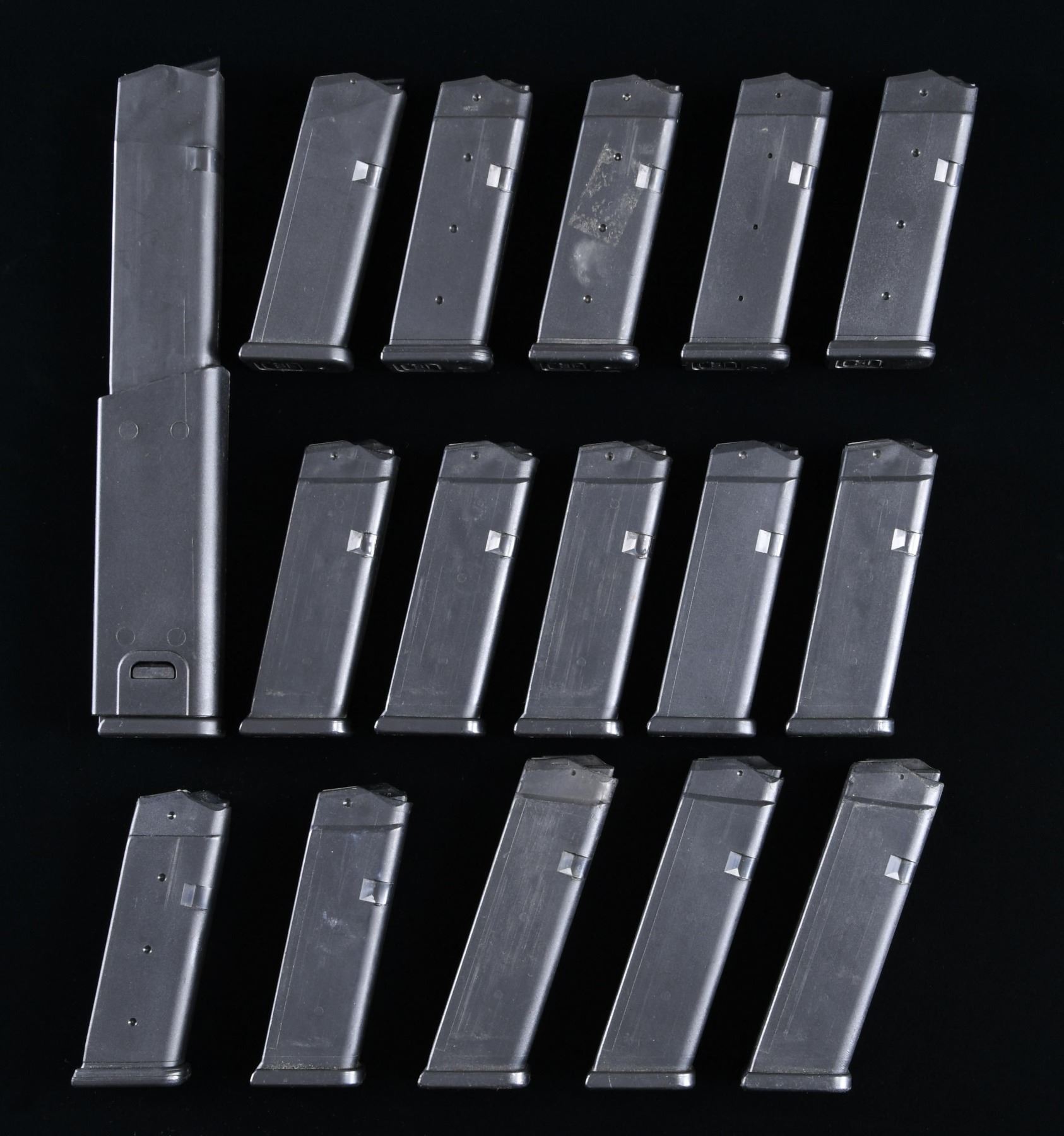 Lot of 16 assorted Glock mags., including: 1) 5 commercial Glock 9x19mm 15-rd. mags. (1 appears to have a spacer and stops at 13-rds.). 2) 3 LEO marked Glock 9x19mm 17-rd. mags. 3) 1 LEO marked Glock 9x19mm 15-rd. mag. 4) 6 LEO marked Glock .40 S&W 13-rd. mags. 5) 1 Glock .45 ACP 30-rd. mag. with MagEx extension. CONDITION: mags. are good, exhibiting some wear and scattered superficial marks from handling and storage. 1 non-LEO marked 9x19mm mag. exhibits cracking on the spine. (02-24236/MLW). $200-300.