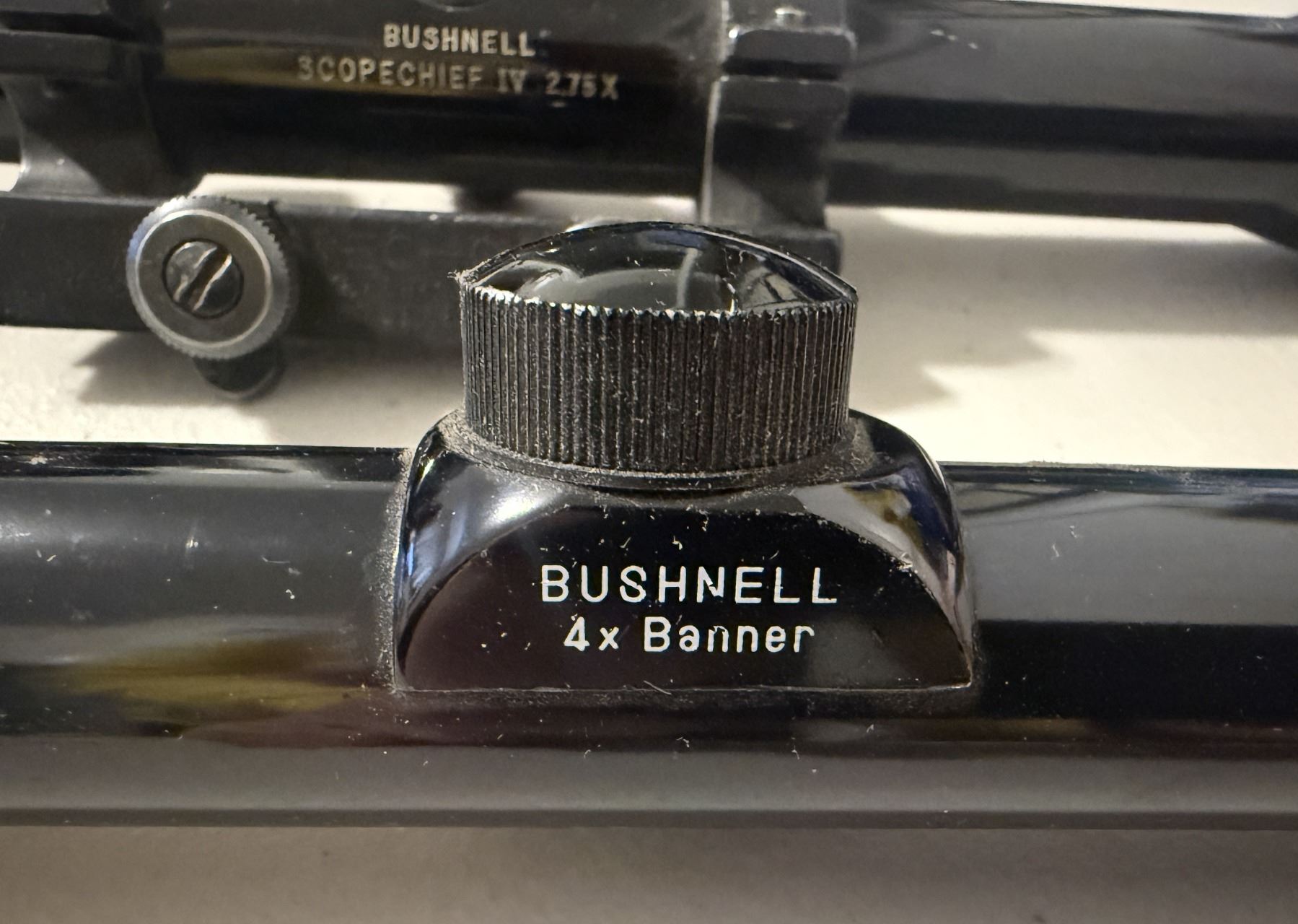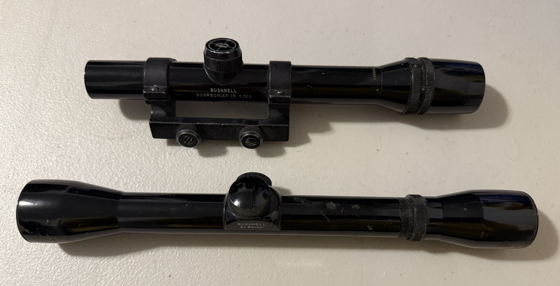 Lot of two vintage rifle scopes featuring vintage Bushnell optics, ideal for collectors, project rifles, or anyone restoring classic hunting setups.