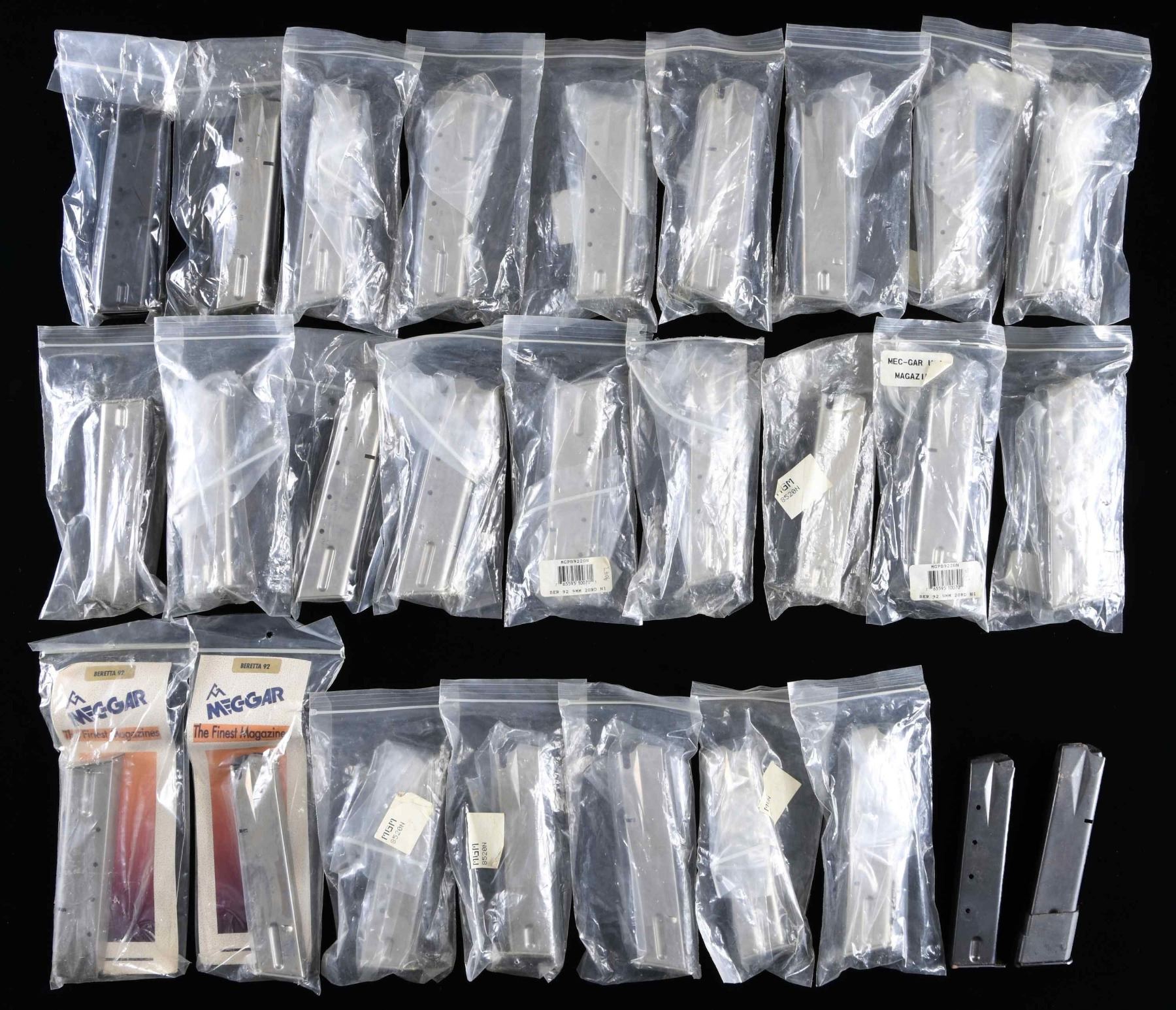 Lot 27 assorted Beretta mags. Most mags. exhibit a stainless steel finish, with all but 2 mags. remaining in plastic packaging. CONDITION: mags. are very good overall, with 1 blued mag. exhibiting a few spots of light surface oxidation. (02-24237/MLW). $300-400.