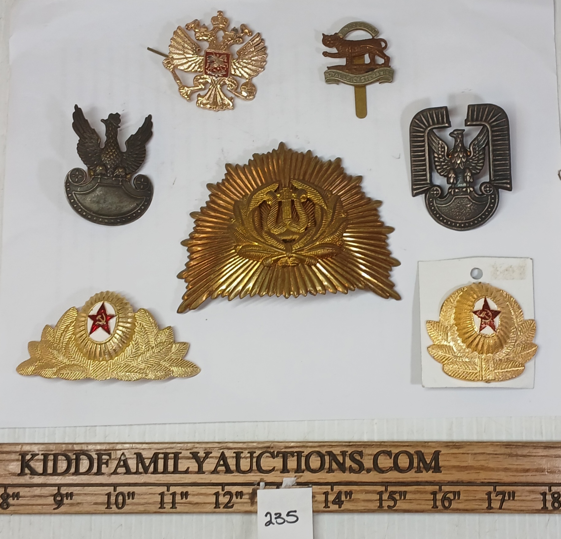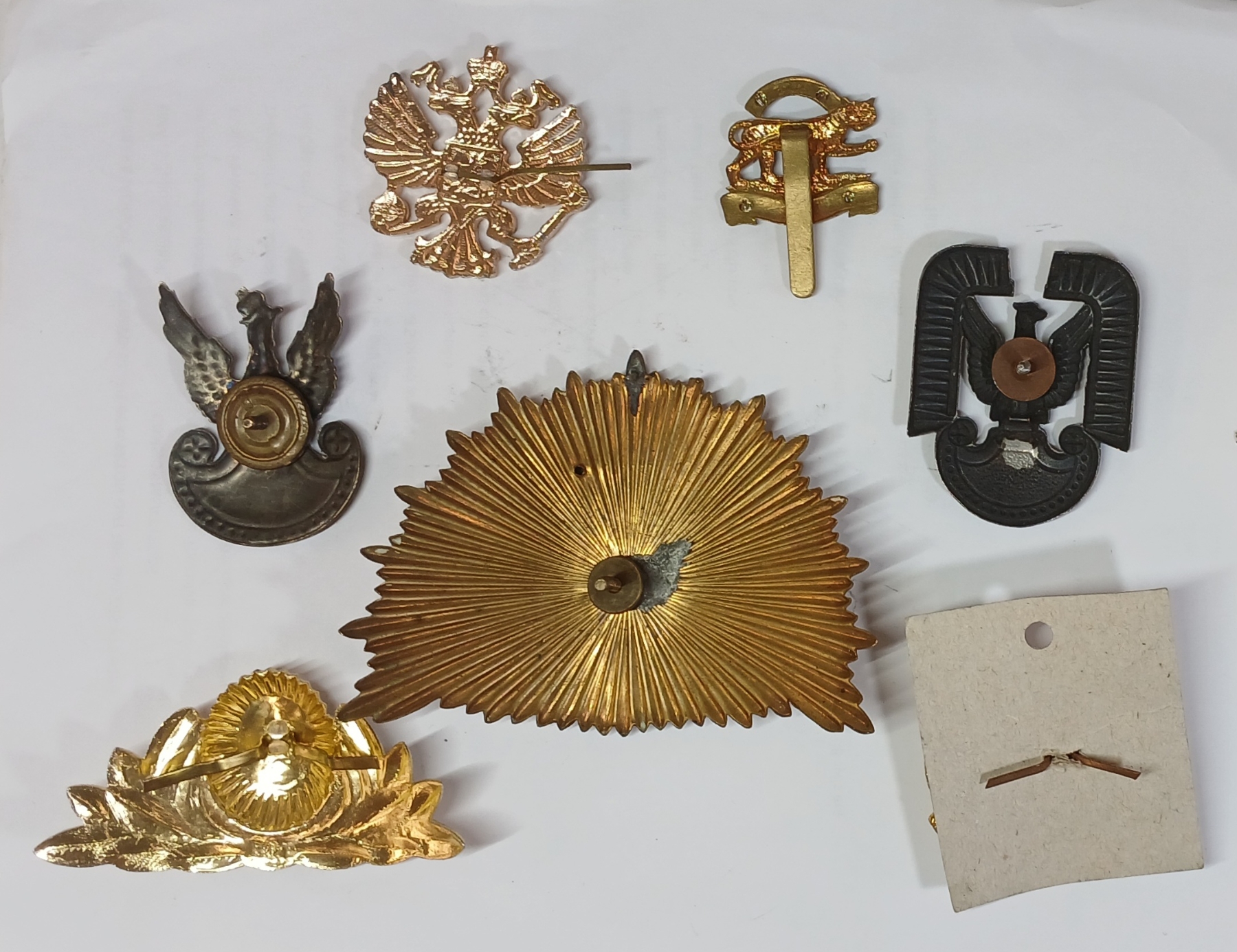 LOT OF 7 - BADGES - INCL RUSSIAN CAP BADGES, SOVIET POLICE, POLISH ARMY & ROYAL LEICESTERSHIRE