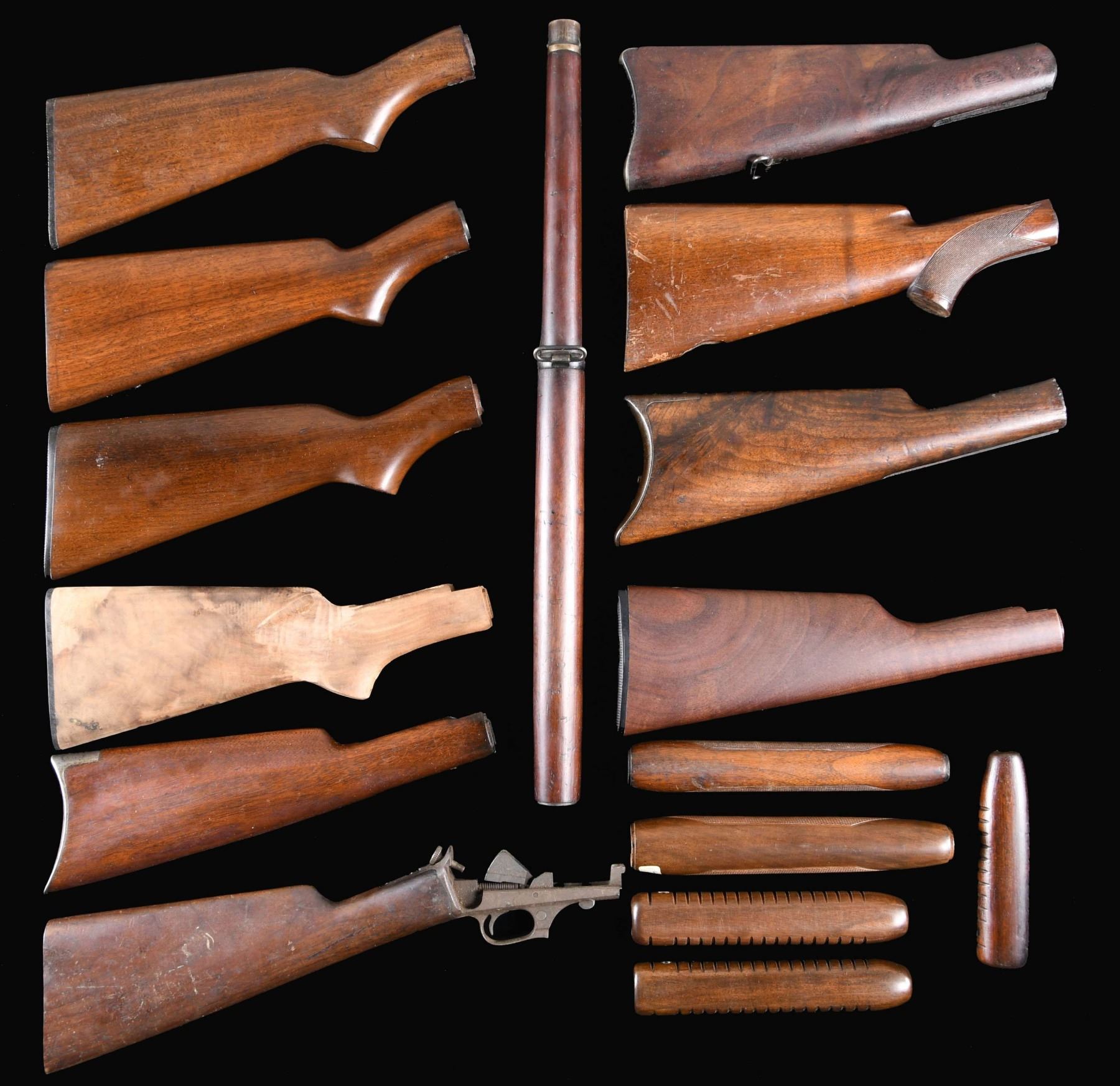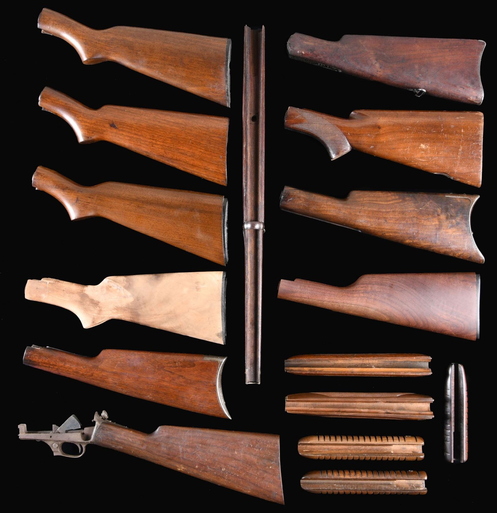 WNCHESTER PRE-64 RIFLES. Lot consists of: (1.) Model 1886 rifle buttstock of nicely grained walnut with original crescent steel trapdoor buttplate. CONDITION: sound, age darkened worn appearance with numerous scratches, marks, and small dents. (2.) Model 1895 rifle stock with crescent steel buttplate. CONDITION: lightly sanded and refinished wood shows a few small marks. (3.) Model 64 Deluxe stock and walnut forearm with standard factory checkering. Steel buttplate, plastic grip cap, and inletted rear swivel base are not present. CONDITION: lightly worn original finish and checkering showing numerous scratches, dents, and marks. Left side of forearm has a hairline crack extending from the tip. (4.) Model 71 Deluxe checkered walnut forearm. CONDITION: near new, appears unused. (5.) Model 94 Post-64 walnut stock with plastic buttplate. CONDITION: near new showing small handling marks, appears unused. (6.) Semi-inletted walnut stock for a Post-64 Model 64 with reproduction plastic buttplate. CONDITION: stock is unfitted showing small chips at corners of bottom tang. (7.) Model 61 Pre-War stock. Checkered steel buttplate is not present. CONDITION: stock is heavily sanded with rounding at edges showing scratches and marks with a small filled dent on the left side. (8.) Model 61 Post-War stock with checkered plastic buttplate. CONDITION: stock has lightly worn finish with scattered scratches and marks. (9.) Model 61 Post-War stock with original checkered plastic buttplate. CONDITION: very good original finish showing a few small marks. (10.) Model 61 long style flat bottom grooved forearm. Eyelets for attachment screws are not present. CONDITION: very good original finish, may be unused. (11.) Model 61 long style flat bottom grooved forearm with screw eyelets. CONDITION: near excellent, likely unused. (12.) Model 61 short Pre-War grooved walnut forearm with screw eyelets. CONDITION: heavily sanded with age darkened appearance on left side. (13.) Model 1885 Winder Musket stock and full length grooved walnut forearm. Includes steel musket buttplate, rear sling swivel, bbl. band with sling swivel, and steel nose cap. CONDITION: sanded stock has dark open porous oil finish with large chips left of toe. Unsanded forearm has worn original finish showing scratches, marks, and small dents with a hairline crack on left side at action. (14.) Model 1905 self-loading trigger group assembly with stock. S# "9801". Buttplate is not present. CONDITION: metal parts have a general lightly rusted appearance showing scattered pitting. Stock has age darkened worn appearance with numerous scratches, marks, and small dents. (02-24462-3/DS). $600-1,200.